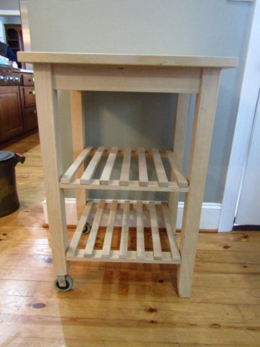 Portable Wooden Kitchen Island- Choice #2 of 3 (Pantry). Wheels on one side for easy moving. Two shelves underneath for additional storage. Measures approx 23" x 19 1/2" x 33 1/2" tall. Butcher block style top is approx 7/8" thick.