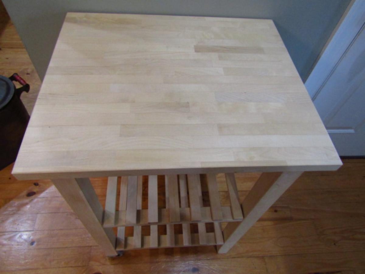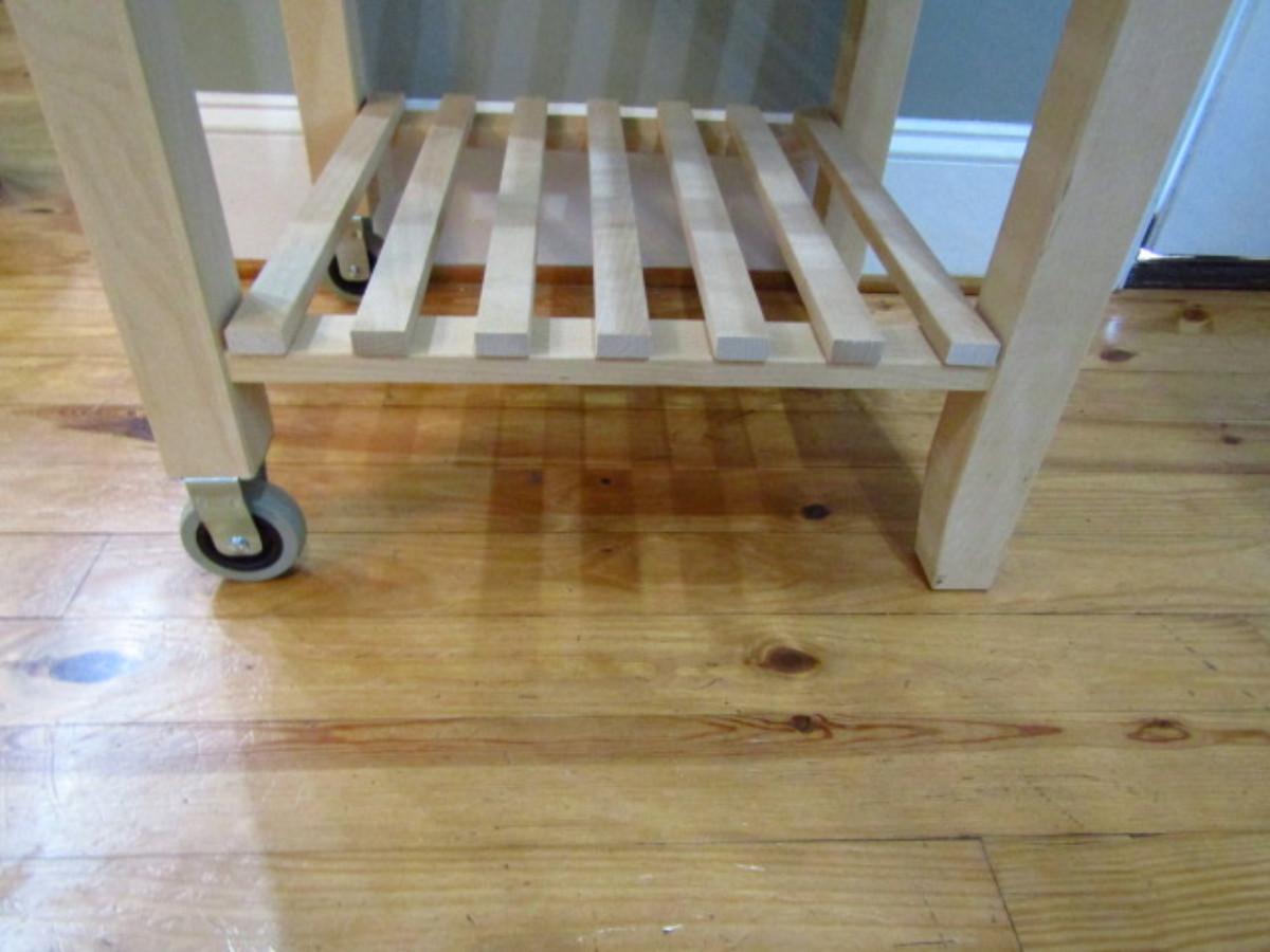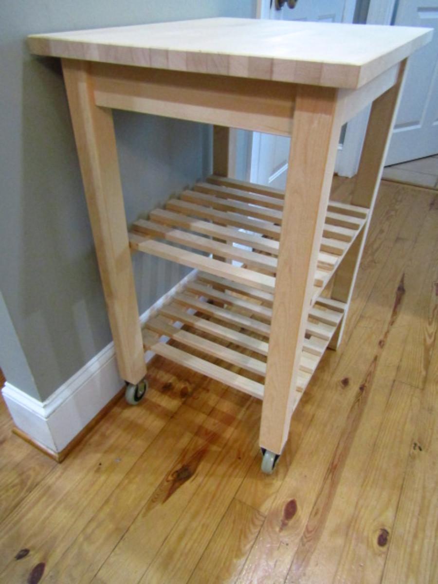Portable Wooden Kitchen Island- Choice #3 of 3 (Pantry). Wheels on one side for easy moving. Two shelves underneath for additional storage. Measures approx 23" x 19 1/2" x 33 1/2" tall. Butcher block style top is approx 7/8" thick.