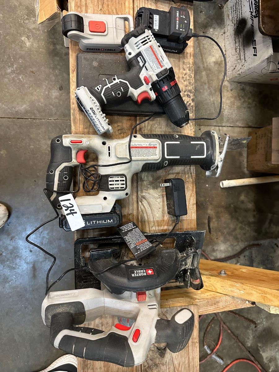 PORTER CABLE CORDLESS TOOL SET INCLUDES DRILL, CIRCULAR SAWZALL, INCLUDES 2 BATTERIES/CHARGER