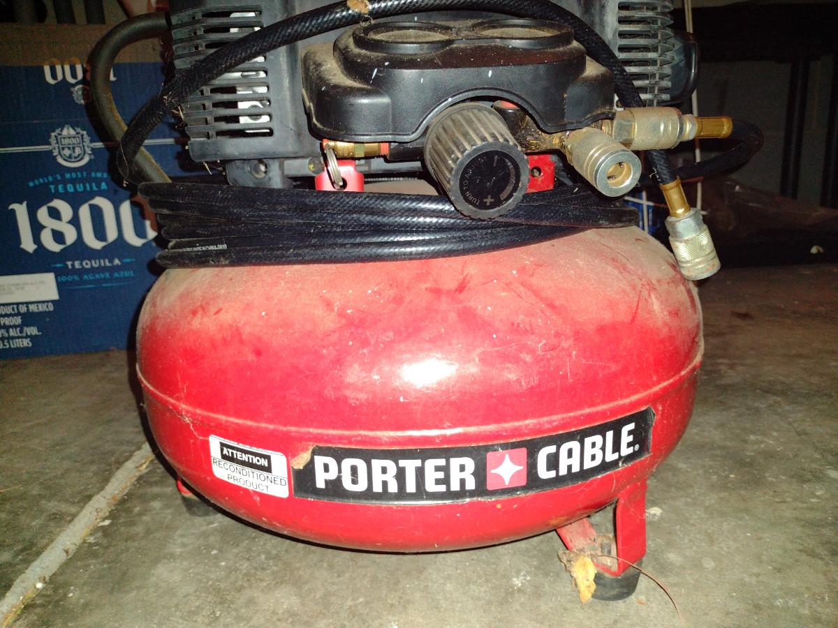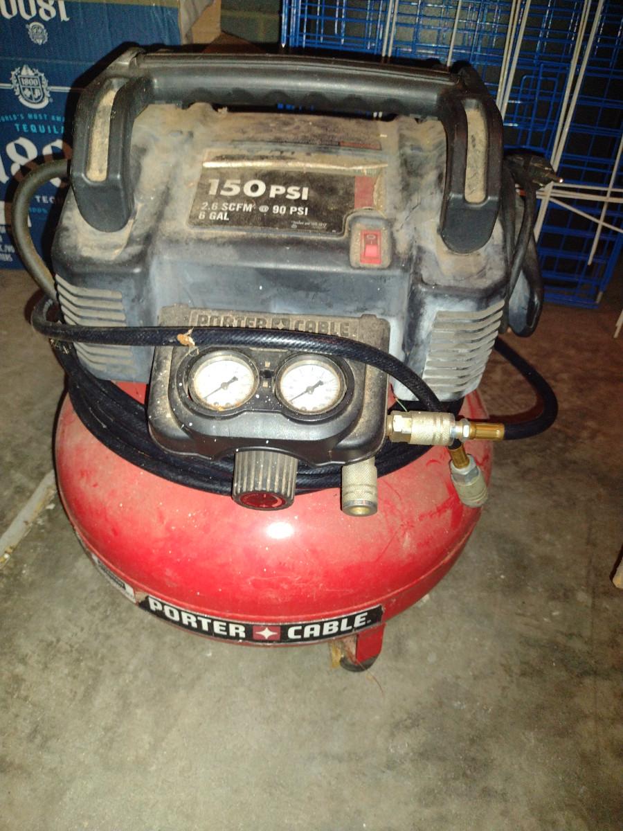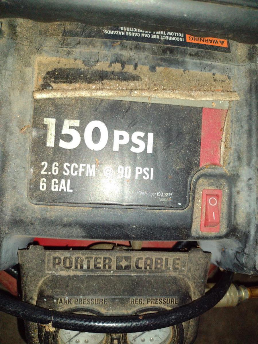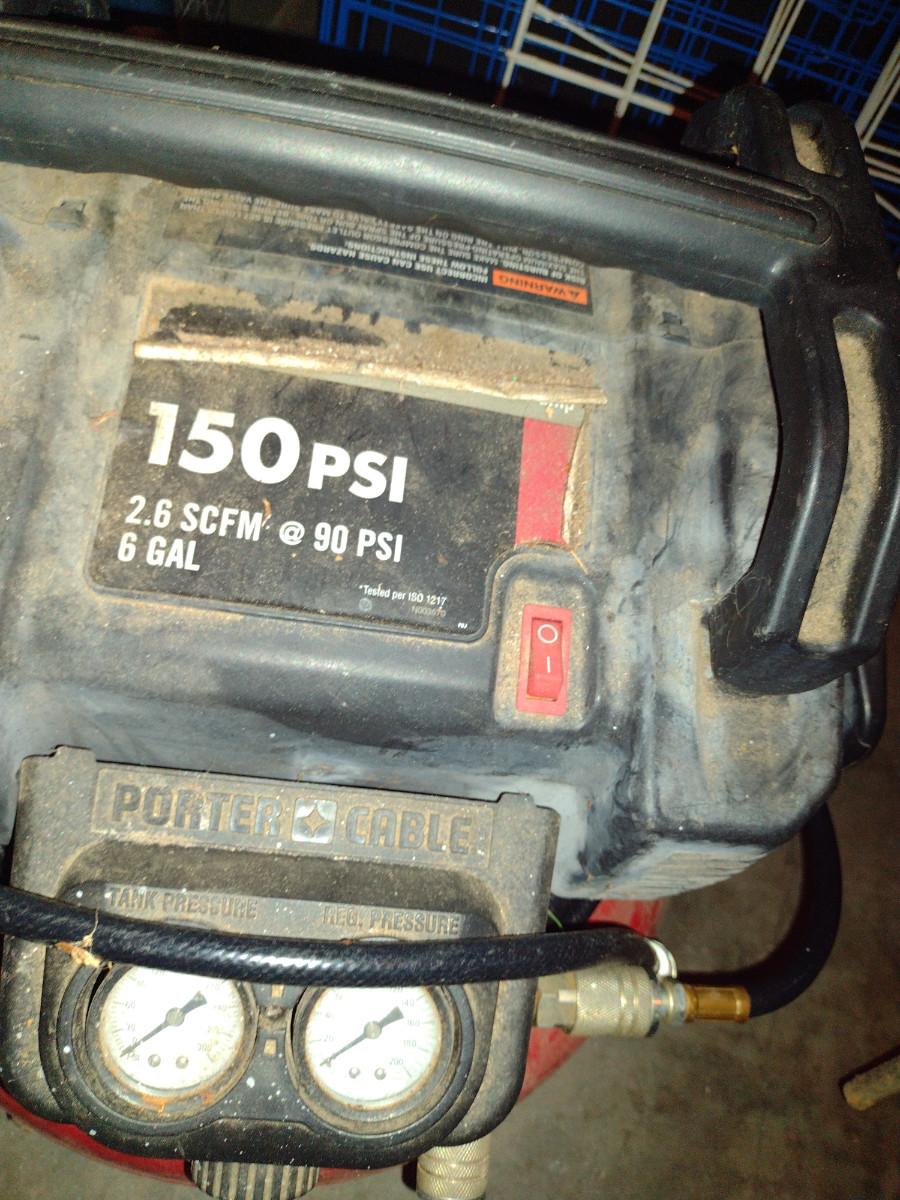 Porter Cable 150 PSI, 6 Gallon Portable Air Compressor. Item powers on.