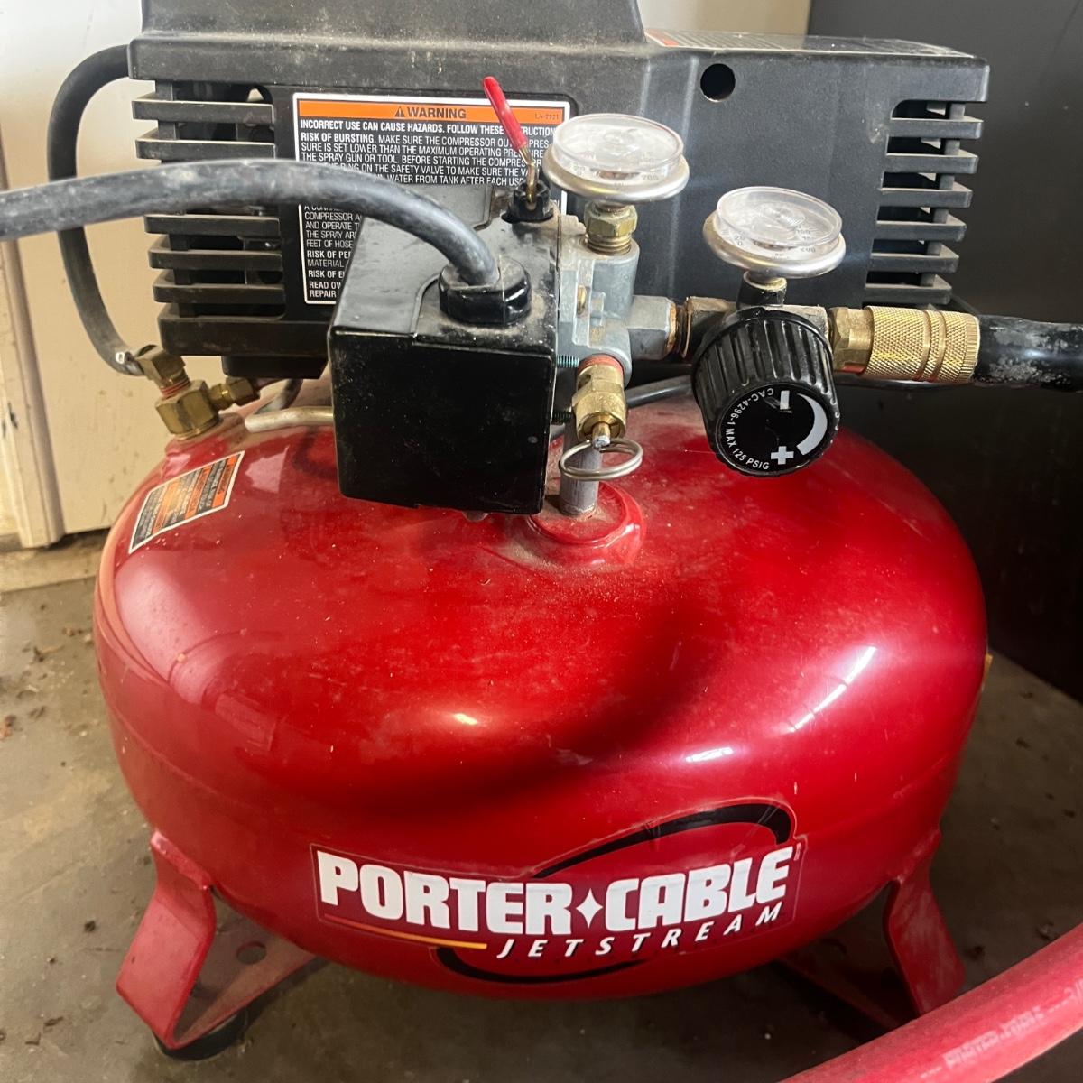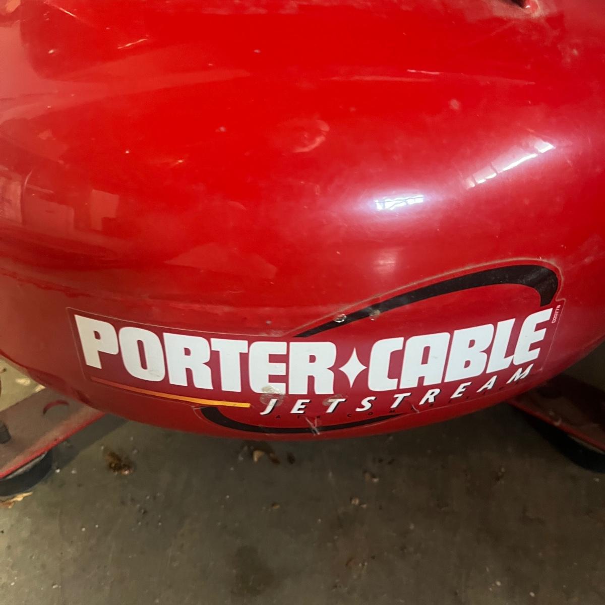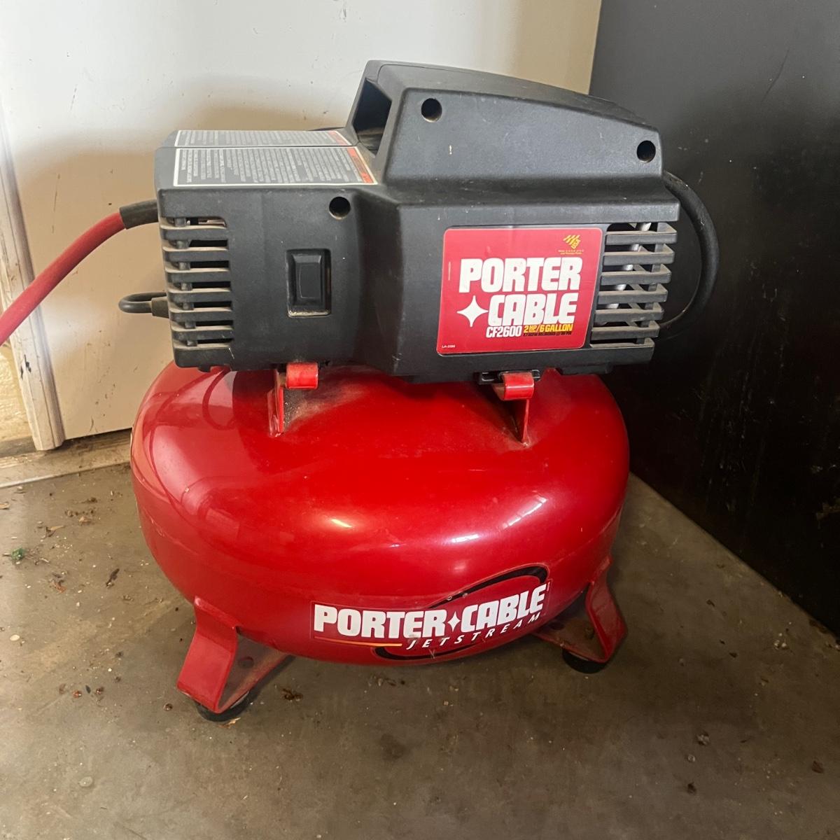 Lot includes a Porter Cable 6 gallon air compressor with air hose and a few accessories. Compressor powered on when plugged in. Compressor measures 16”D x 17”H.