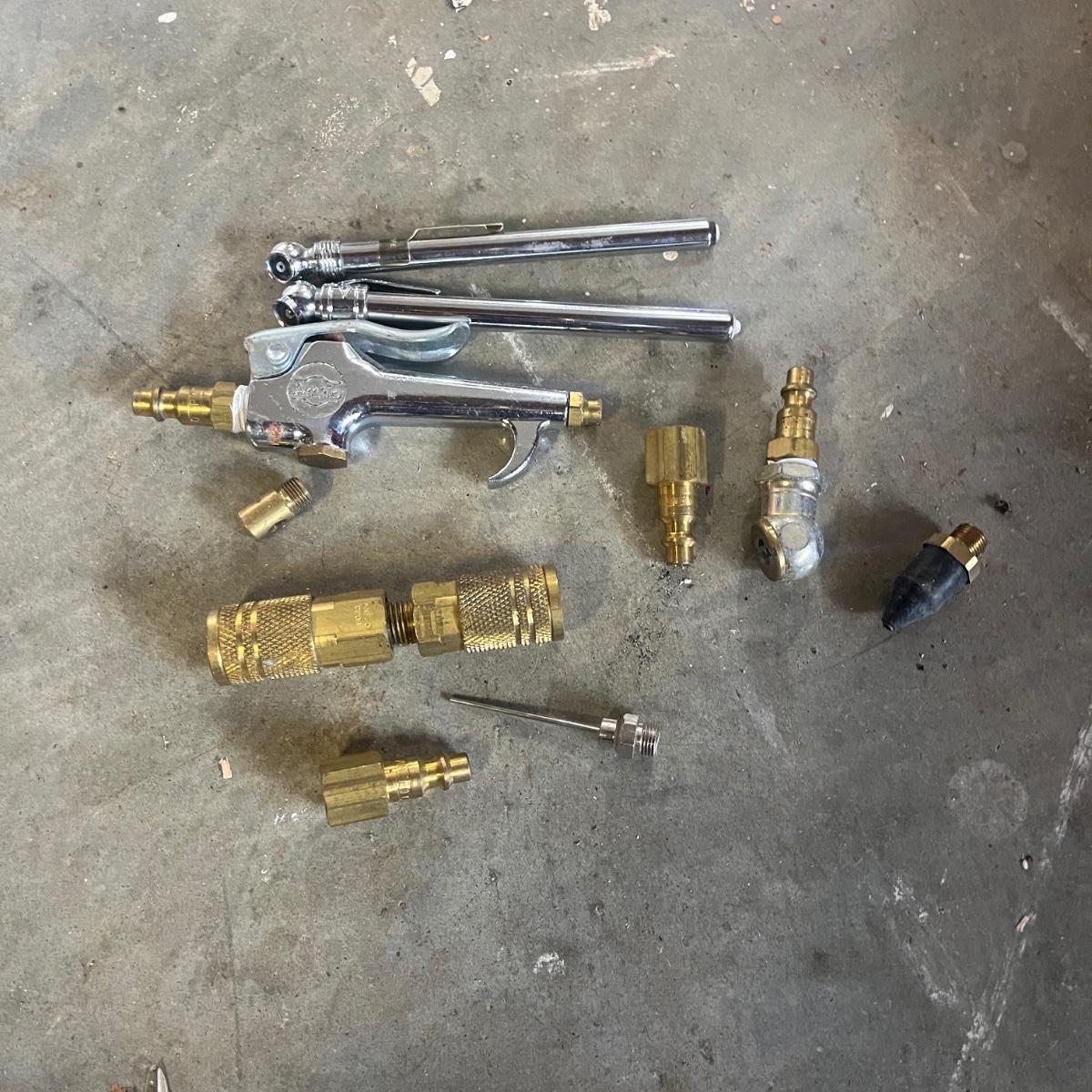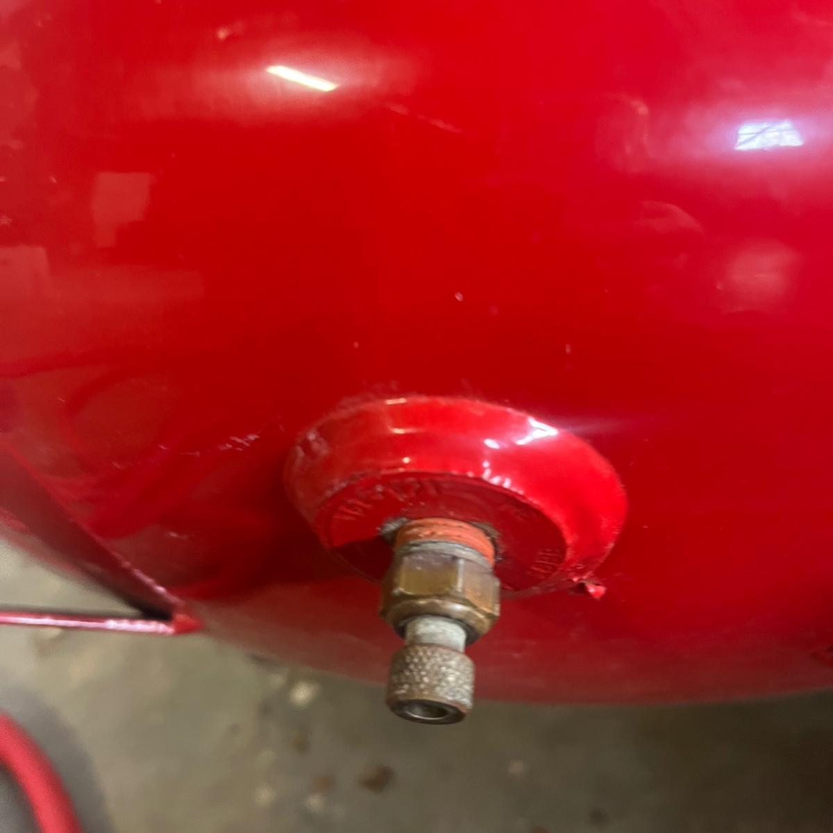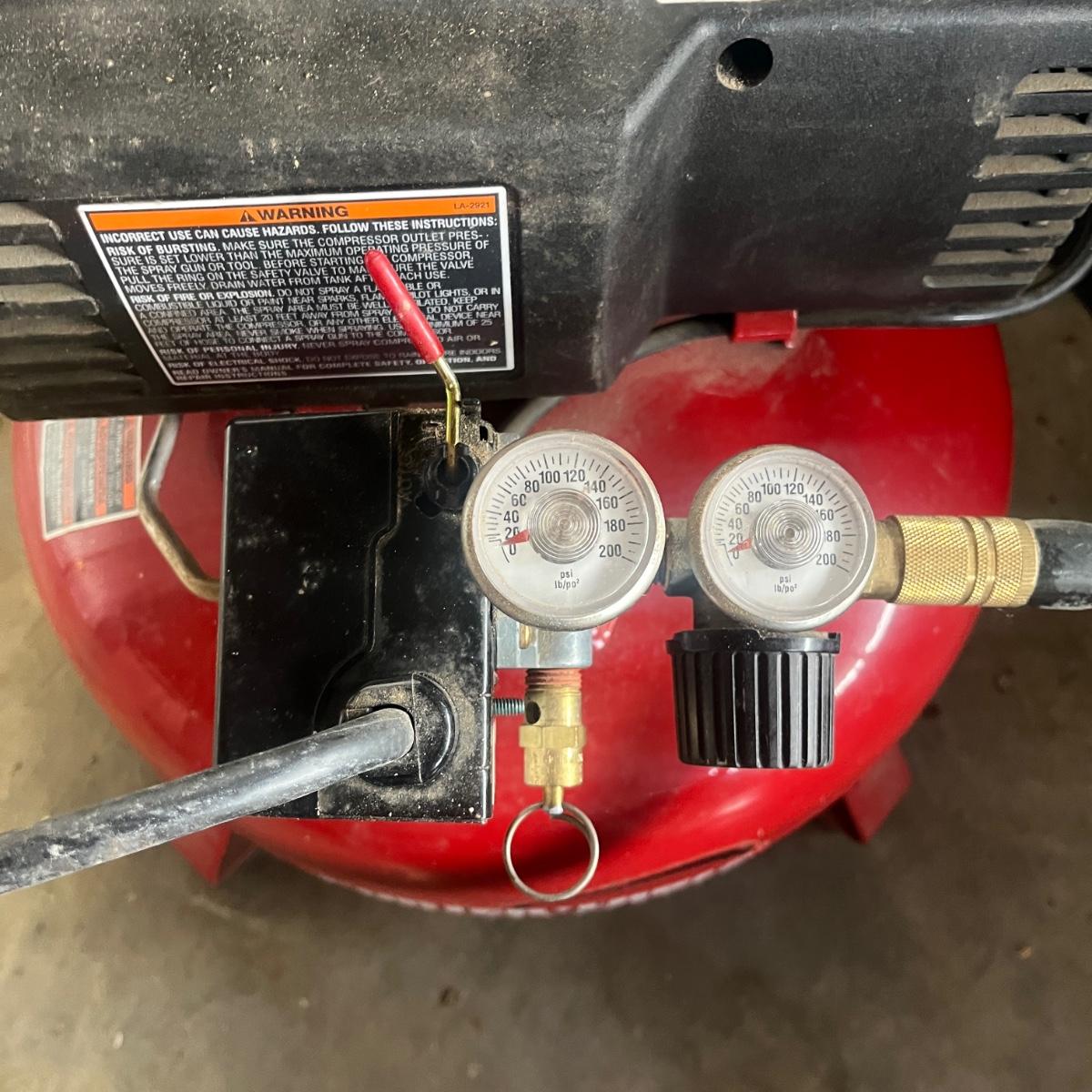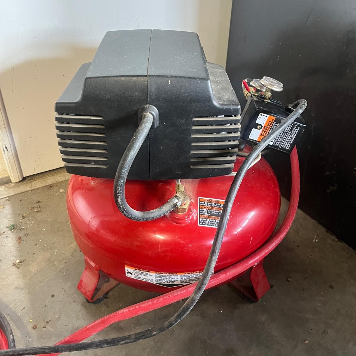 Lot includes a Porter Cable 6 gallon air compressor with air hose and a few accessories. Compressor powered on when plugged in. Compressor measures 16”D x 17”H.