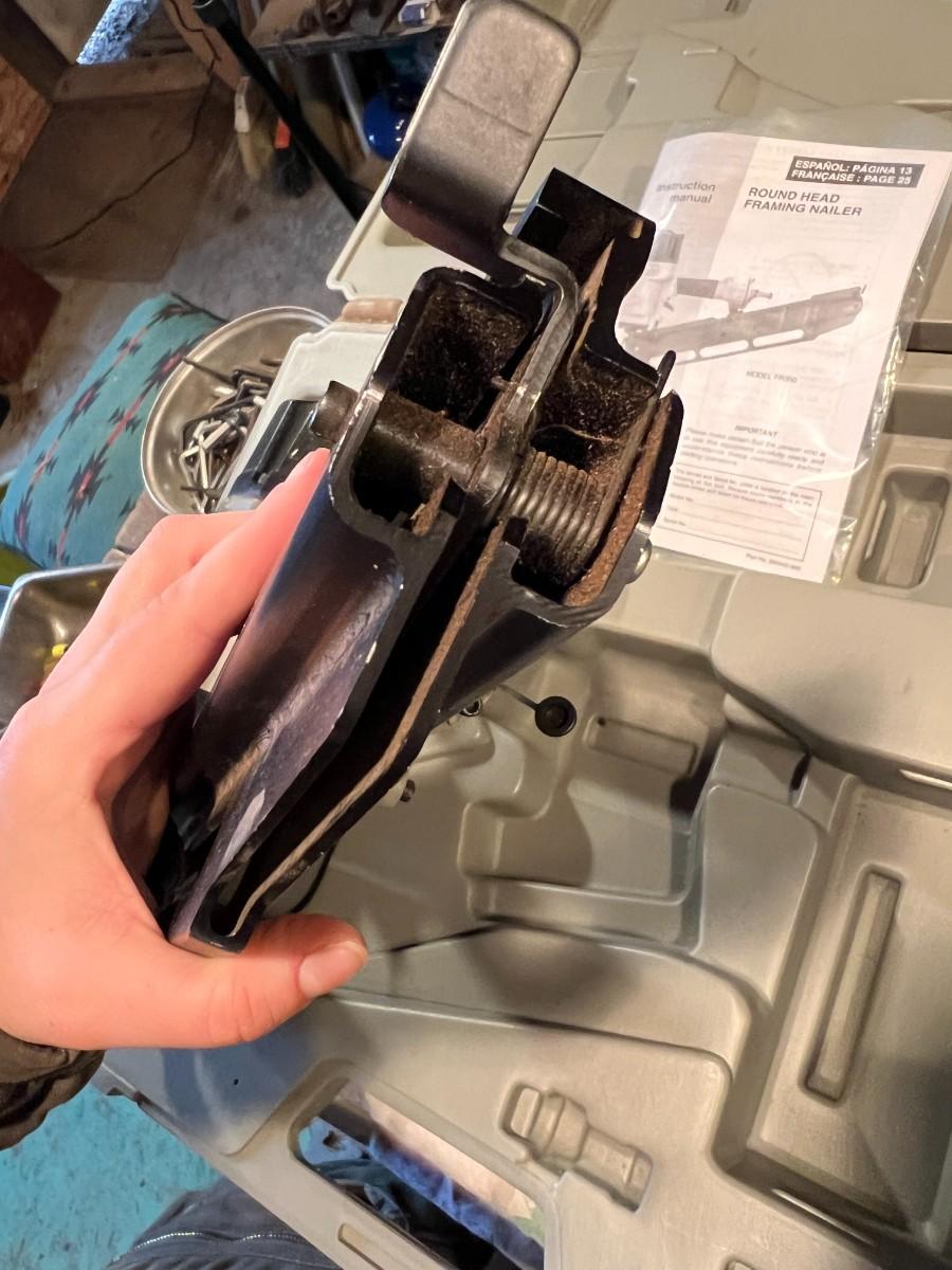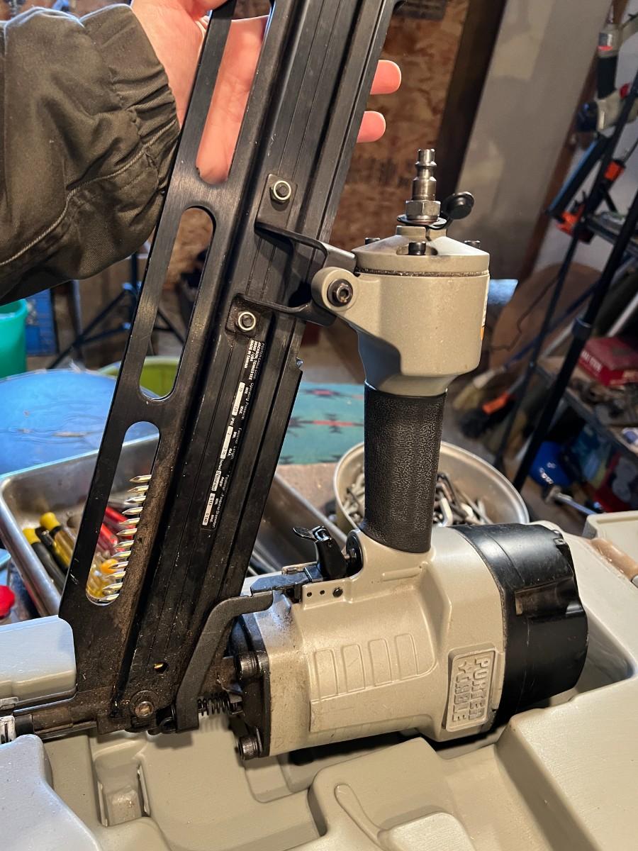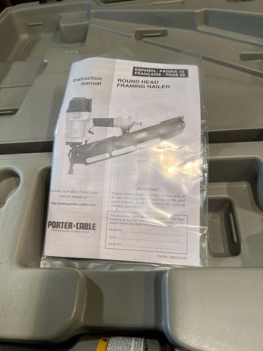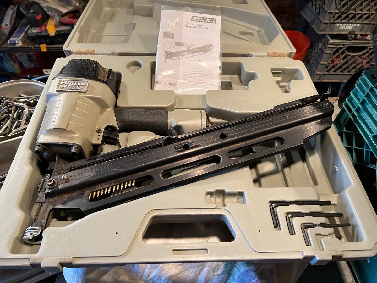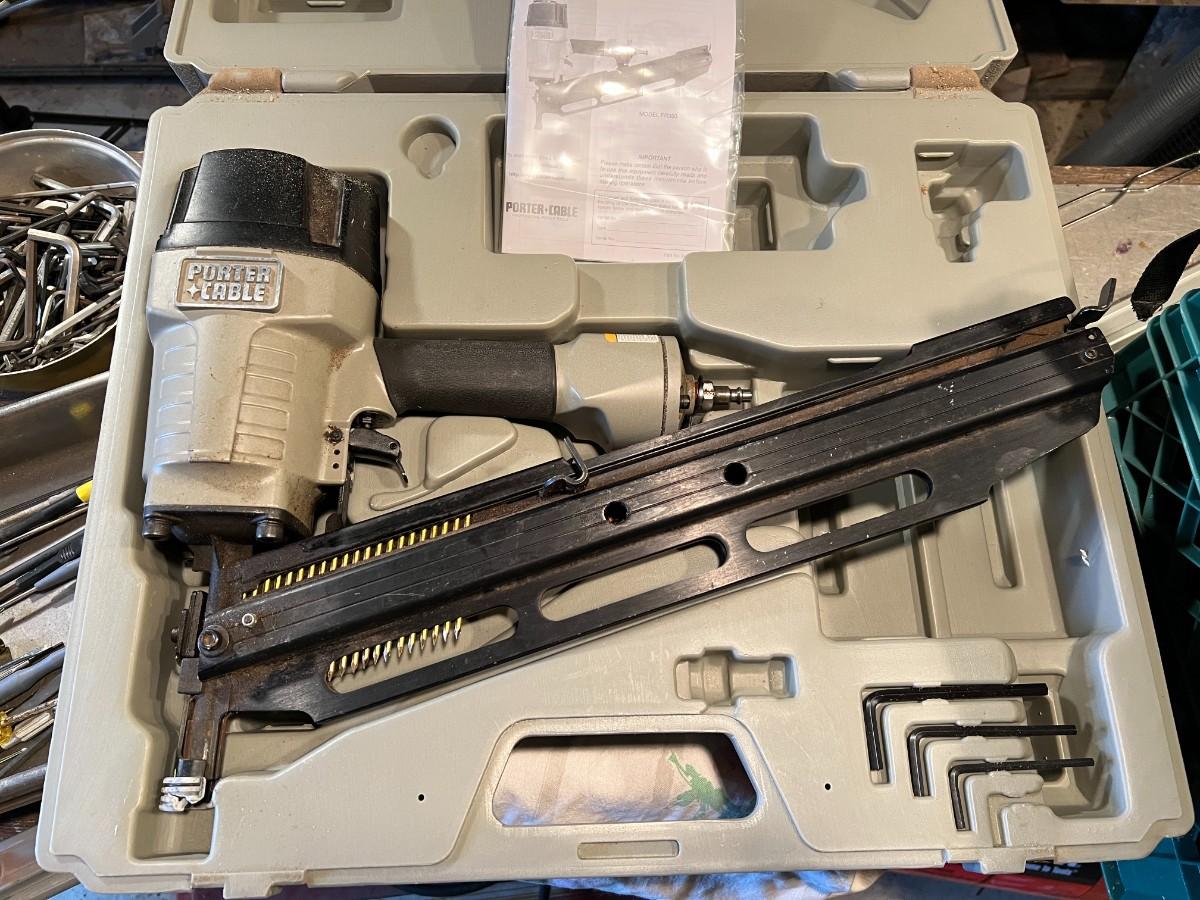 Porter Cable Nail Gun in Original Case with Manual. Condition as shown. From a Redmond estate where owner maintained their tools and equipment well, but we did not test this item ourselves. Includes case and all items shown inside case.