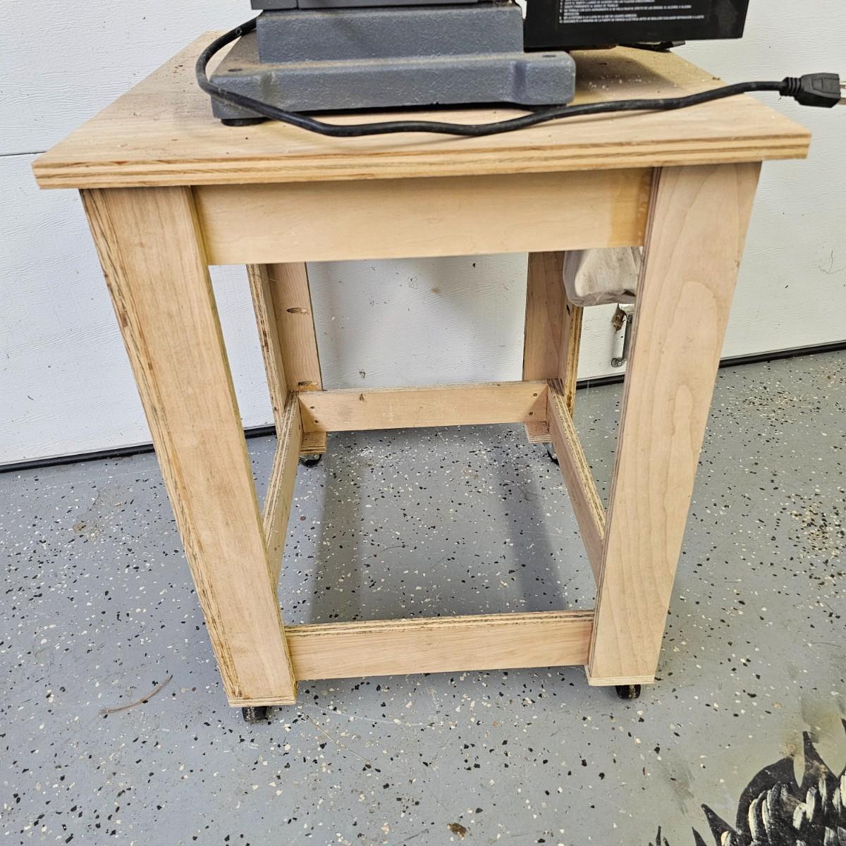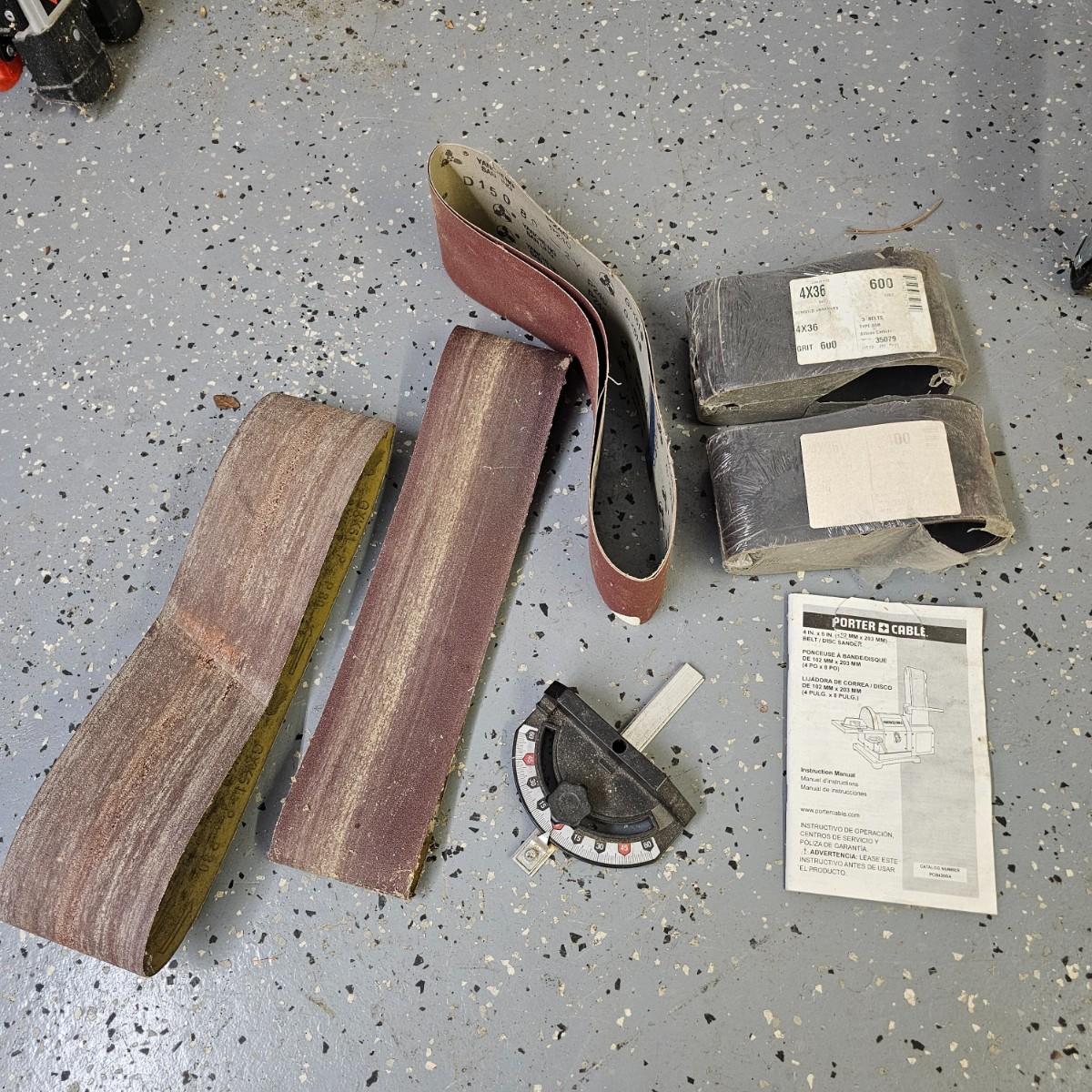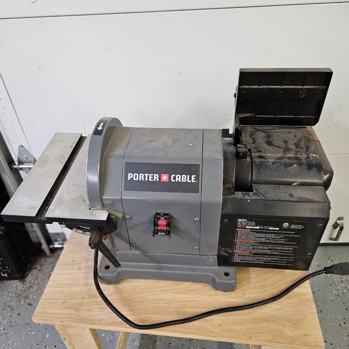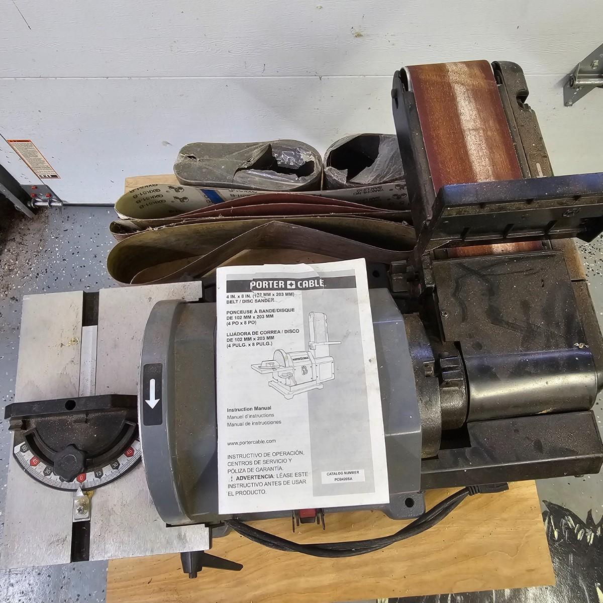 Compact table top model by Porter Cable has 4" x 36" belt sander and 8"D disc sander. Adjustable tables for bevel sanding plus extra belts and manual. Unit sits on homemade rolling stand, measures 23.5" x 21" x 42"H. See photos for details. Local pickup only.