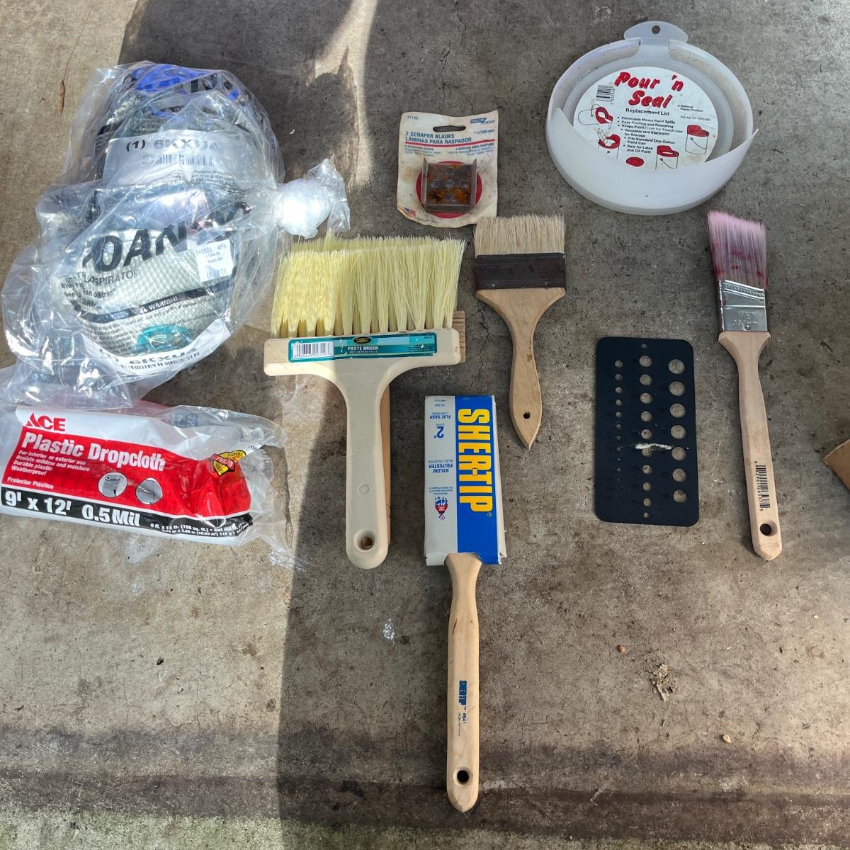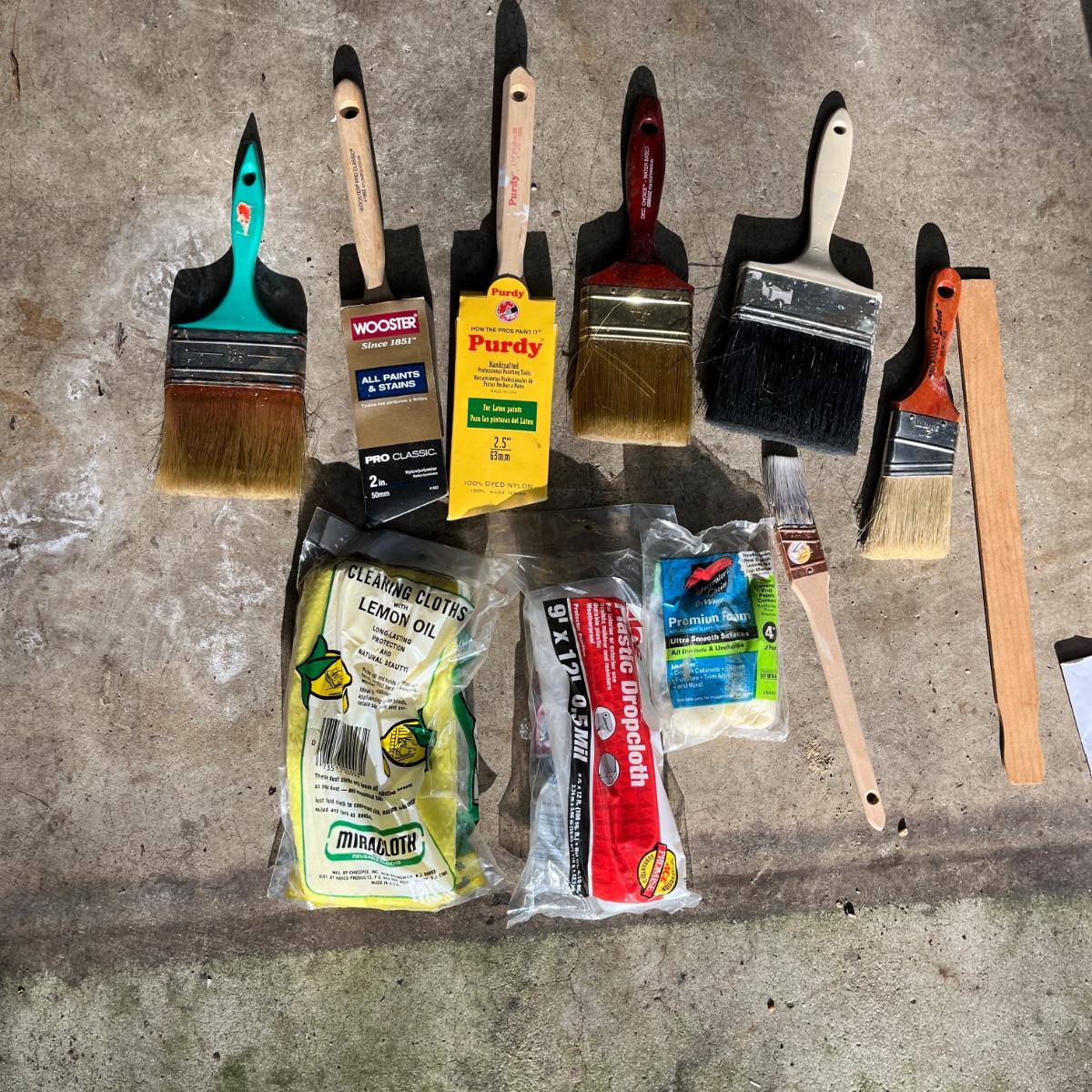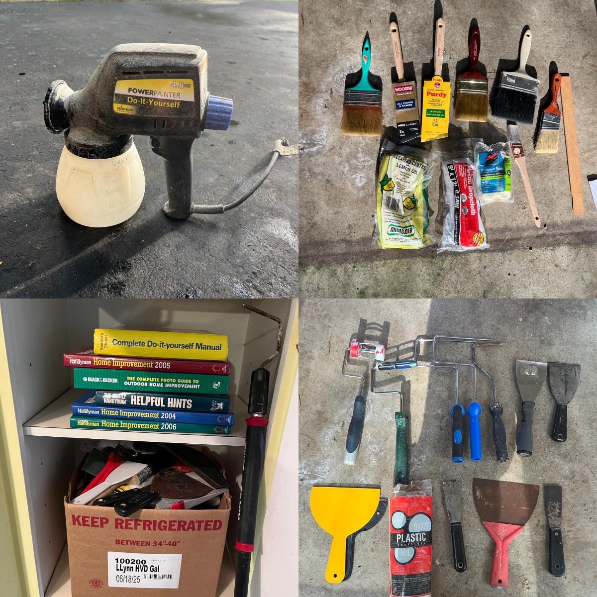 Lot includes a Porter Power Painter, panting books, Wooster and Purdy brushes, rollers, plastic sheeting and more.