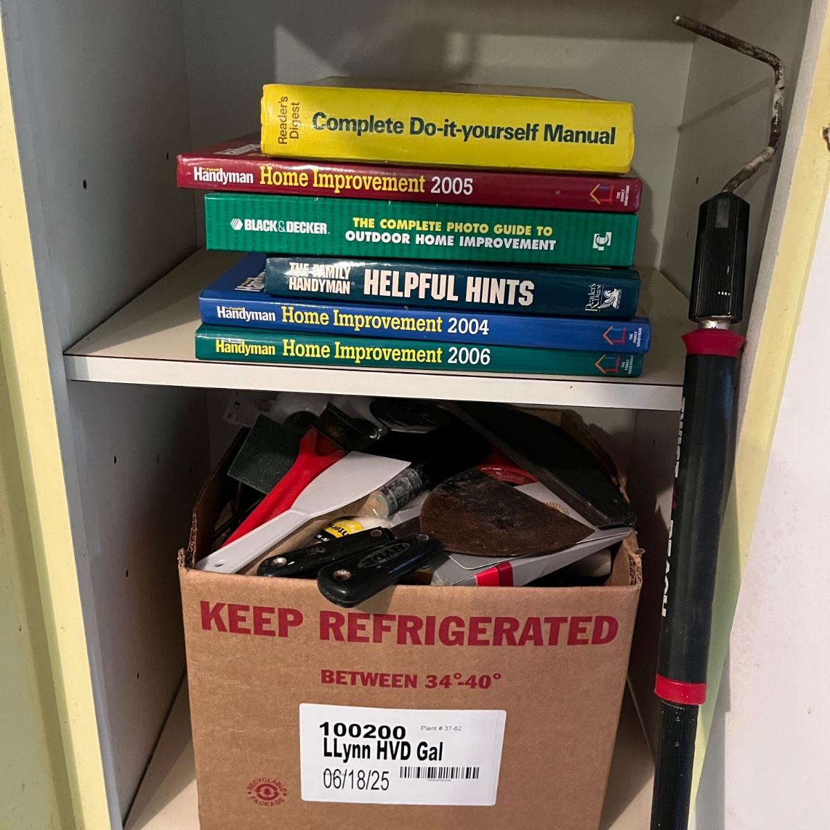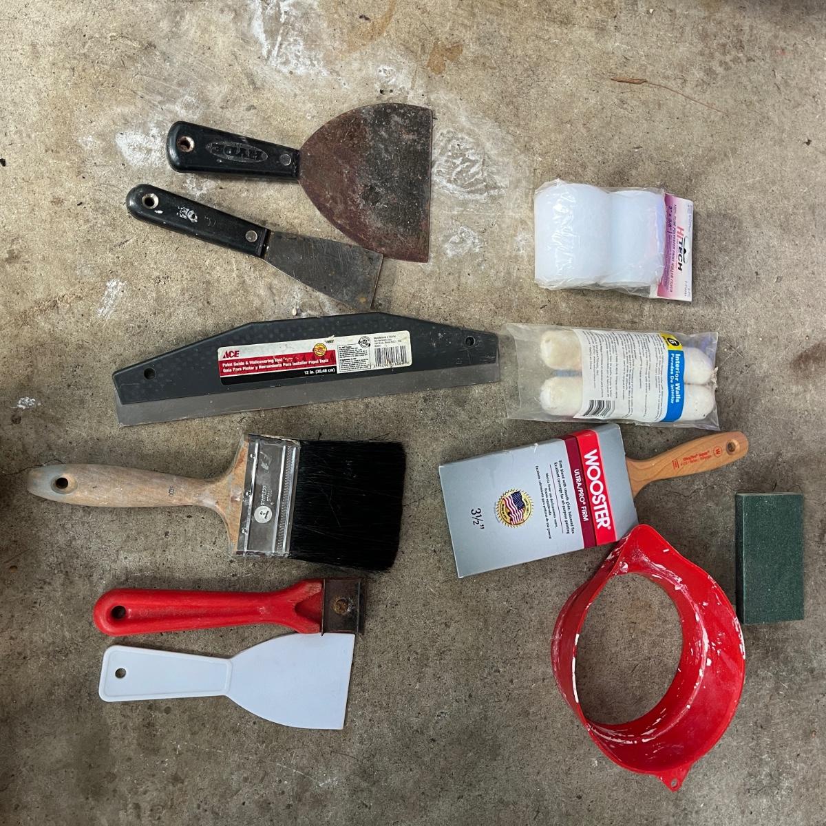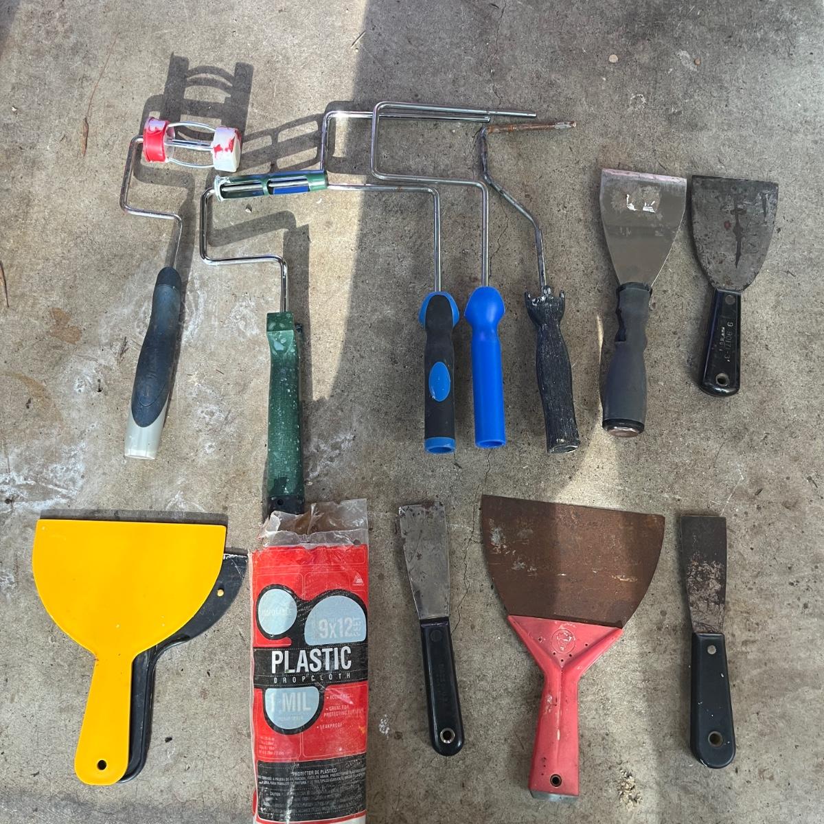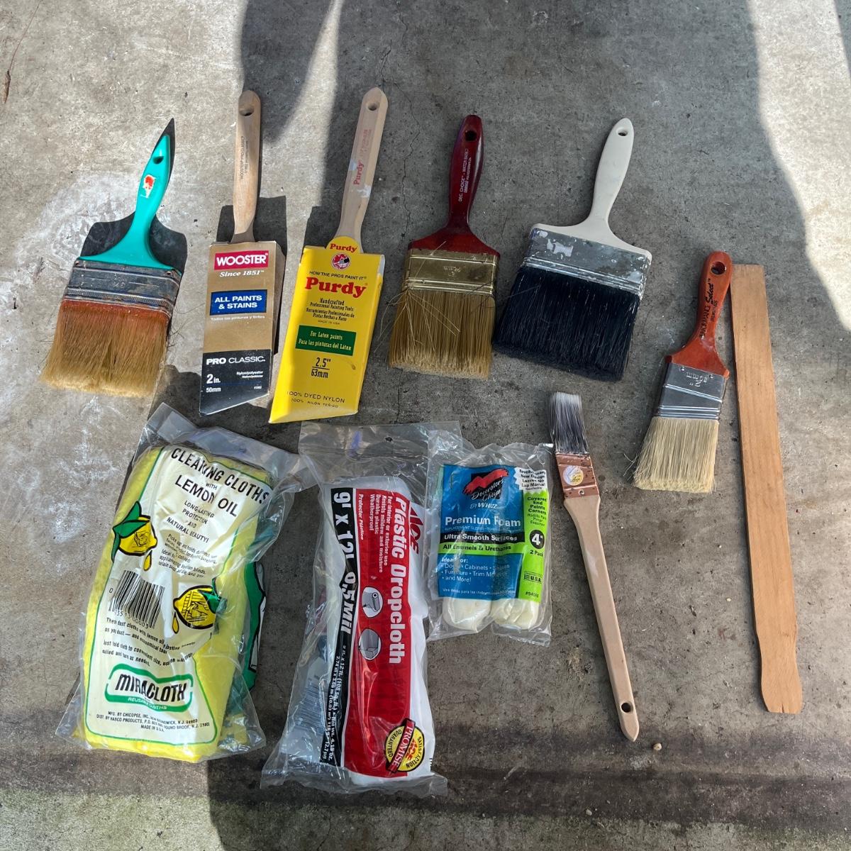 Lot includes a Porter Power Painter, panting books, Wooster and Purdy brushes, rollers, plastic sheeting and more.