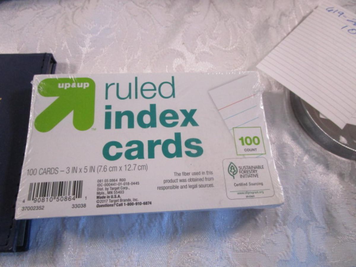 Like new, zippered portfolio is vinyl 10" x 13-1/2" wide, memo pads have covers 4-1/2 x 2-7/8", tablet is 2-1/2 x 3-1/4", 100 new ruled index cards 3" x 5"