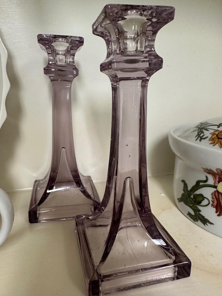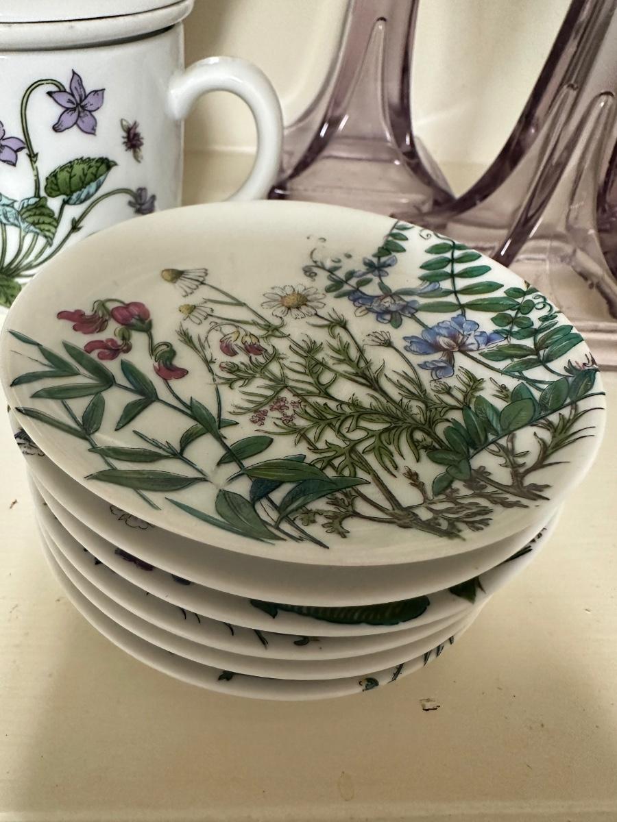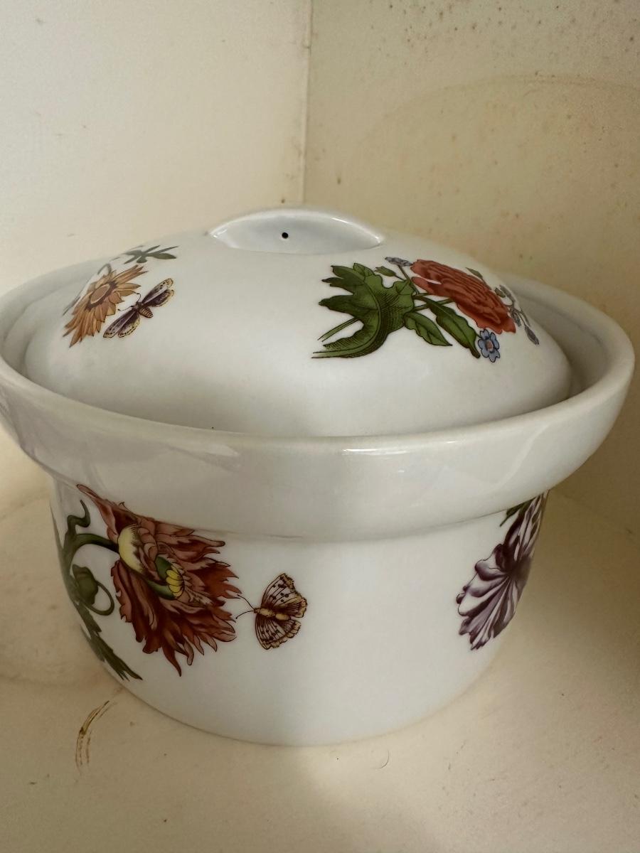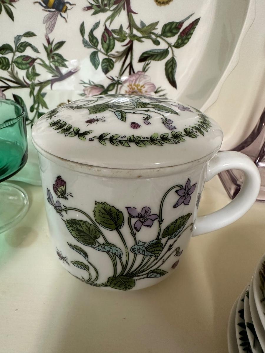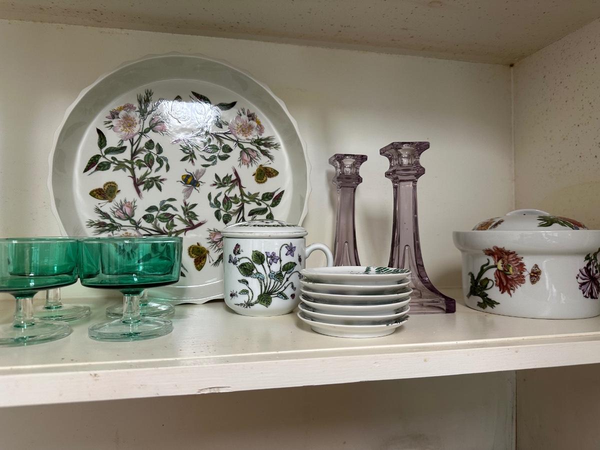 PORTMEIRION THE BOTANIC GARDEN QUICHE DISH, KAISER BUTTER DISHES, PURPLE CANDLESTICKS, DESSERT CUPS CORDON BLEU SM BAKING DISH