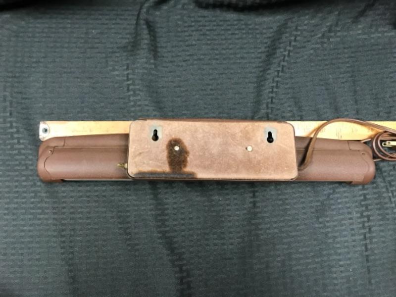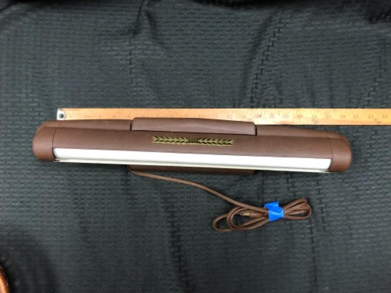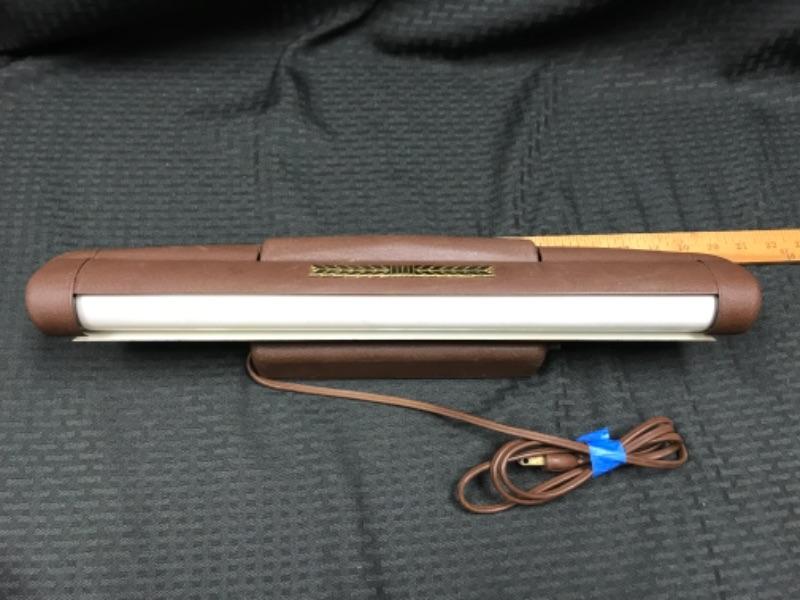 Fluorescent, wall-mounted light for illuminating wall art, such as paintings or portraits. Dark brown metal housing, push-button on-off switch on side of housing. Dark brown cord: