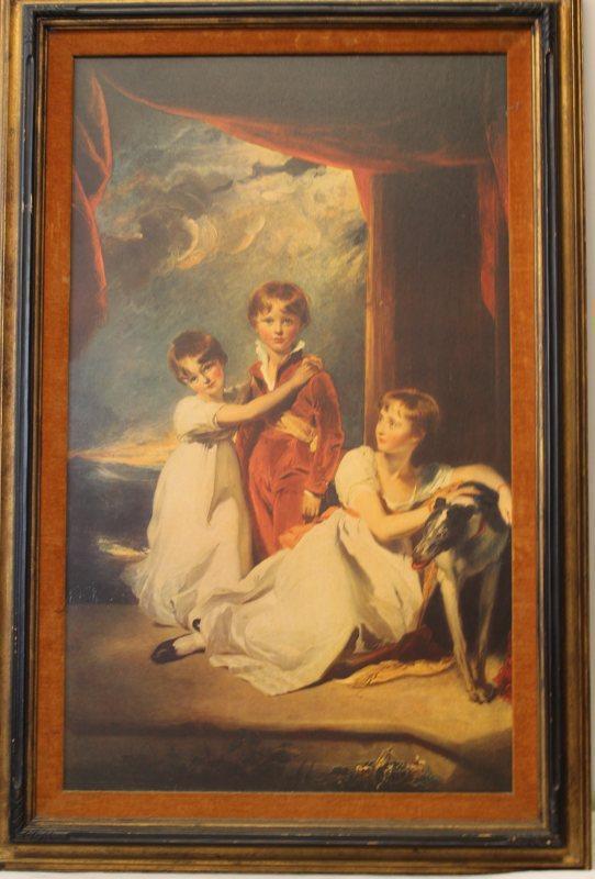 Description: Portrait of a girl with children and house pet on oil style print. Measurement approximate: 39 H X 23.5 W framed 46.5 H X 31 W. Material: Oil style Print . Shipping cost $150 Excluding California, Alaska & Hawaii. This Item has a reserve price.