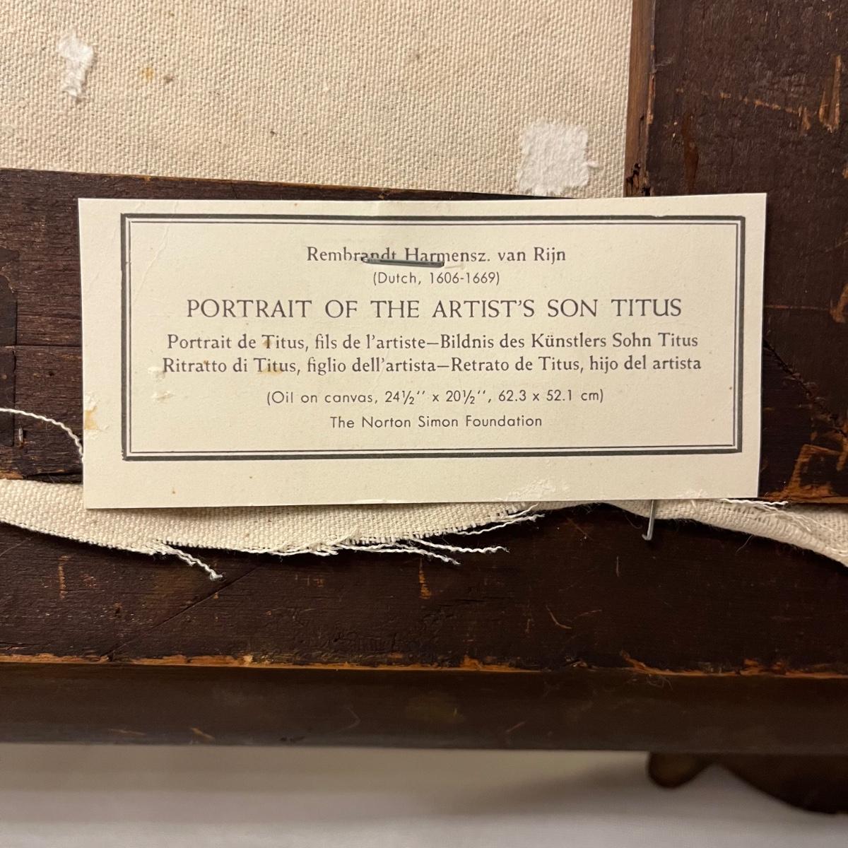 Lot includes a Portrait of the Artist’s Son print on canvas from the Norton Simon Foundation. The ornate gold colored wood frame has an intricate design.