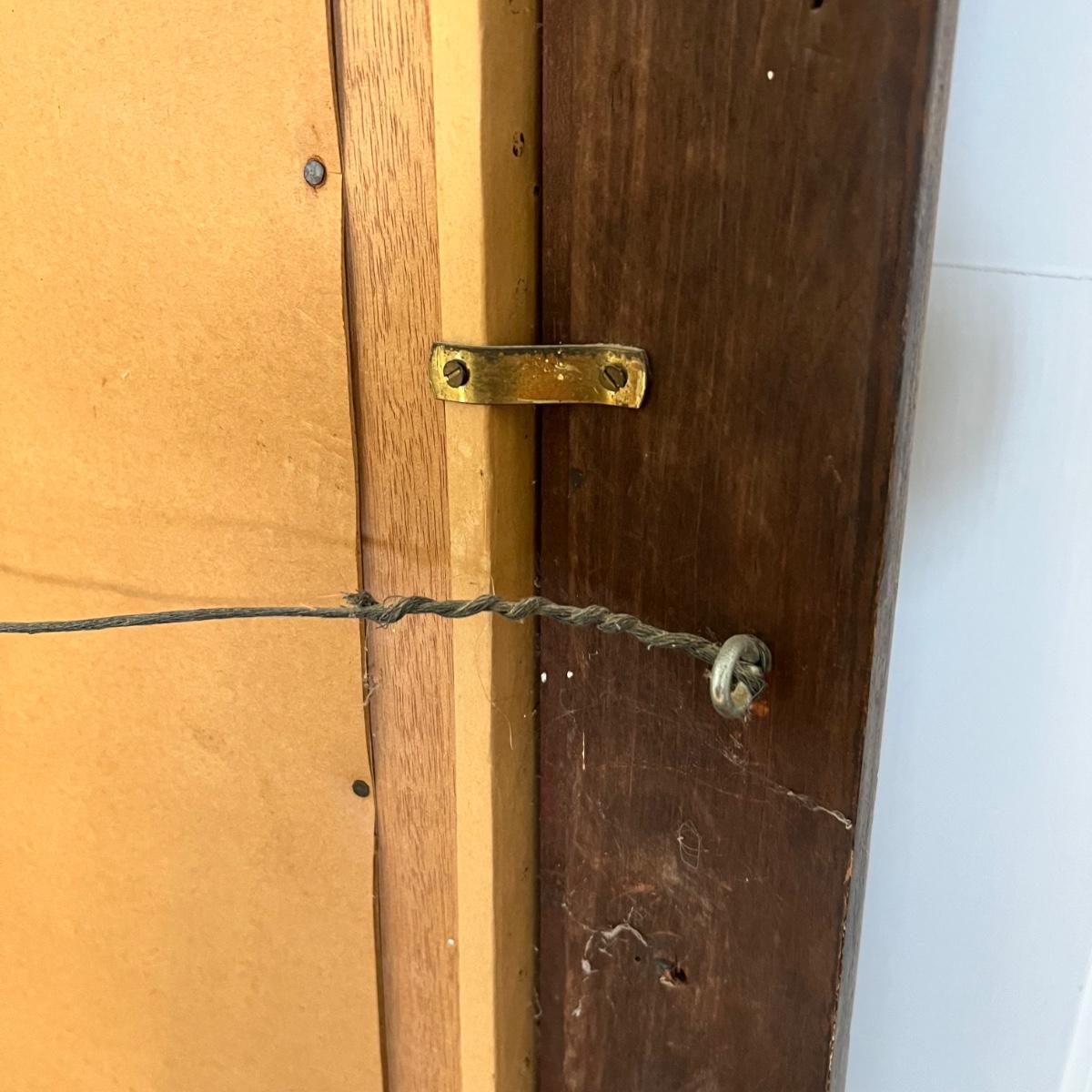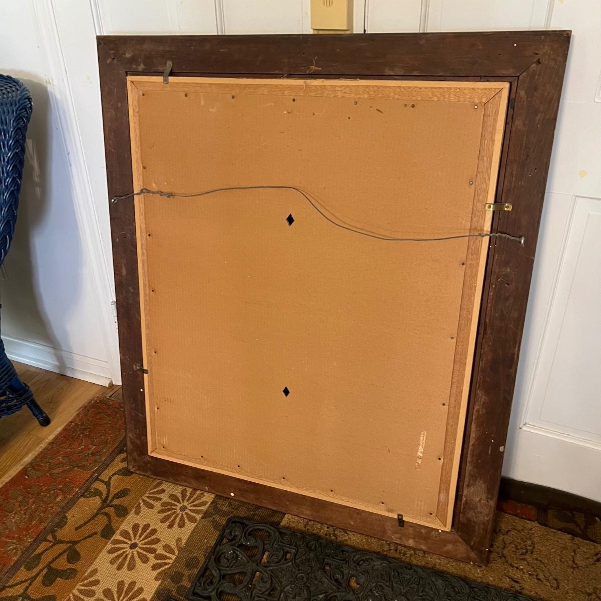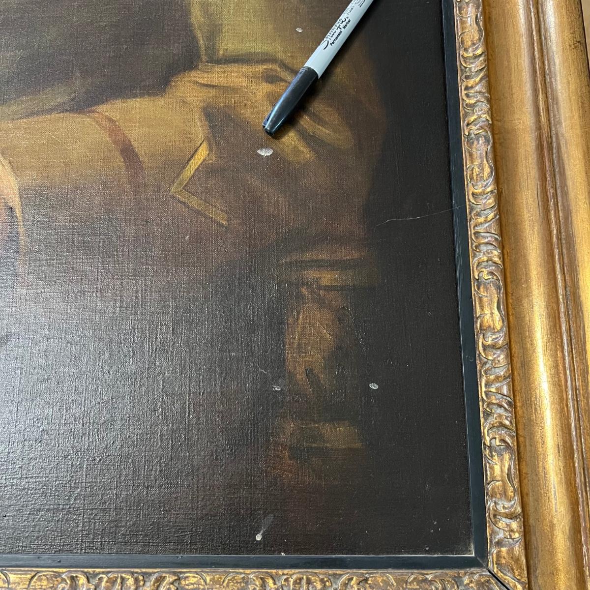This large oil painting is on canvas which is mounted (not under glass) in a large gilded frame. There are a few light colored blemishes shown in images and some minor cracking in the paint. It is not clear whether the marks could be removed. No identifying marks/signatures found.