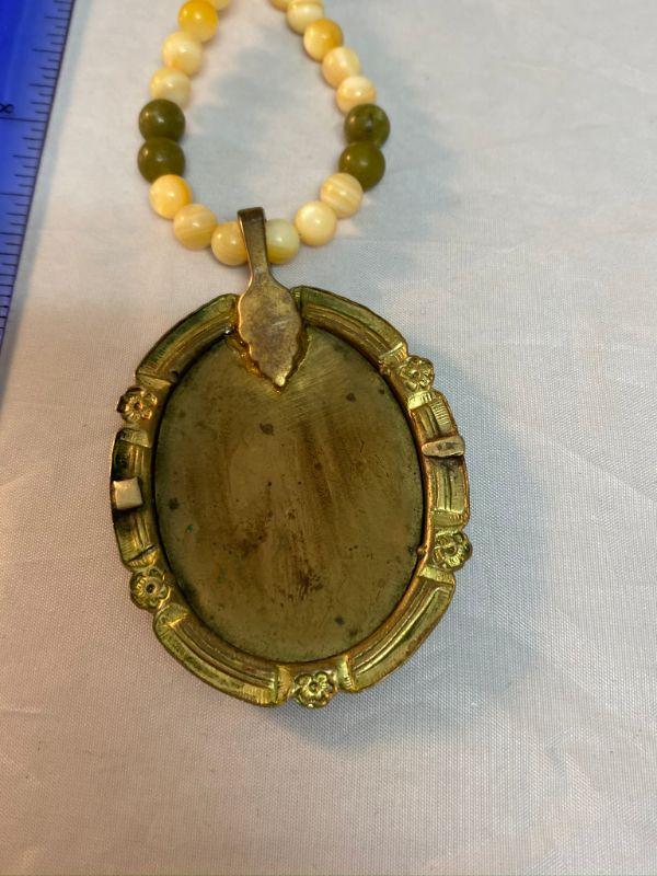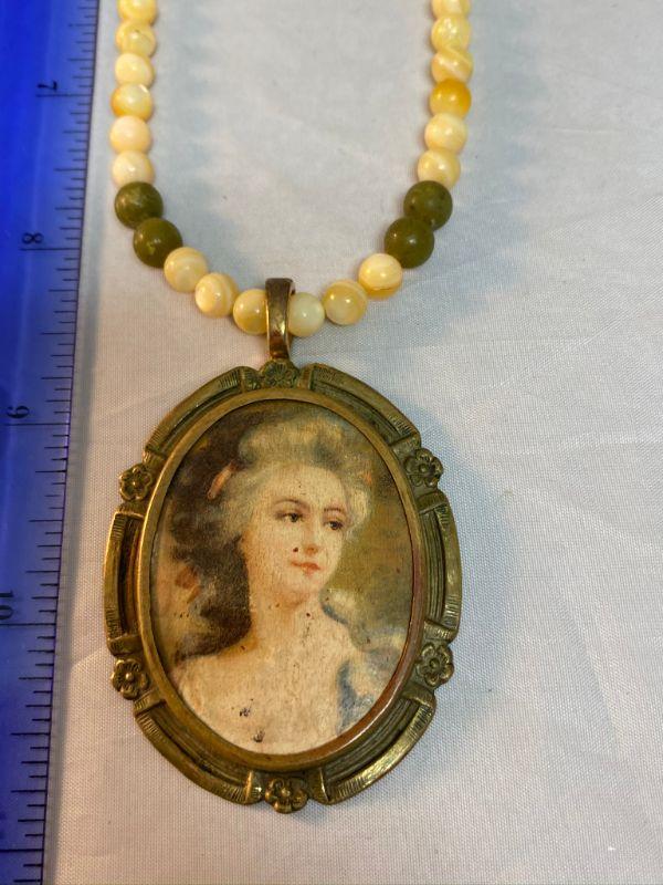 Victorian Style Portrait Pendant on a beaded necklace. Beads are polished stone.