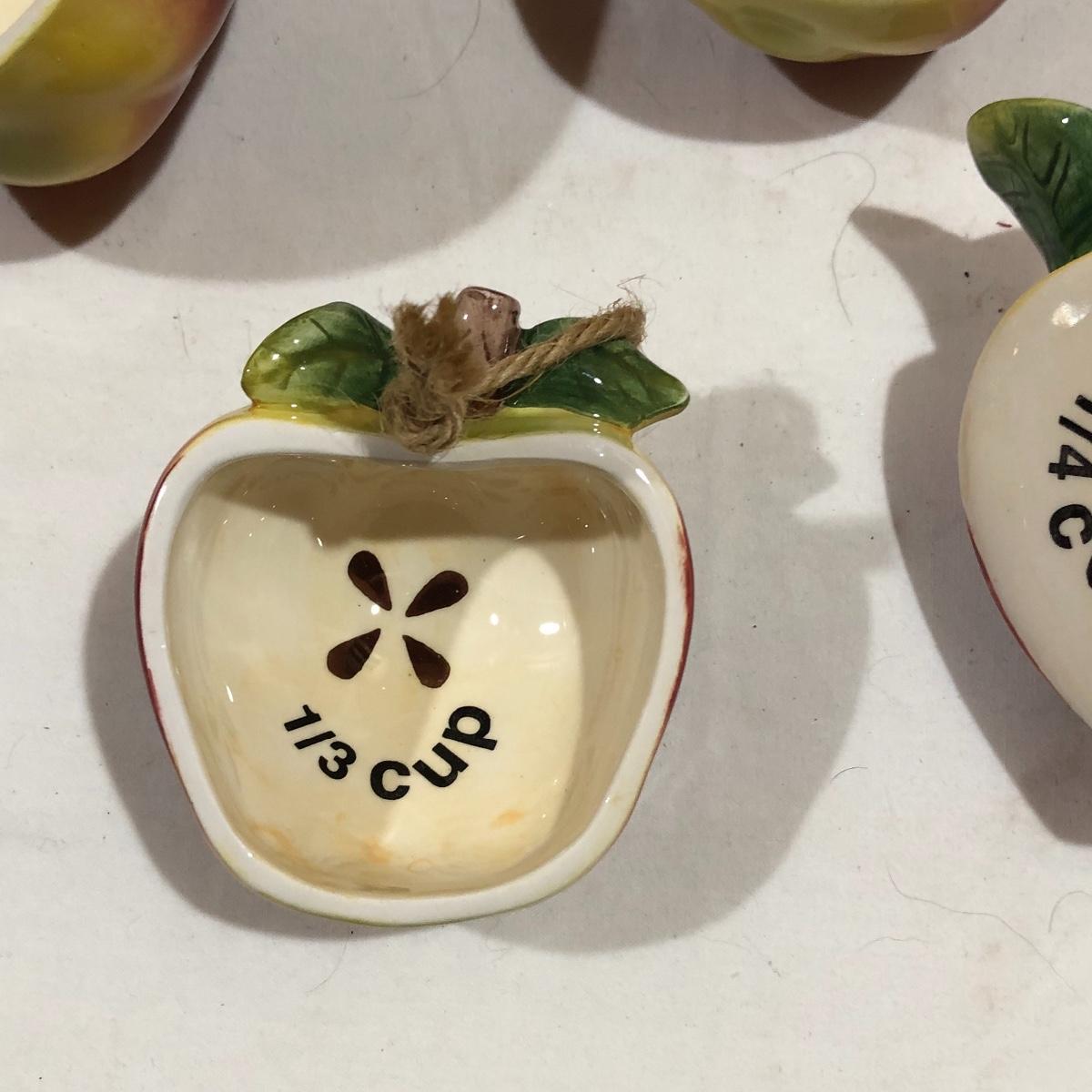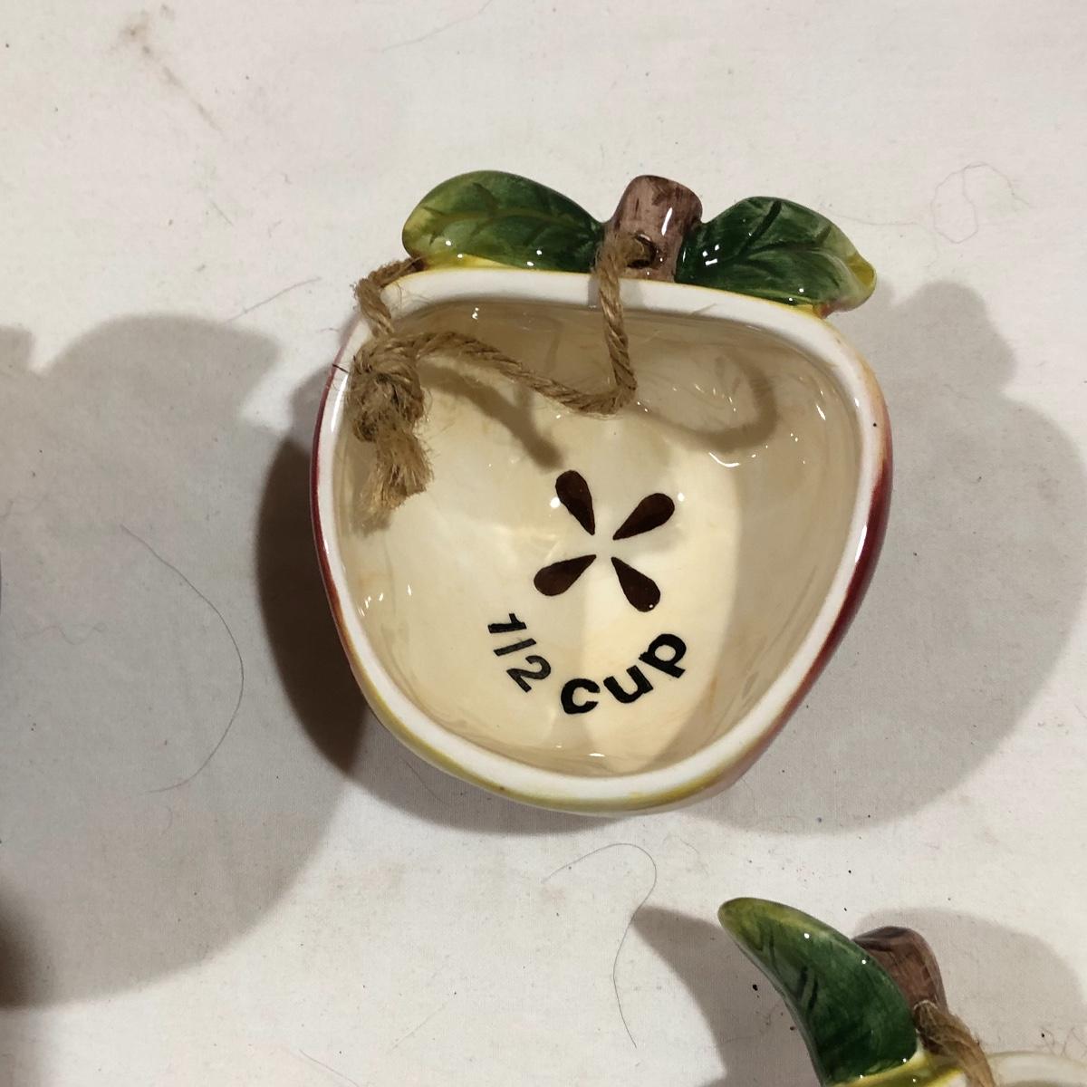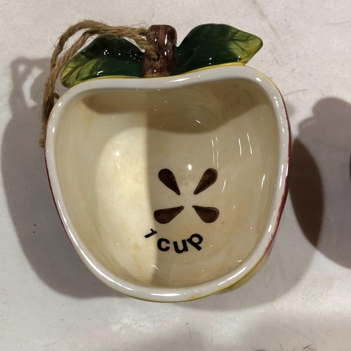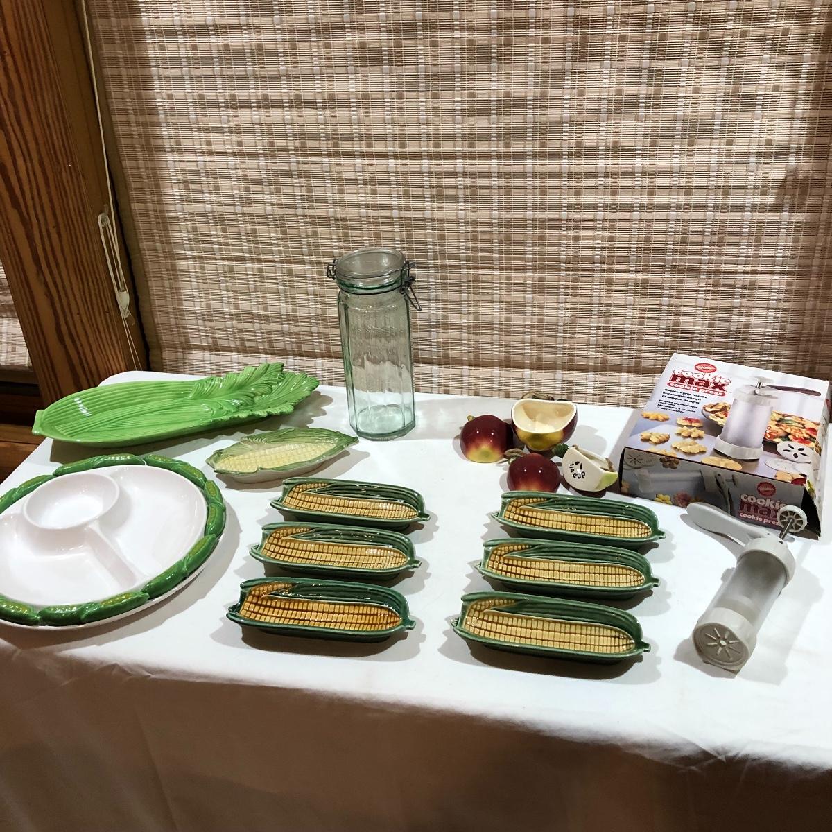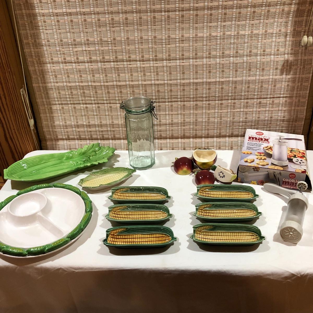 The Portuguese vegetable dishes are the celery dish (6.5” x 16.5”) marked Rosle 78, the oval pea appetizer dish (12.5” in diameter) marked A. Santos for Shafford and the seven corn on the cob trays, 6 marked Bordallo Pinheiro. Note one of the dishes is different than the other six. There are chips on the end of the celery dish and one small chip on the pea dish. The Hermetic spaghetti jar has a green glass bottom and is 10.5” tall and 4” in diameter. There is no ring seal. There is also a cookie max cookie press that looks as if it has never been used. And finally there are four apple measuring cups. Shipping Available.