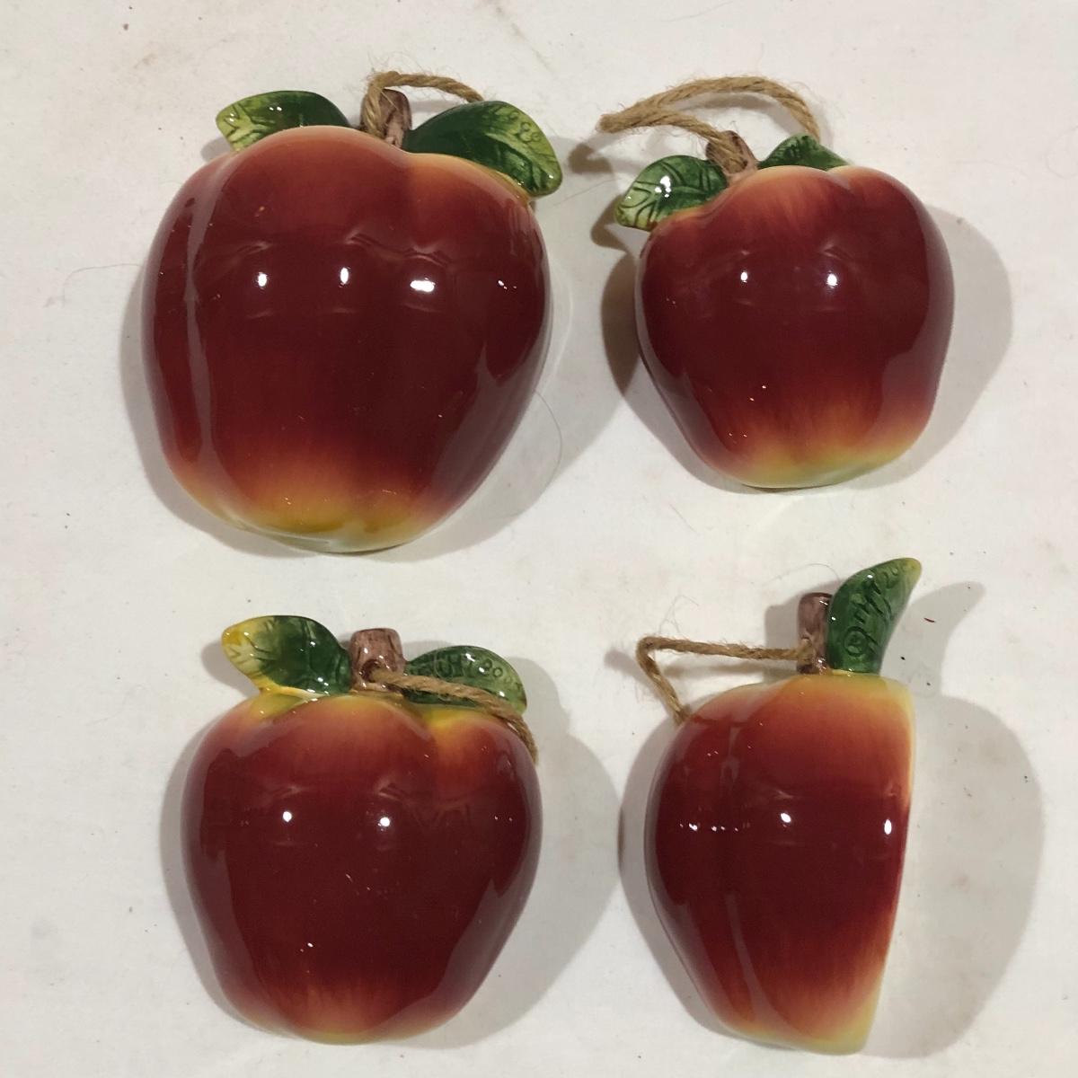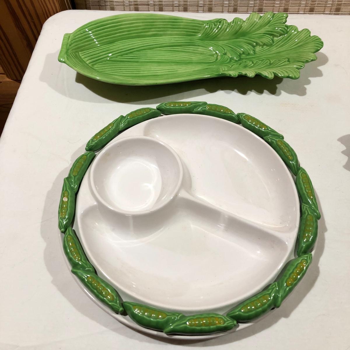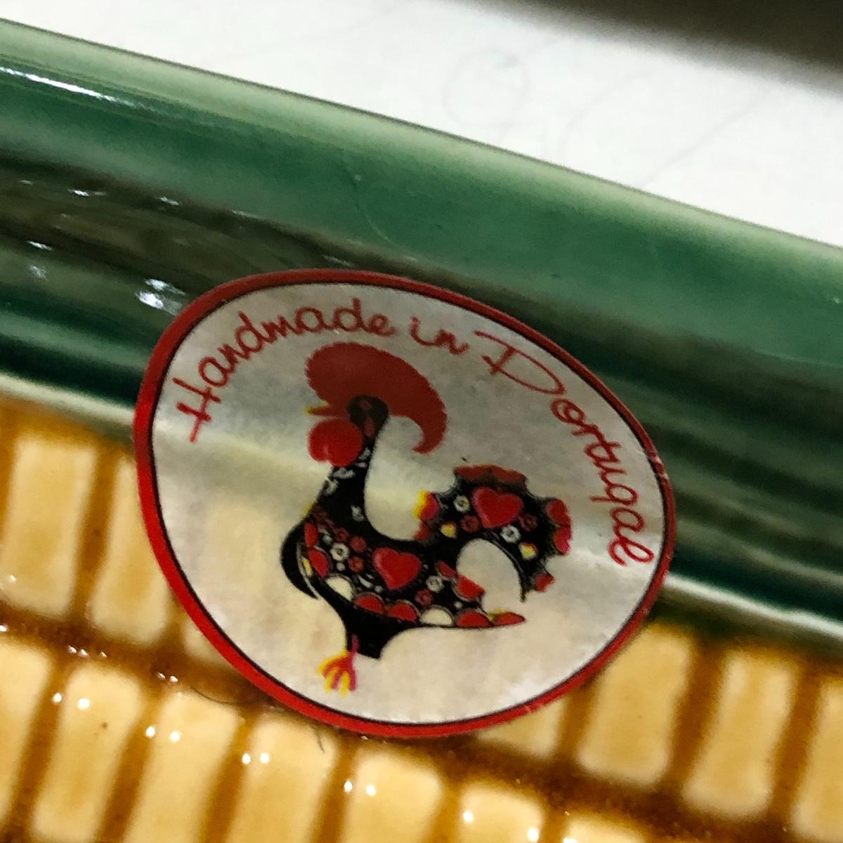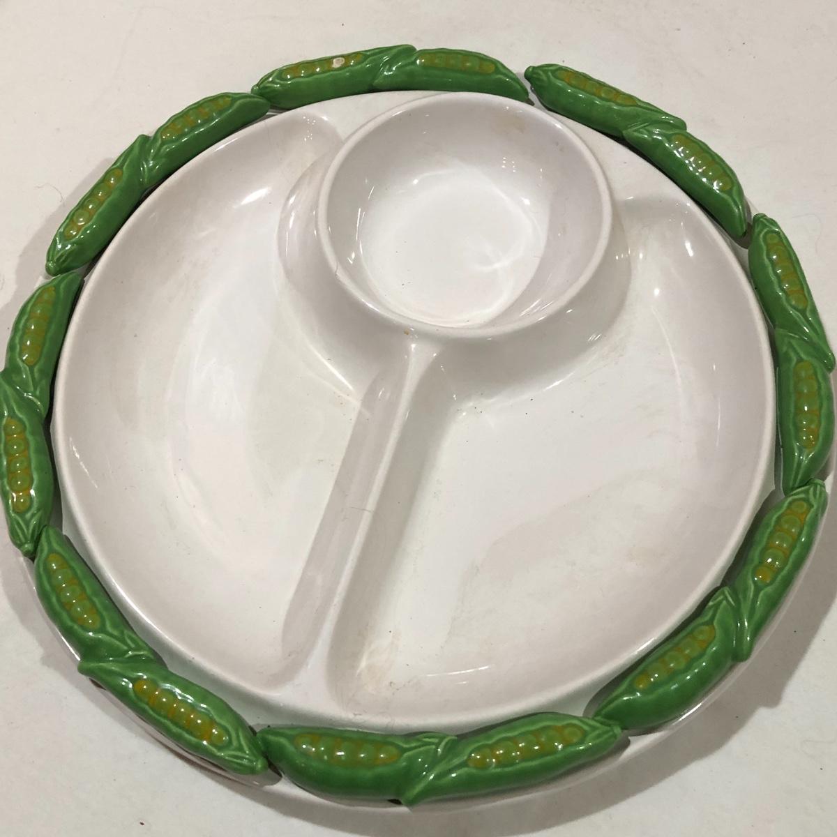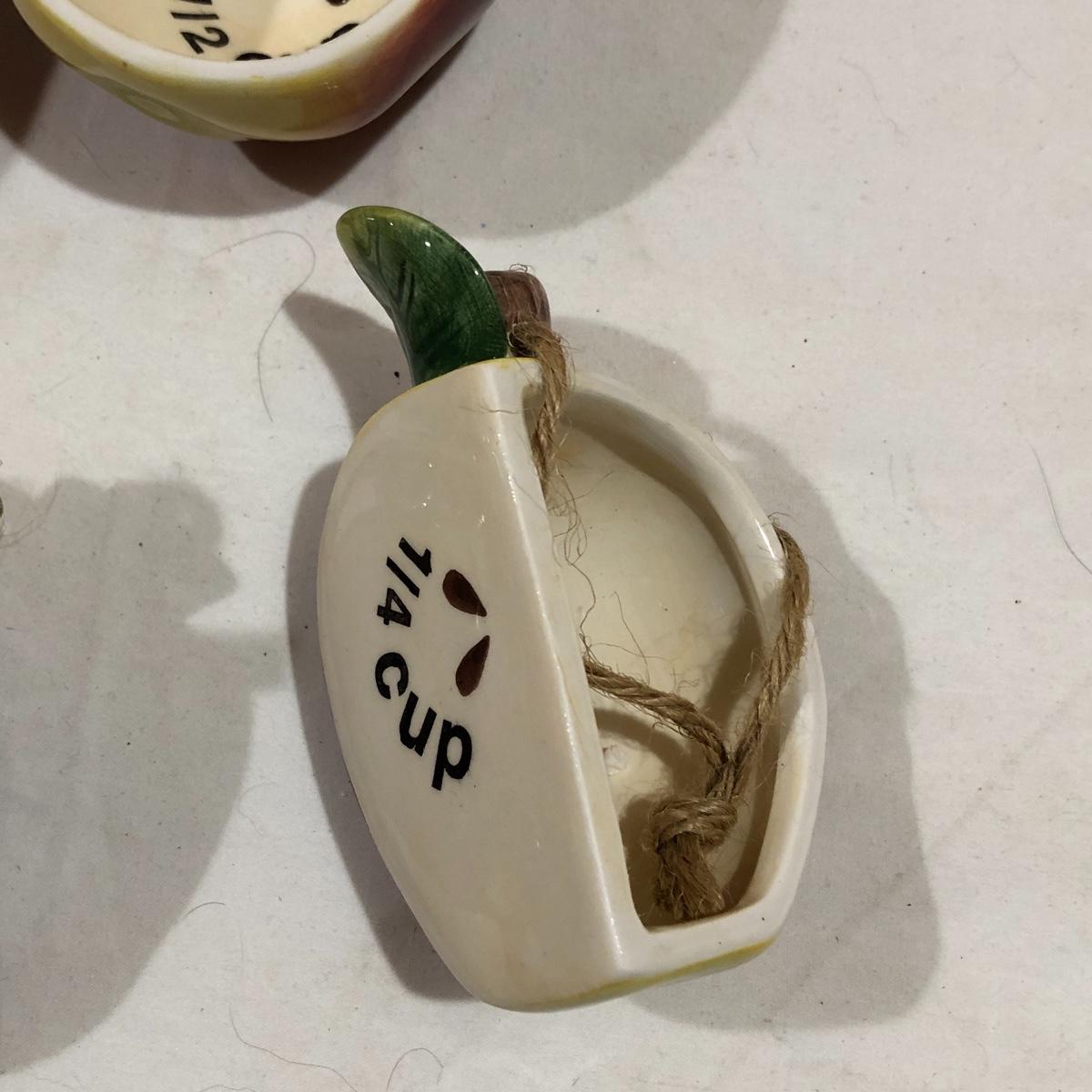 The Portuguese vegetable dishes are the celery dish (6.5” x 16.5”) marked Rosle 78, the oval pea appetizer dish (12.5” in diameter) marked A. Santos for Shafford and the seven corn on the cob trays, 6 marked Bordallo Pinheiro. Note one of the dishes is different than the other six. There are chips on the end of the celery dish and one small chip on the pea dish. The Hermetic spaghetti jar has a green glass bottom and is 10.5” tall and 4” in diameter. There is no ring seal. There is also a cookie max cookie press that looks as if it has never been used. And finally there are four apple measuring cups. Shipping Available.