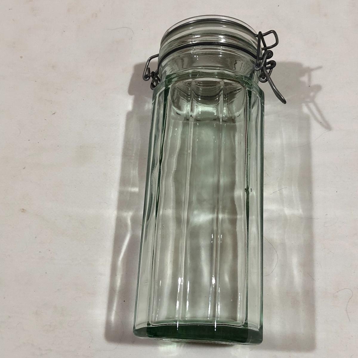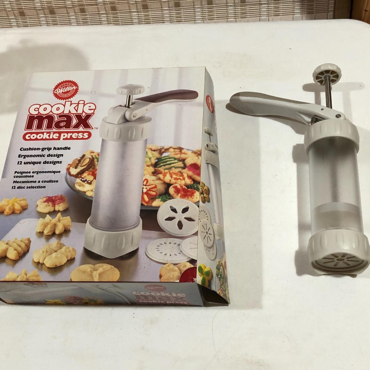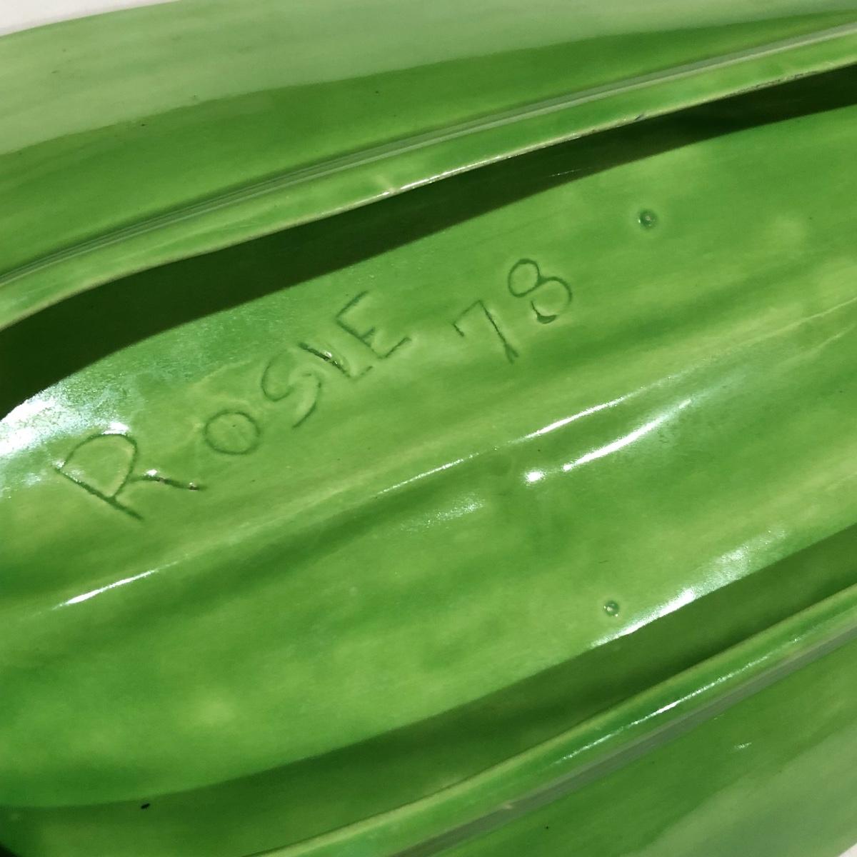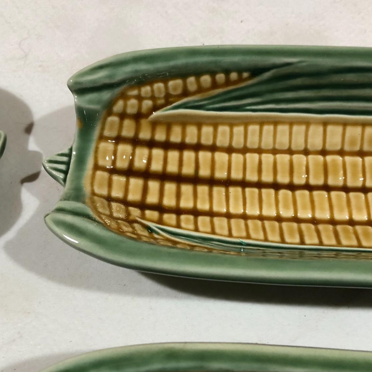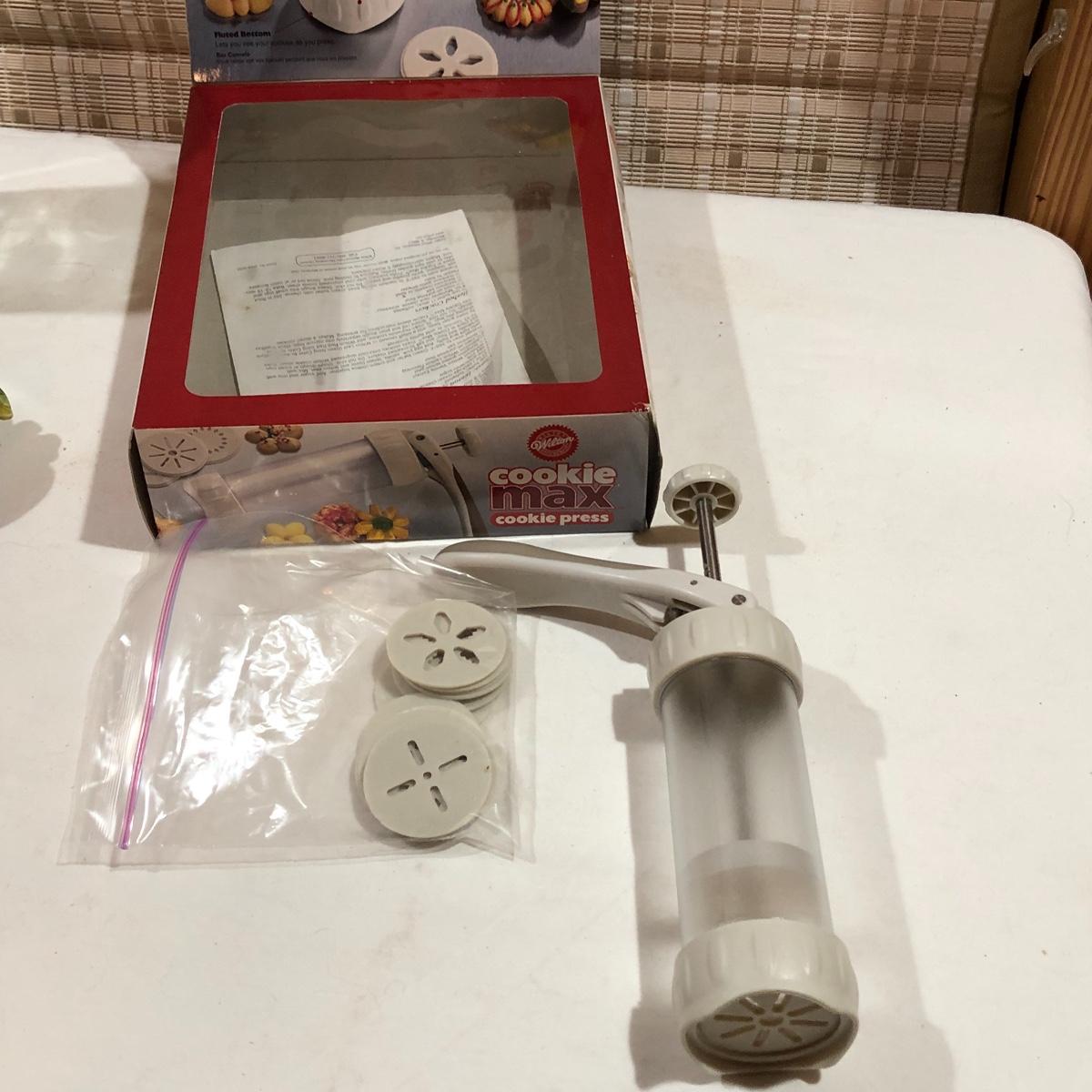 The Portuguese vegetable dishes are the celery dish (6.5” x 16.5”) marked Rosle 78, the oval pea appetizer dish (12.5” in diameter) marked A. Santos for Shafford and the seven corn on the cob trays, 6 marked Bordallo Pinheiro. Note one of the dishes is different than the other six. There are chips on the end of the celery dish and one small chip on the pea dish. The Hermetic spaghetti jar has a green glass bottom and is 10.5” tall and 4” in diameter. There is no ring seal. There is also a cookie max cookie press that looks as if it has never been used. And finally there are four apple measuring cups. Shipping Available.
