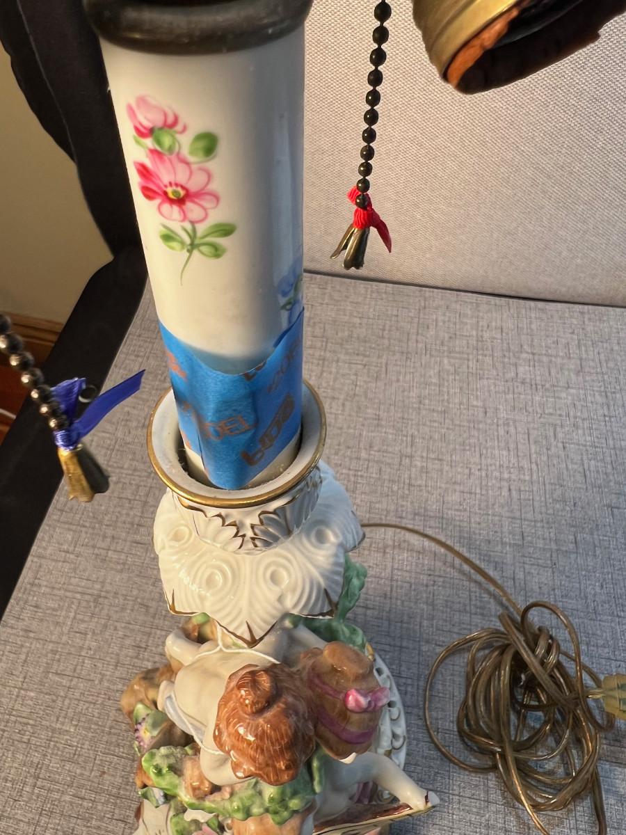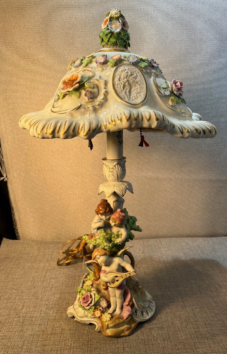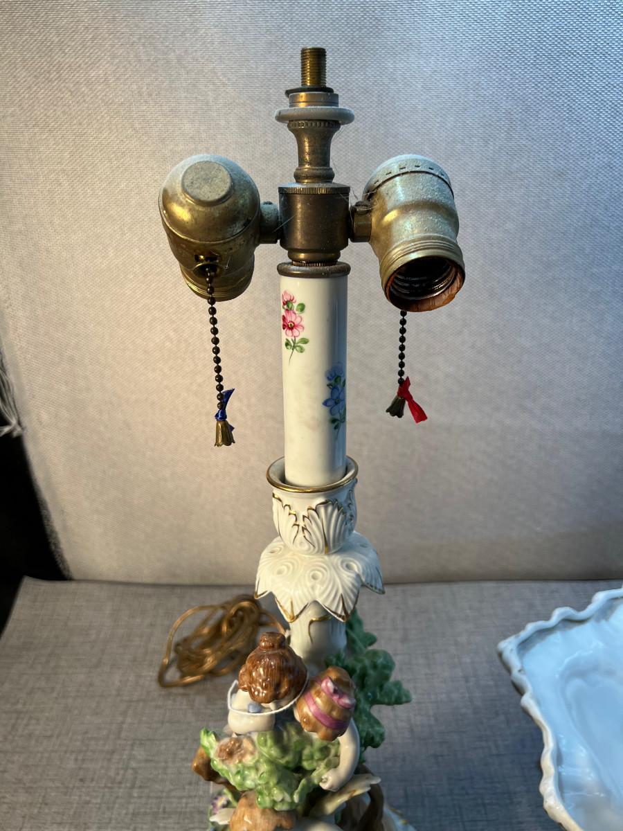 Dresden porcelain lamp, mark dates it 1973 to 1990, manufactured in former East Germany and the Dresden Porcelain Plant. The tip of the lute is broken off but the part is present. (see photos) 22' tall 1nd shipped weight will be over 15lbs. A boxing fee will apply if shipping is requested. Lamp works as it should.
