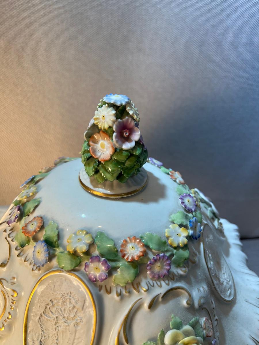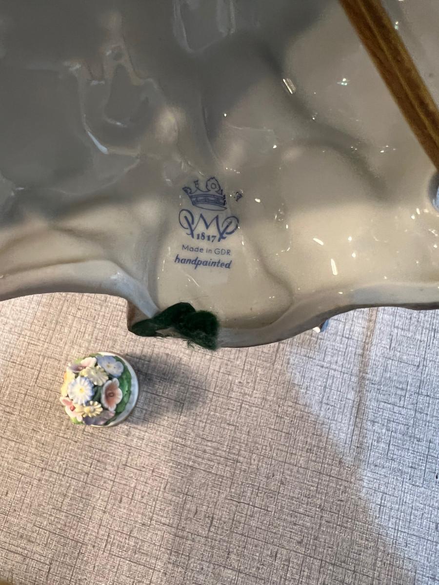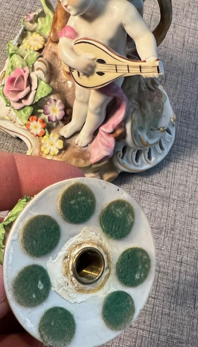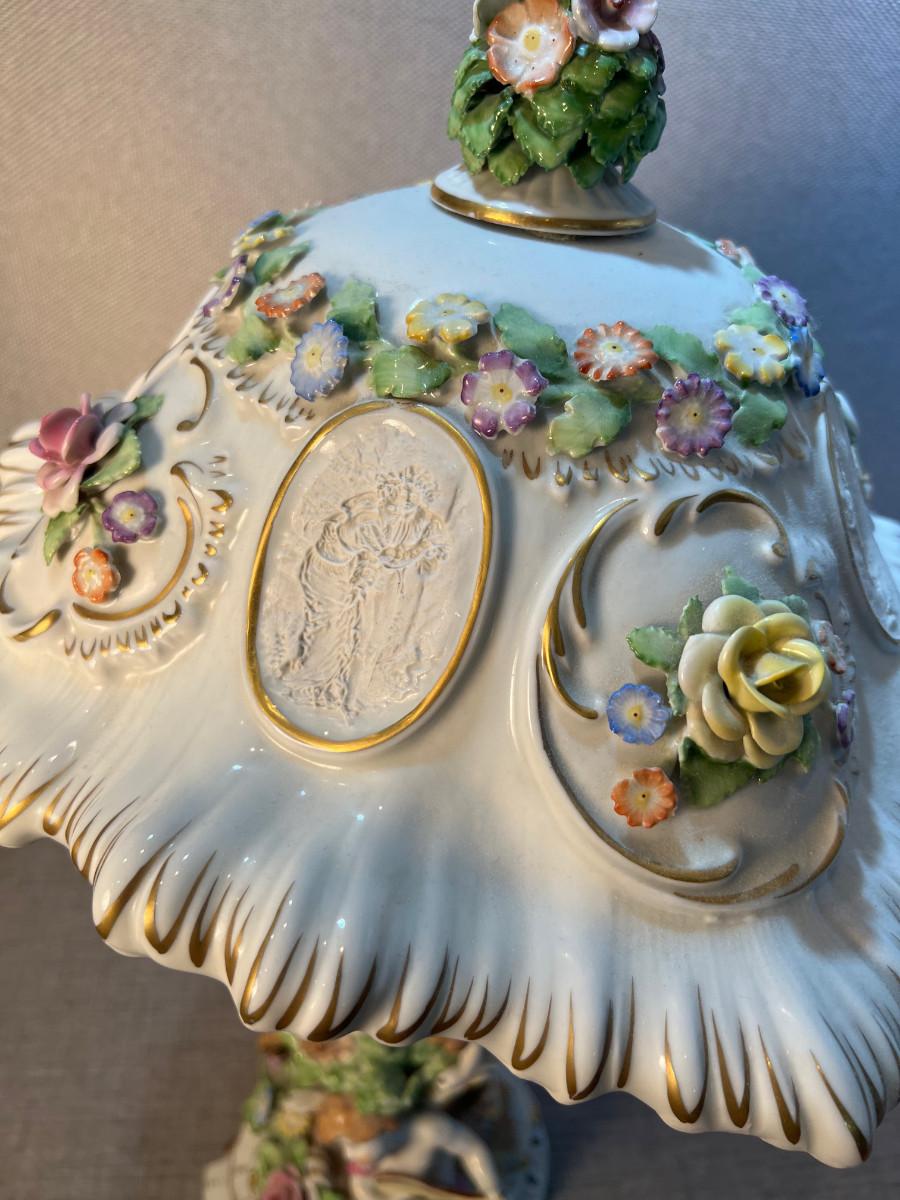 Dresden porcelain lamp, mark dates it 1973 to 1990, manufactured in former East Germany and the Dresden Porcelain Plant. The tip of the lute is broken off but the part is present. (see photos) 22' tall 1nd shipped weight will be over 15lbs. A boxing fee will apply if shipping is requested. Lamp works as it should.