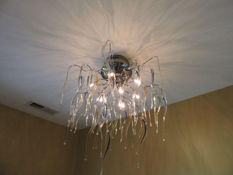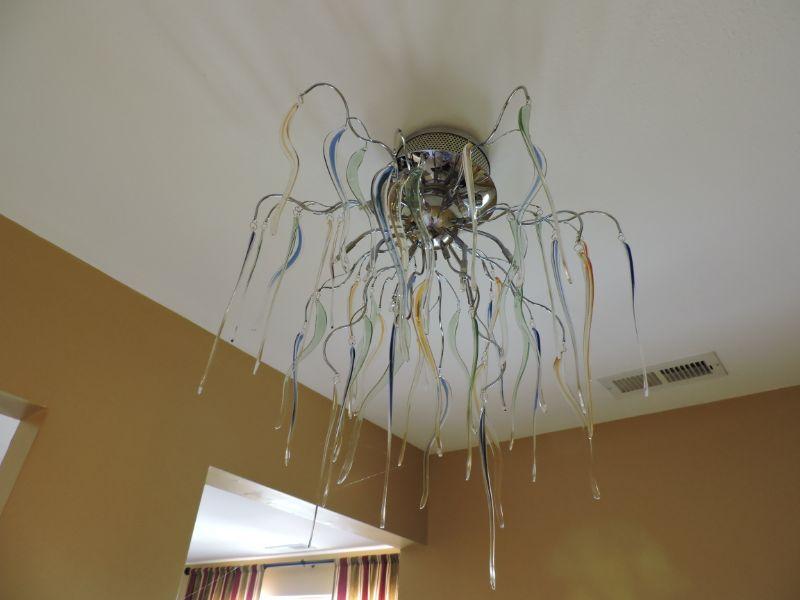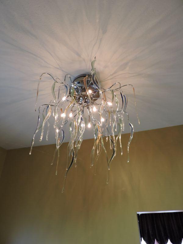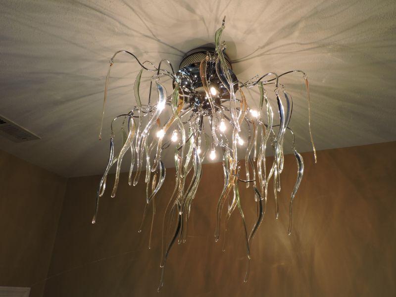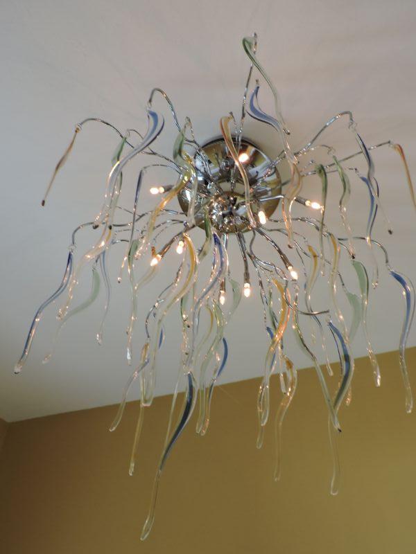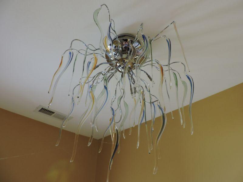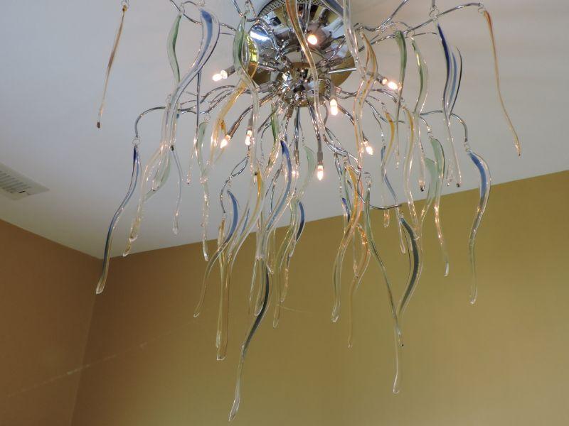 Amazing light fixture with pendent LED lights and glass swirls. Quite stunning! Must be removed by someone with electrical knowledge. **Please read Terms and Conditions before placing a bid. Pick up is Wednesday, September 25 from 4pm to 7pm and Saturday, September 28 from 9am to 1pm in Williamstown, NJ. All sales are final. All sales are as is, where is. Please review all photos. Any props included in photos are not included in listing. All measurements are approximate.
