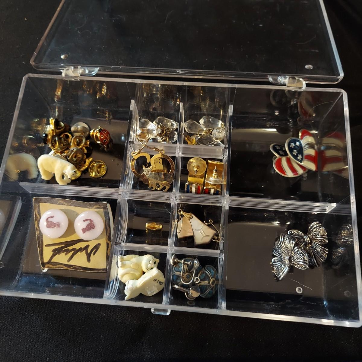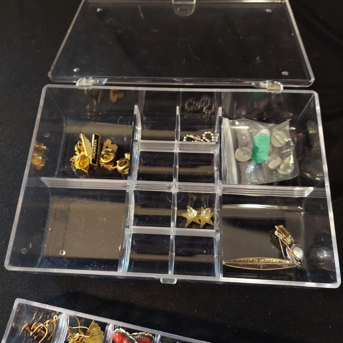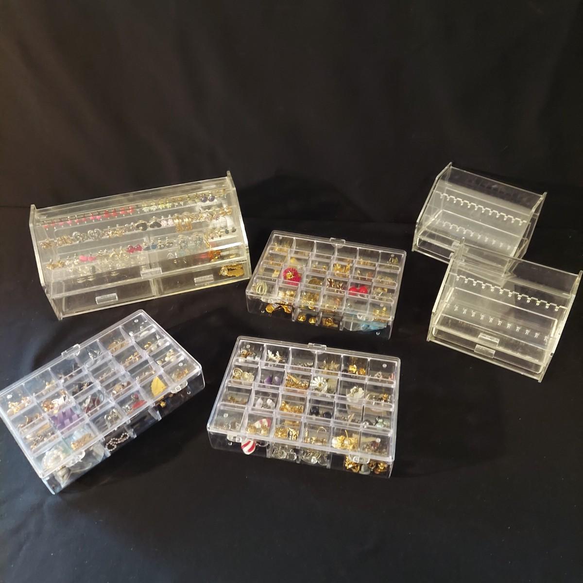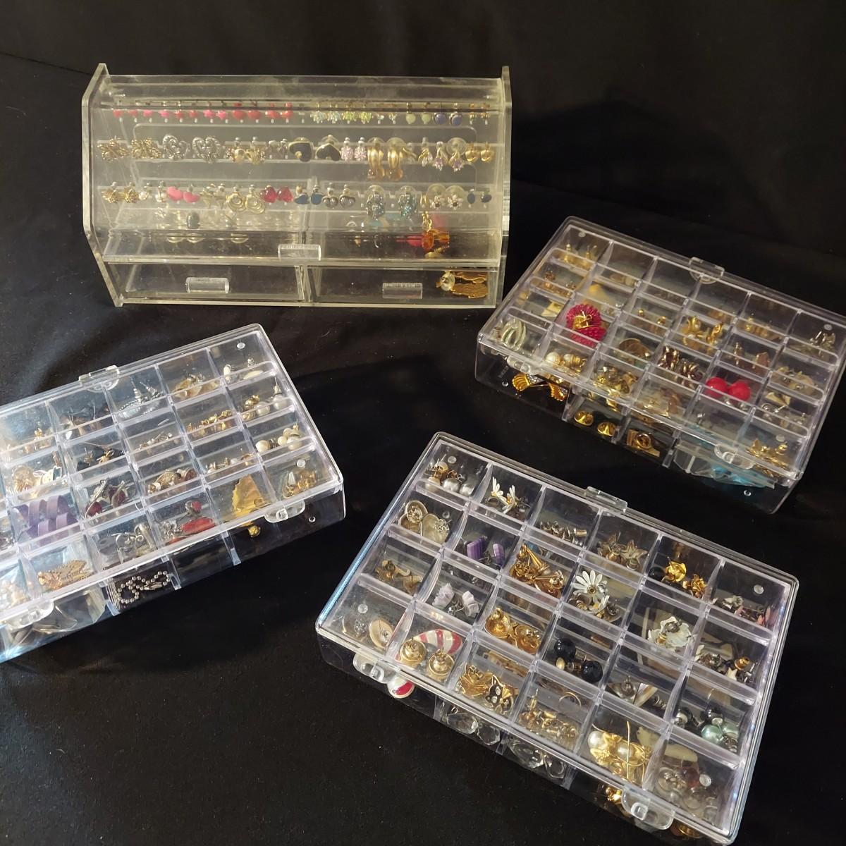 Lot includes many pairs of post back earrings for pierced ears. There are also a few pairs of clip-on earrings and small pins/brooches included as well. The small, empty containers measure 5” x 3.5” x 4"H. The largest container is 10” x 4” x 4.5"H. Please see photos for details. All sales are final. No returns or refunds. Please bid accordingly. Shipping available
