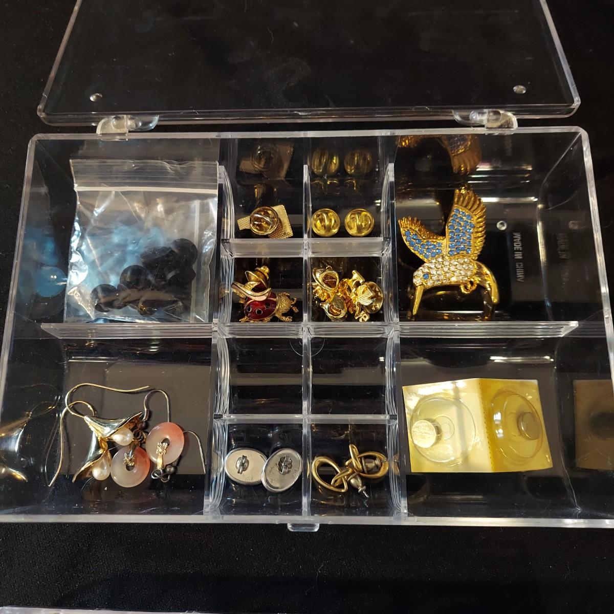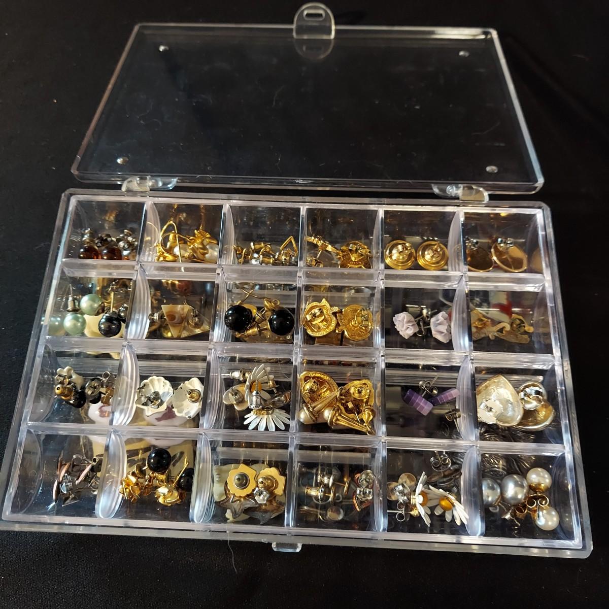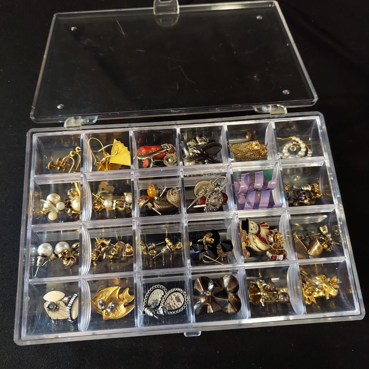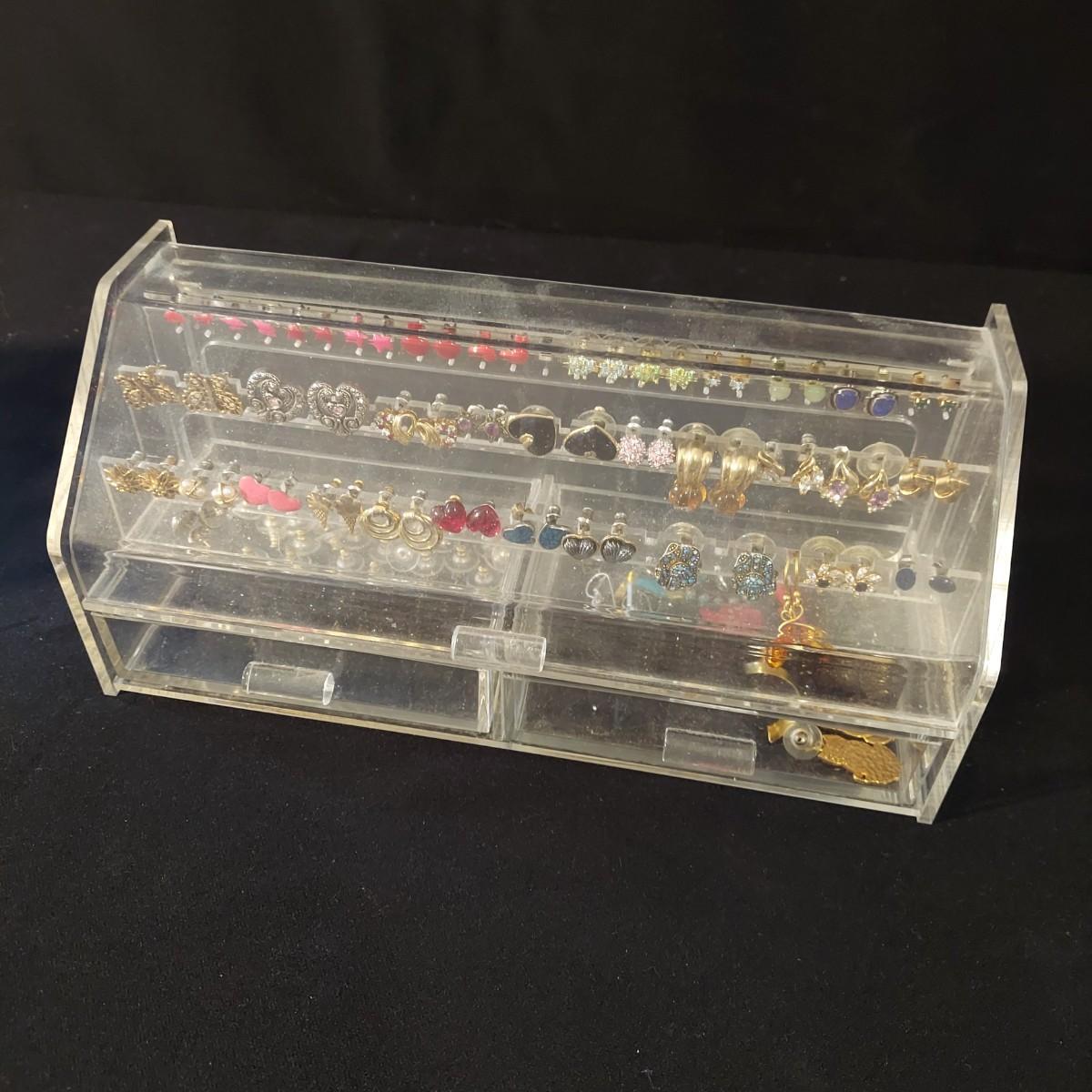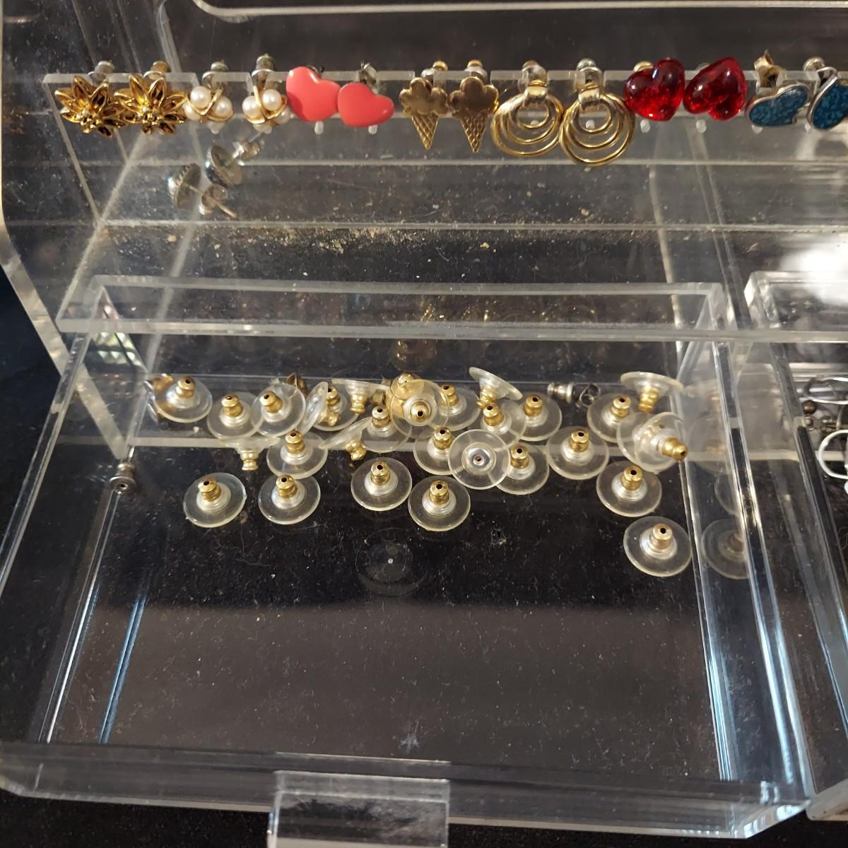 Lot includes many pairs of post back earrings for pierced ears. There are also a few pairs of clip-on earrings and small pins/brooches included as well. The small, empty containers measure 5” x 3.5” x 4"H. The largest container is 10” x 4” x 4.5"H. Please see photos for details. All sales are final. No returns or refunds. Please bid accordingly. Shipping available