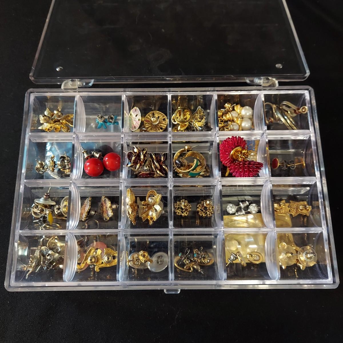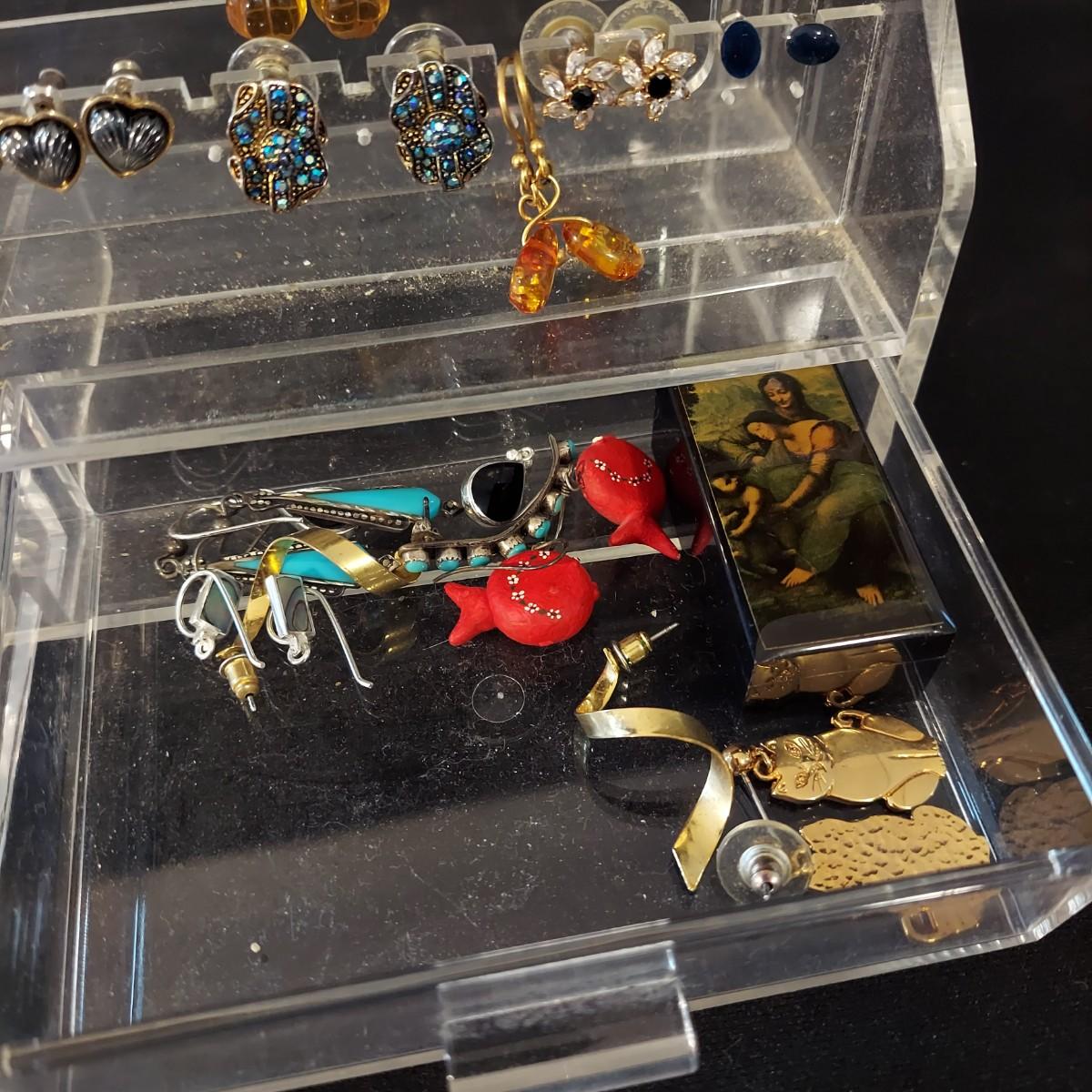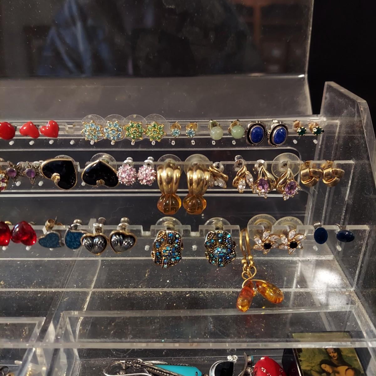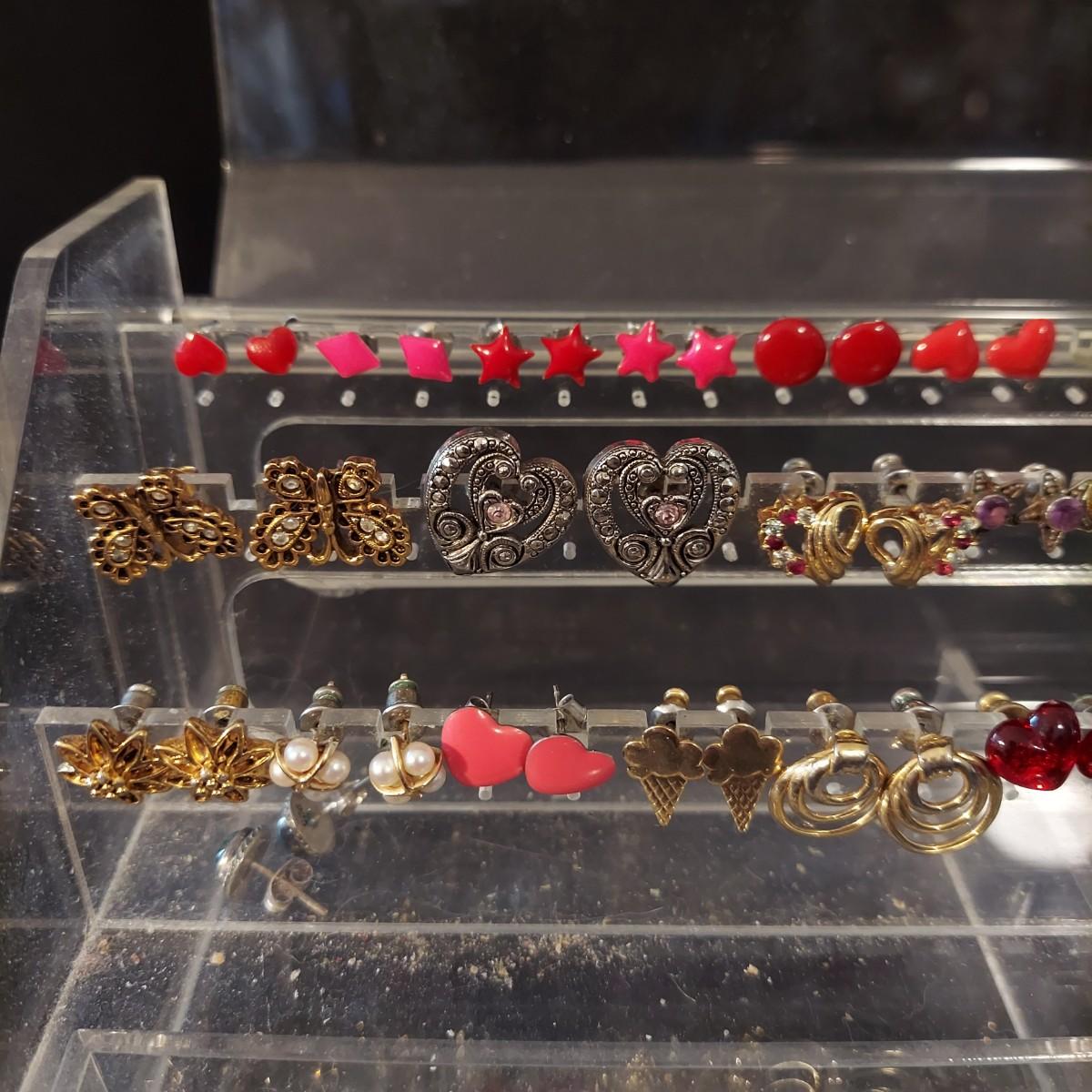 Lot includes many pairs of post back earrings for pierced ears. There are also a few pairs of clip-on earrings and small pins/brooches included as well. The small, empty containers measure 5” x 3.5” x 4"H. The largest container is 10” x 4” x 4.5"H. Please see photos for details. All sales are final. No returns or refunds. Please bid accordingly. Shipping available