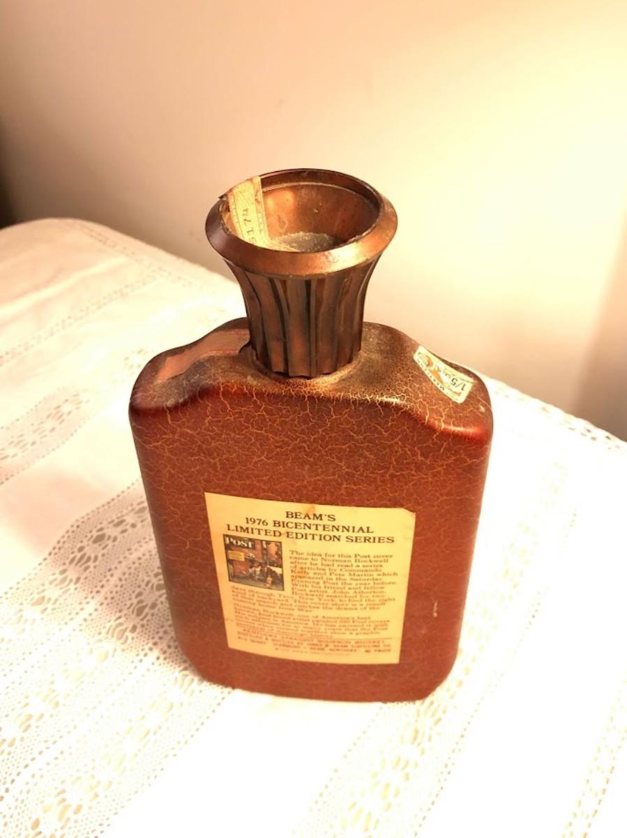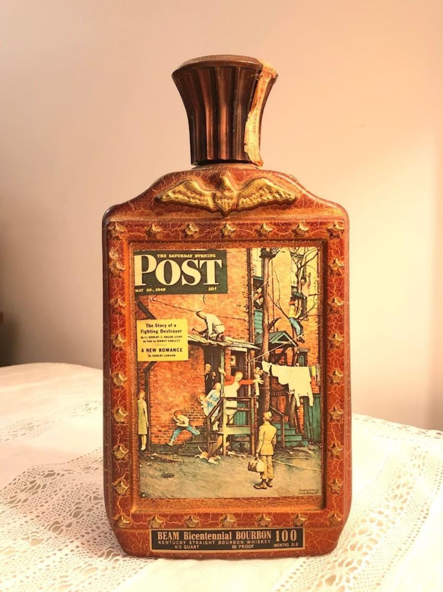 Beautifully detailed Post Magazine bourbon bottle with lid. 5" w x 10" h.