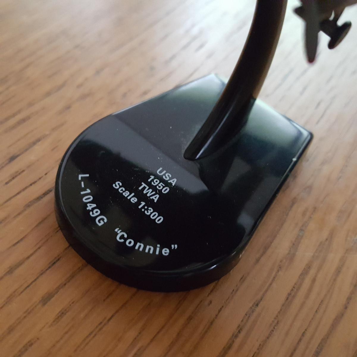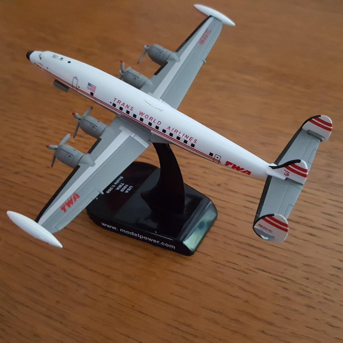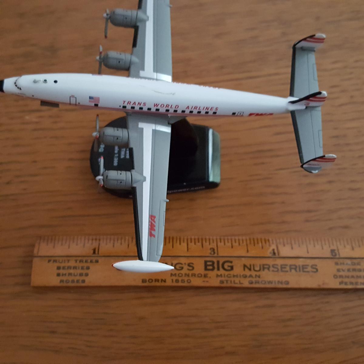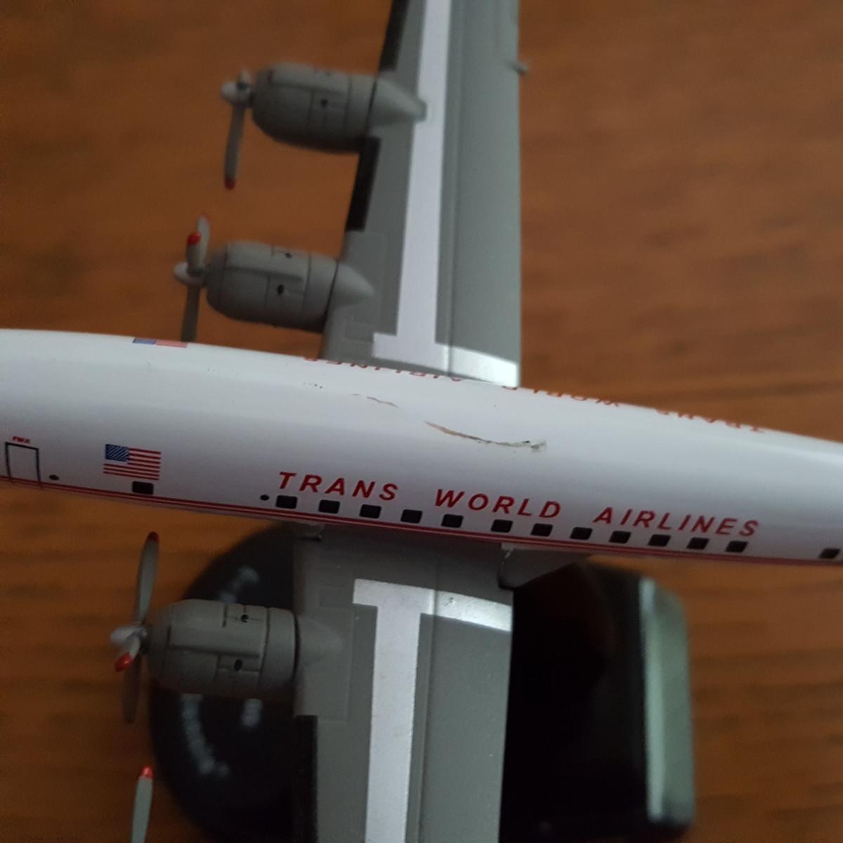 This auction lot is for a Postage Stamp TWA Lockhee L-1049G Super Constellation Die-Cast - Model PS5806-1 made in 1:300 Scale. Model is 4.5" long x 4.75" wide. It is mostly metal. This model is not shown as available on the current website of the manufacturer. NOTE: the scratch in the paint on top of the plane - minor and easily repairable and one propeller is missing one prop.