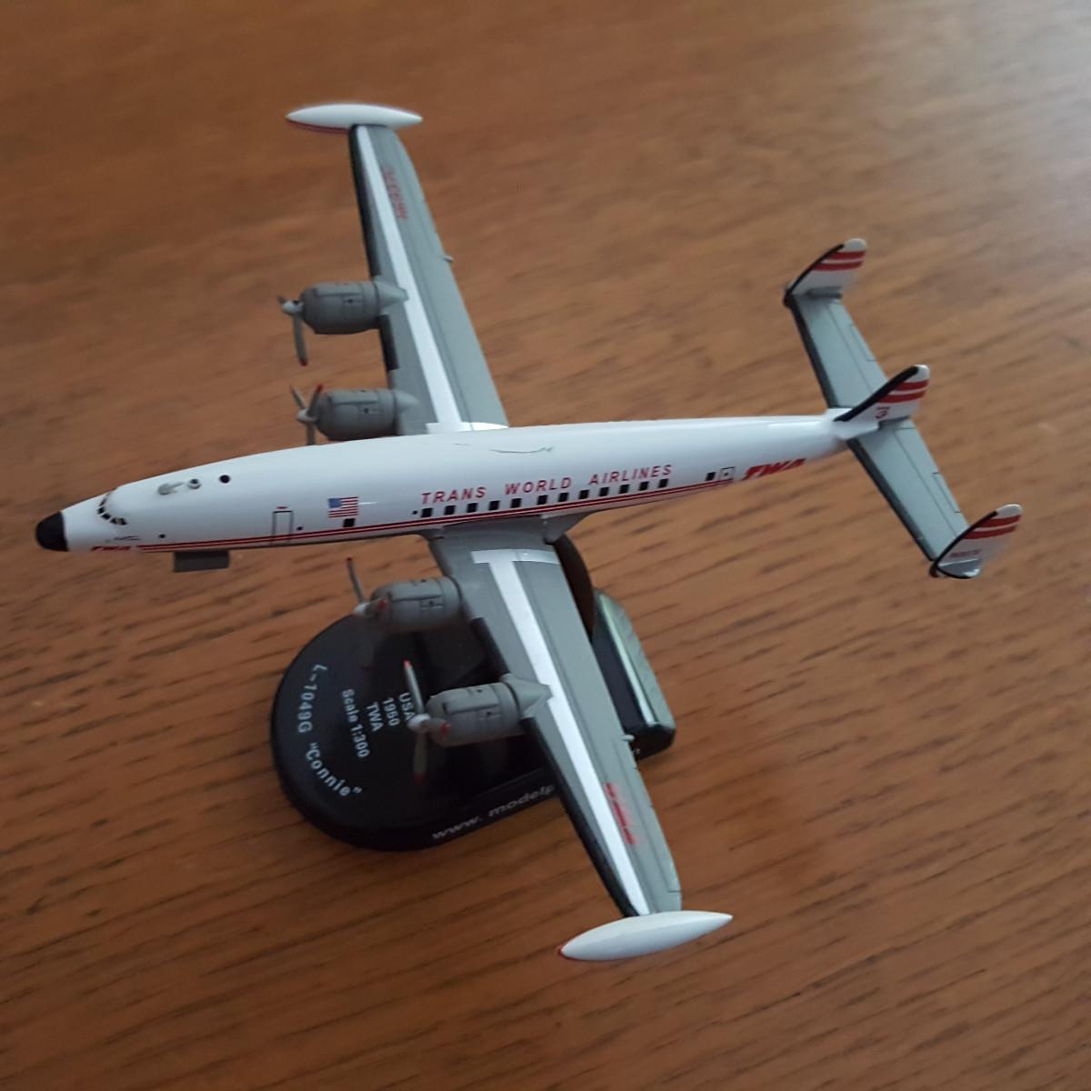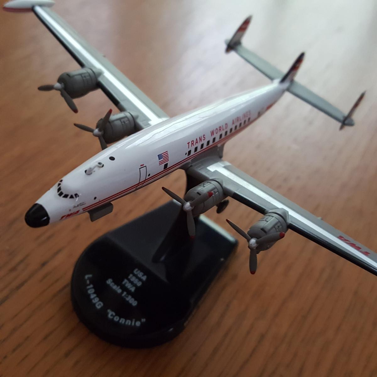 The actual Lockheed L-1049 Super Constellation, aka "Super Connie", is a propeller-driven, four-engined commercial airliner produced by Lockheed Corporation. It has the iconic triple-tail design and the distinctive dolphin shaped fuselage of all aircraft in the Constellation line. It was actually an improved version of the L-049, stretched by 18 ft to compete with rival DC-6. When Howard Hughes took control of Trans World Airlines (TWA) after purchasing majority shares in 1939. He asked Lockheed to develop an airliner secretly since his own Hughes Aircraft was prohibited by federal law from supplying his airline. The result was the revolutionary Constellation. TWA purchased the first 40 of the new airliners off the production line and were the biggest civilian operators of Connies.