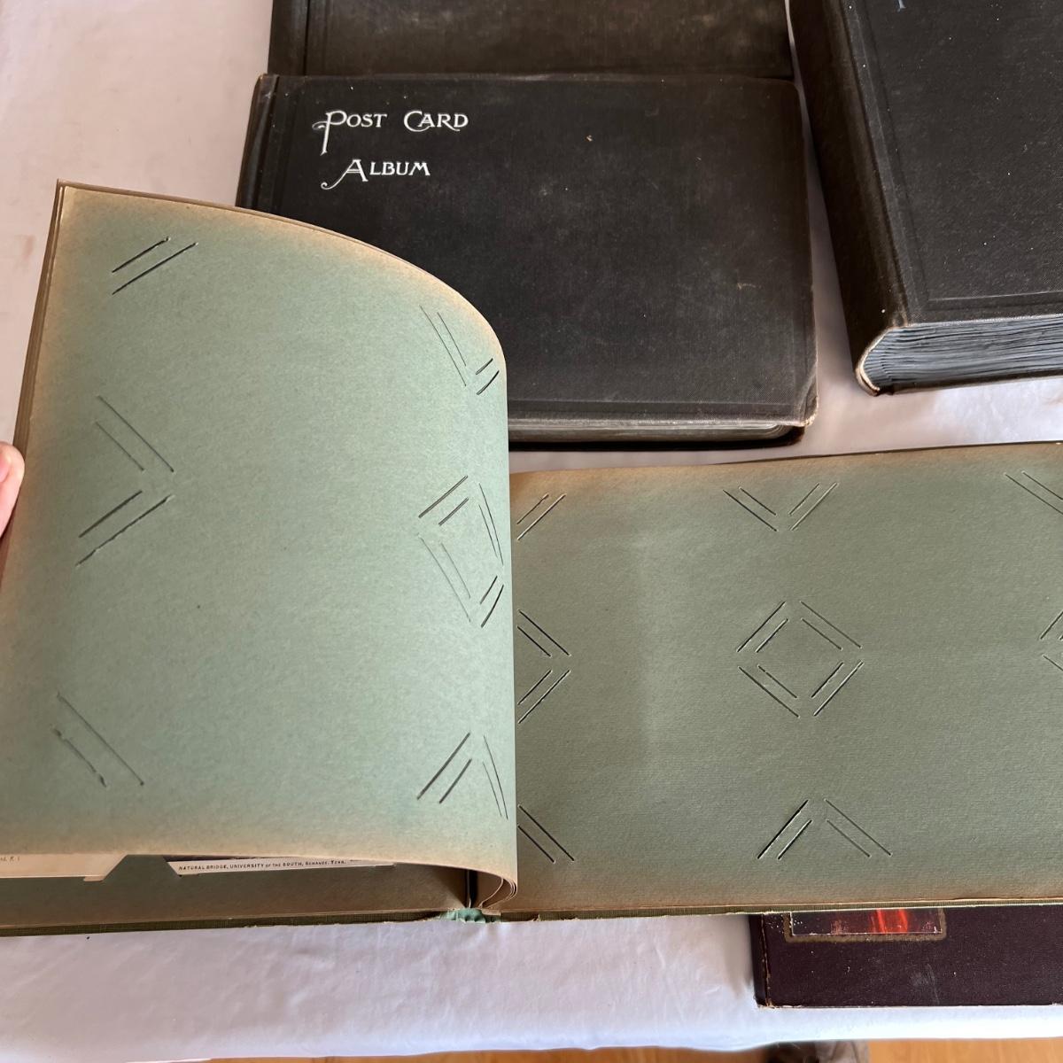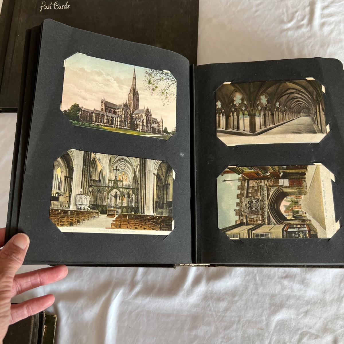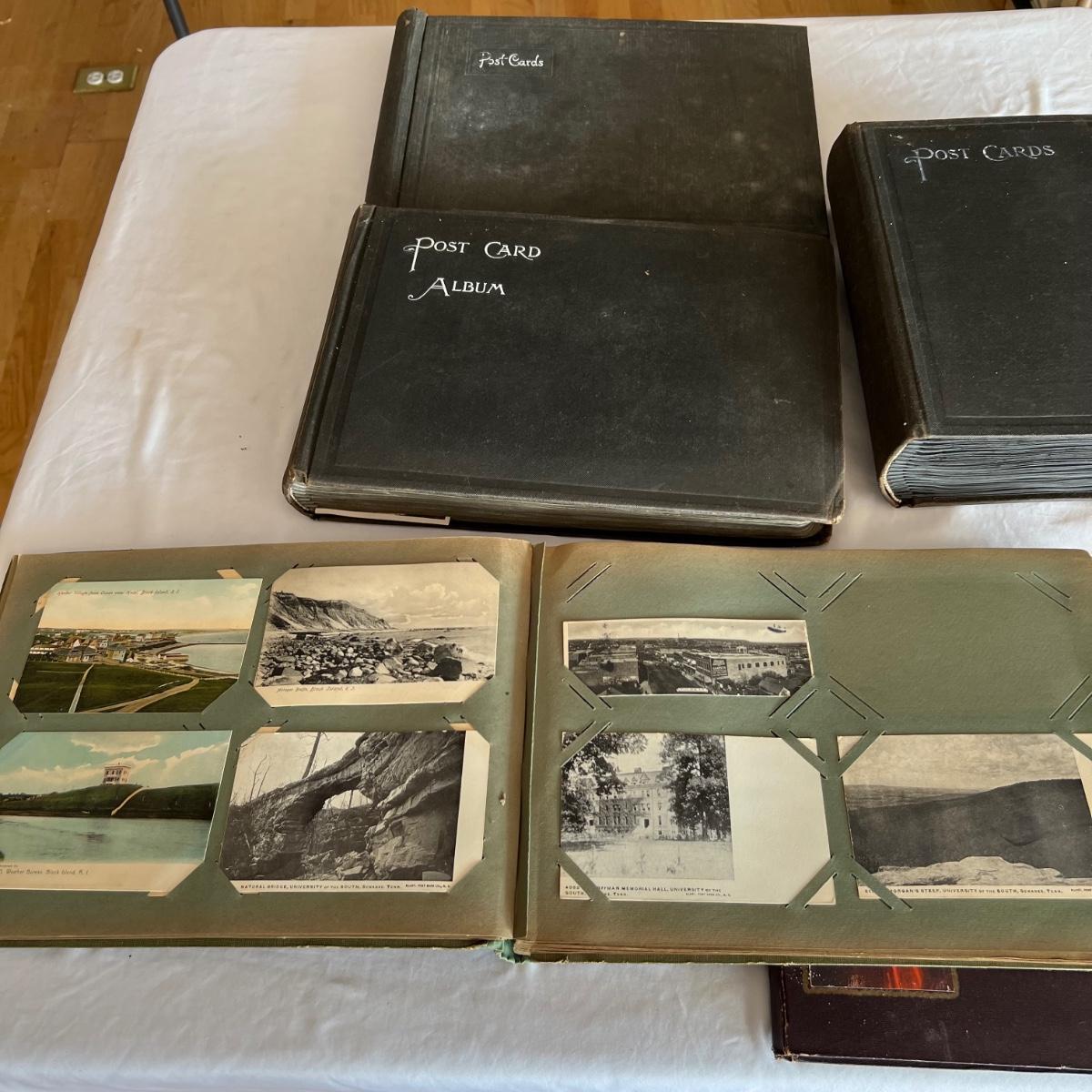 A nostalgic collection of postcard albums includes hundreds of postcards. As you will see from the photos albums are not completely full, there are some blank pages. The green album measures 9.5” x 1” x 14”.