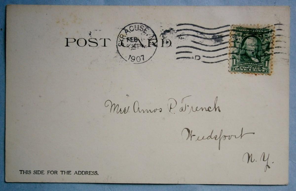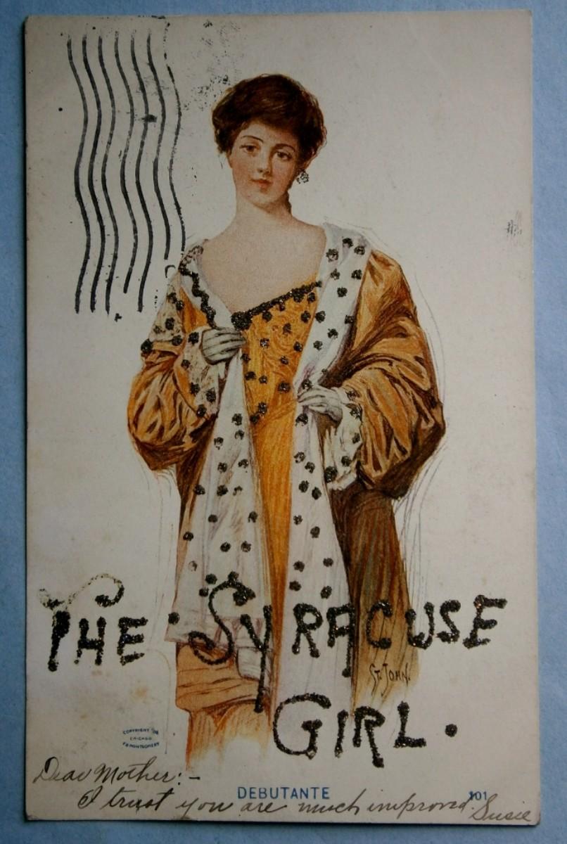 Postcard of "The Syracuse Girl" DEBUTANTE #101 signed St. John, posted in 1907, undivided back, the overwrite is done with glitter.