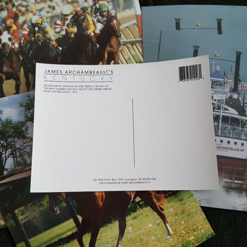 This auction lot is for a gathering of 6 postcards with photos taken by noted and recently deceased Kentucky photographer James Archambeault from his coffee table book entitled Kentucky. In good condition and frameable or mailable if you prefer. The cards featuring the Belle of Louisville have age darkening on the reverse.