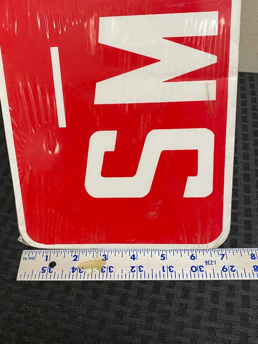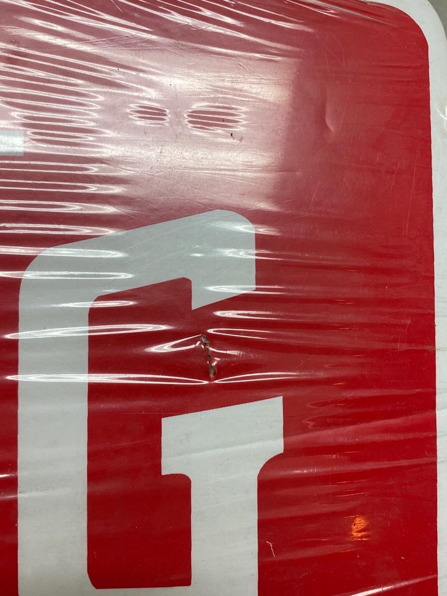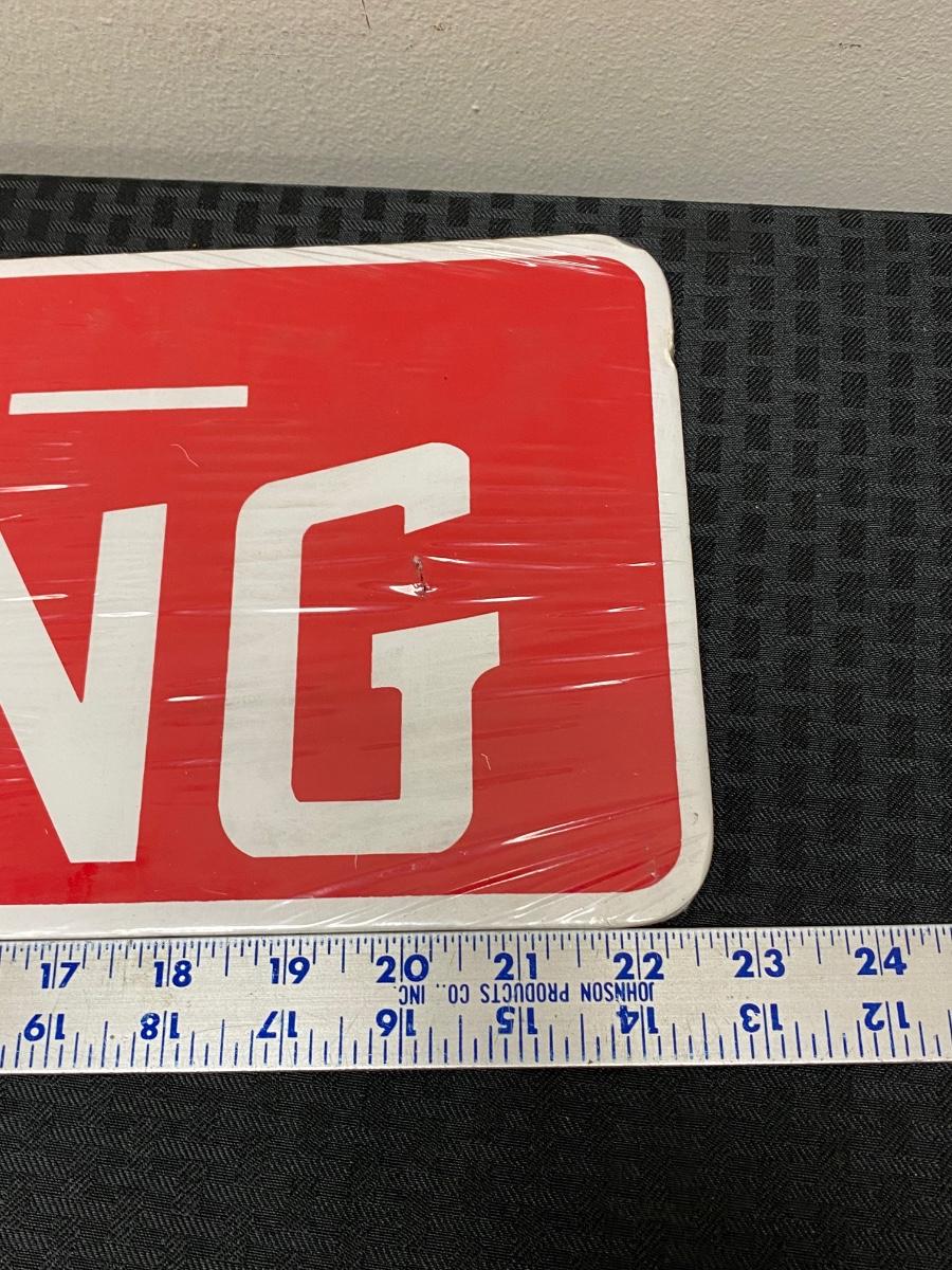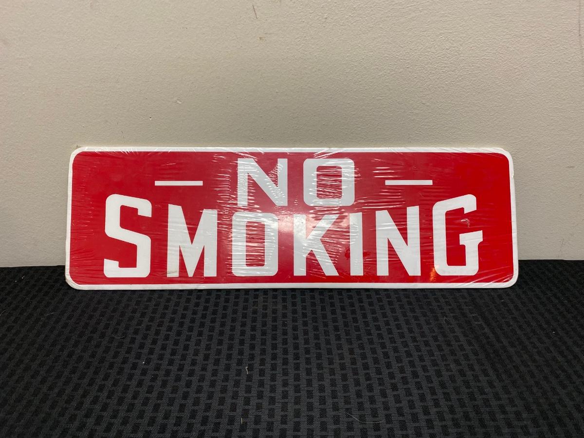 No Smoking sign still in plastic. Made of a lightweight poster board style material. There is a small hole in the sign at the G. About7"x23" size.