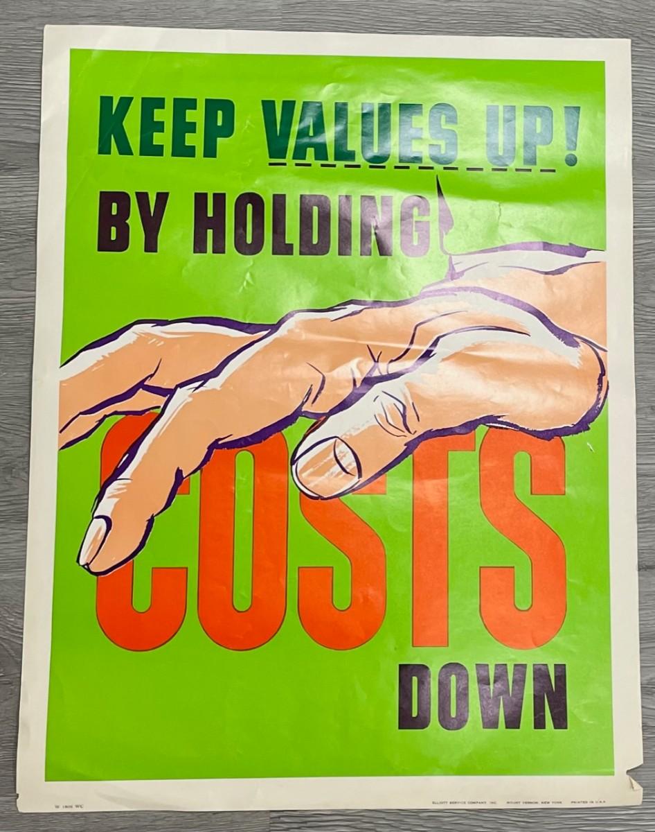 Description: "Keep Values Up By Holding Costs Down"; Elliot Service Company Inc. POSTER