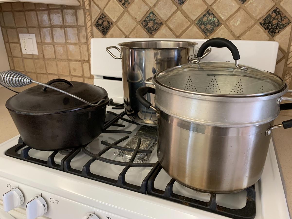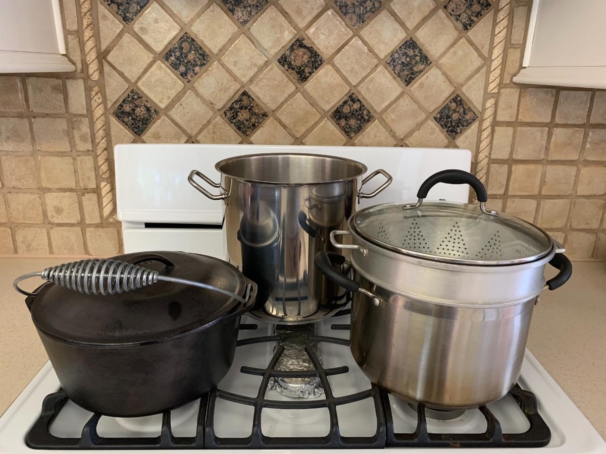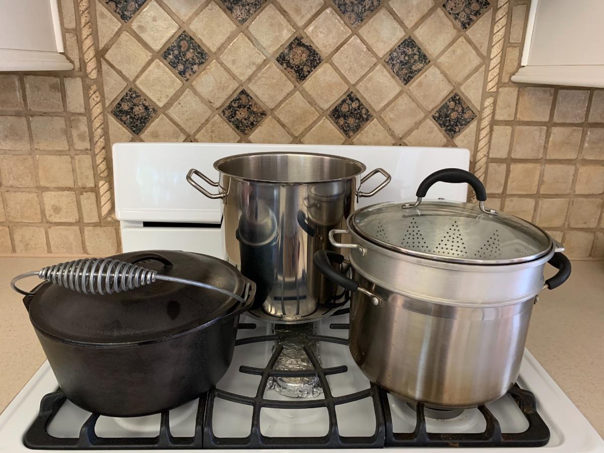 Includes cast iron Lodge 10 1/4 Qt dutch over with lid, Induktion stock pot without lid and a Energie 7 qt steamer pot with lid