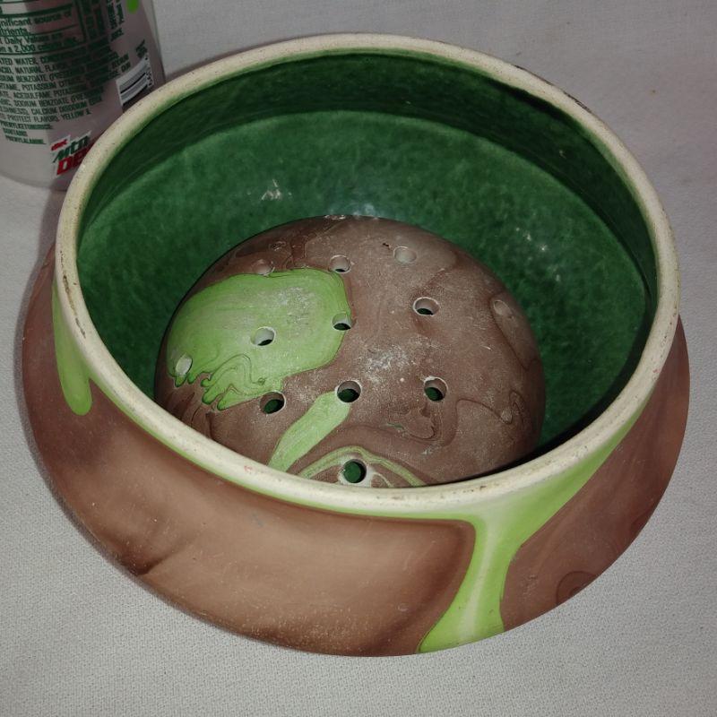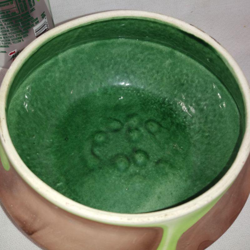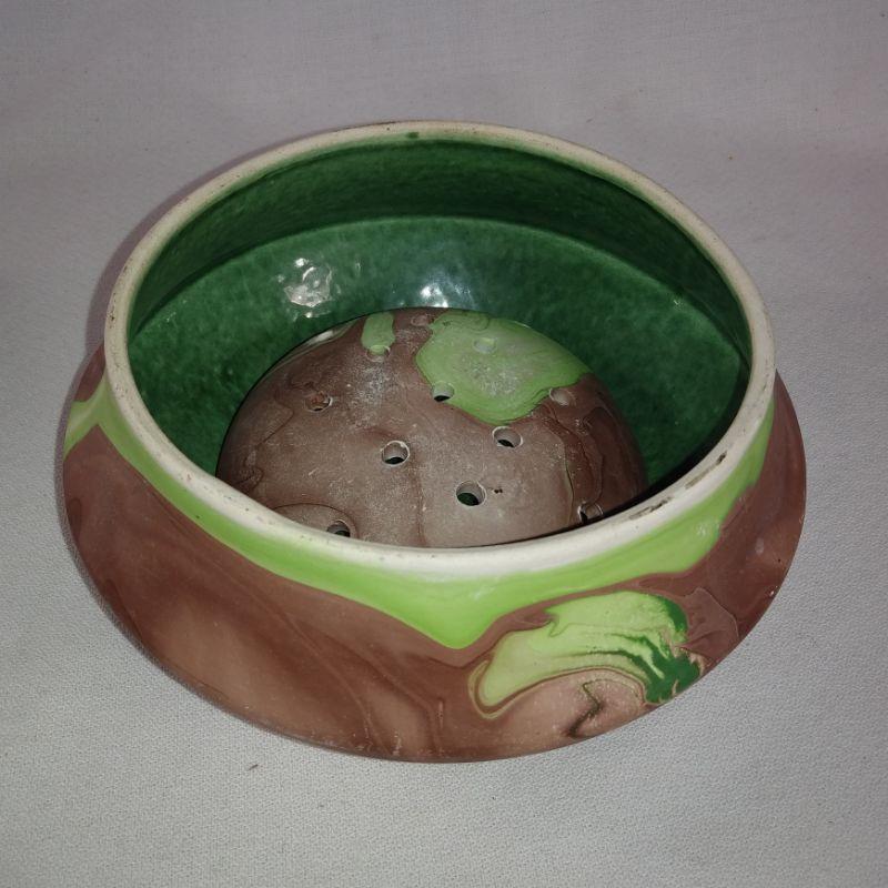 This offering is a shallow flower vase which is 6 1/2-inches in diameter X 3-inches tall. Both the vase and the frog are in very good condition - no cracks or chips, with great coloration.
