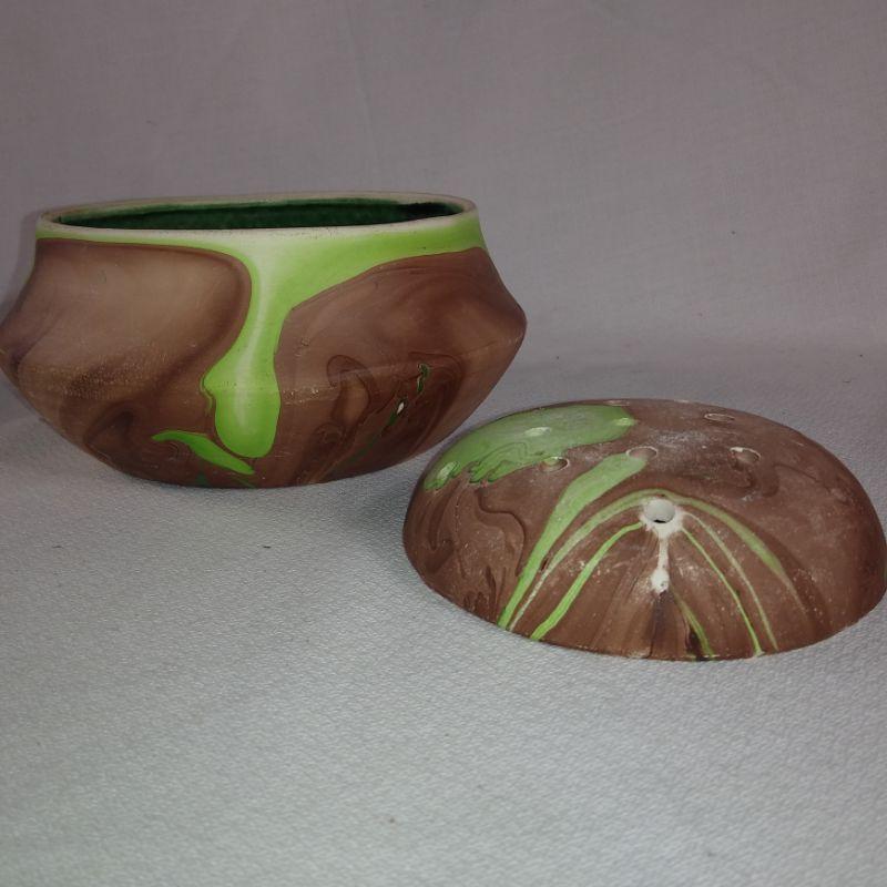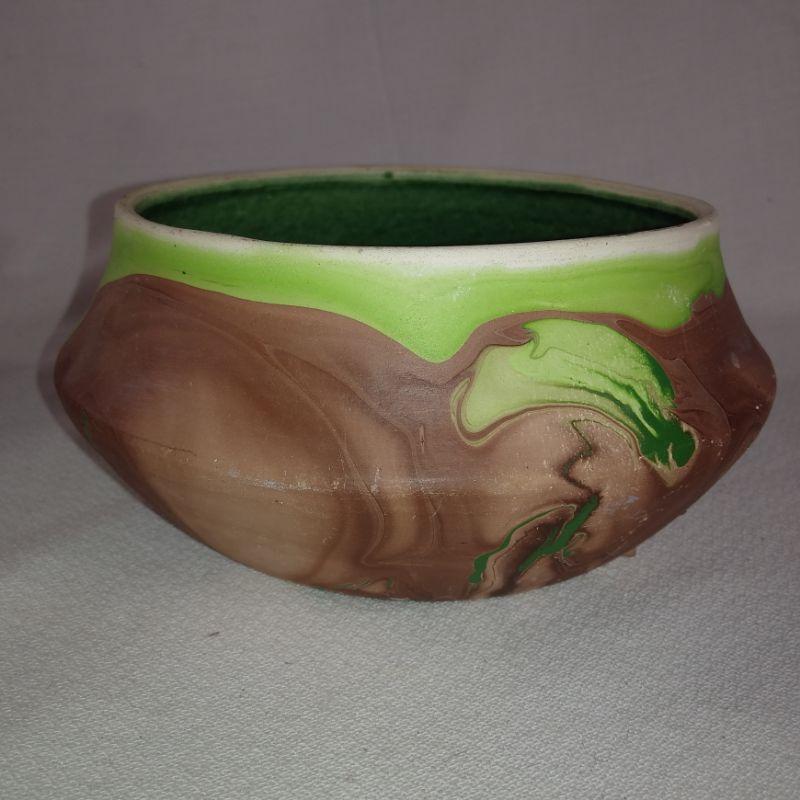 The coloring of Nemadji Art Pottery is accomplished in a unique kneading process that allows no two pieces to be identical. The pottery is kiln-fired and sealed on the interior. The warm rich colors are meant to recall the colorful costumes of native Americans such as those of the Sioux and/or Ojibway tribes, whose ancestors and spirits still roam the plains, streams, woods and lakes of the region.