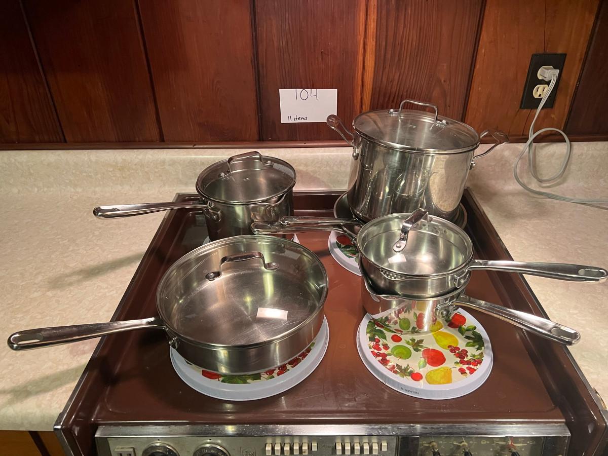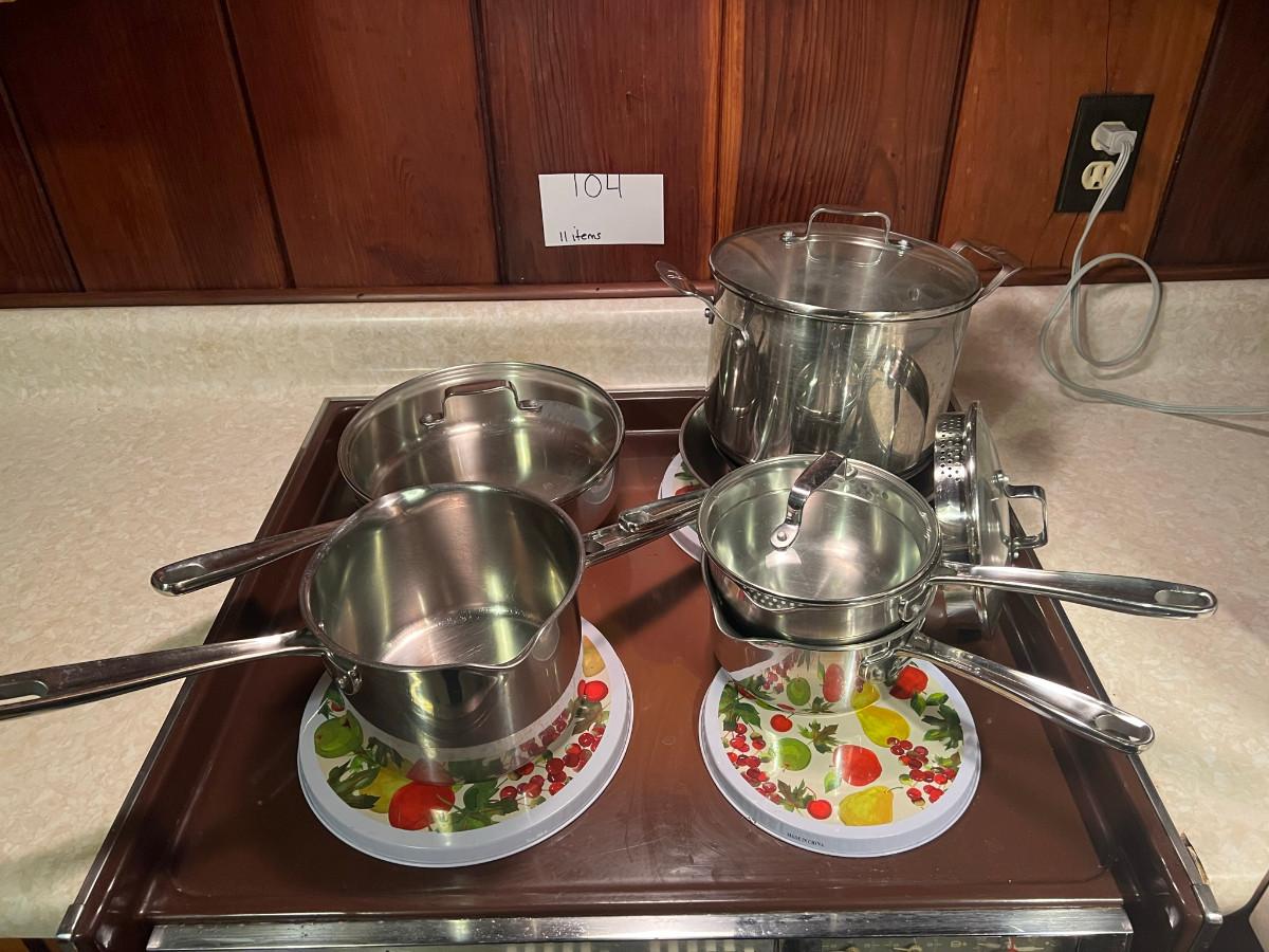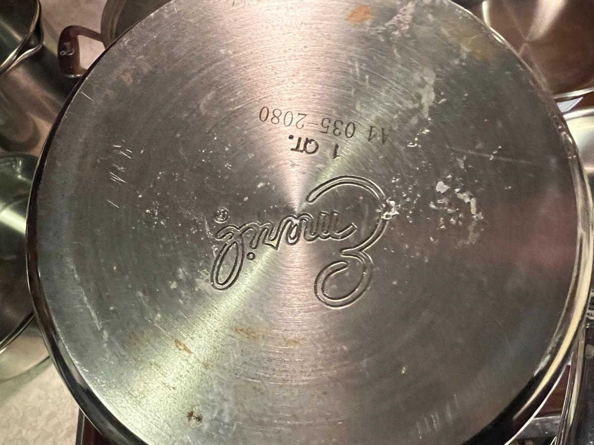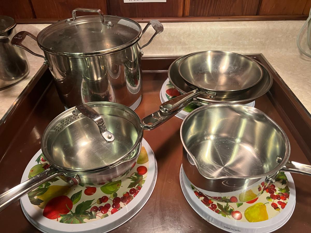 Emeril Pots and Pans: 6 quart pot with lid, 3 quart pan with lid, 10" fry pan, 8" fry pan, 3 qt pot with lid, 1.5 quart pot, 1 quart pot with lid