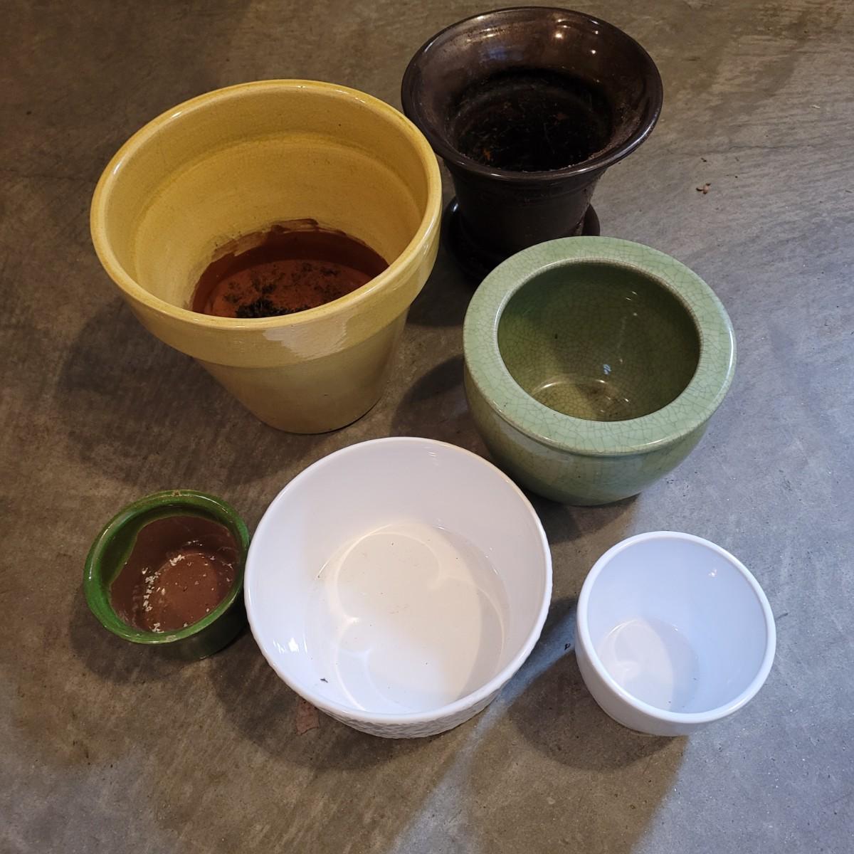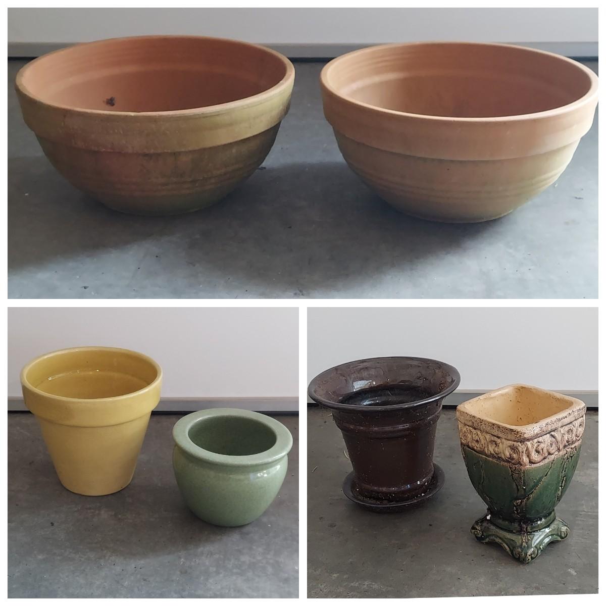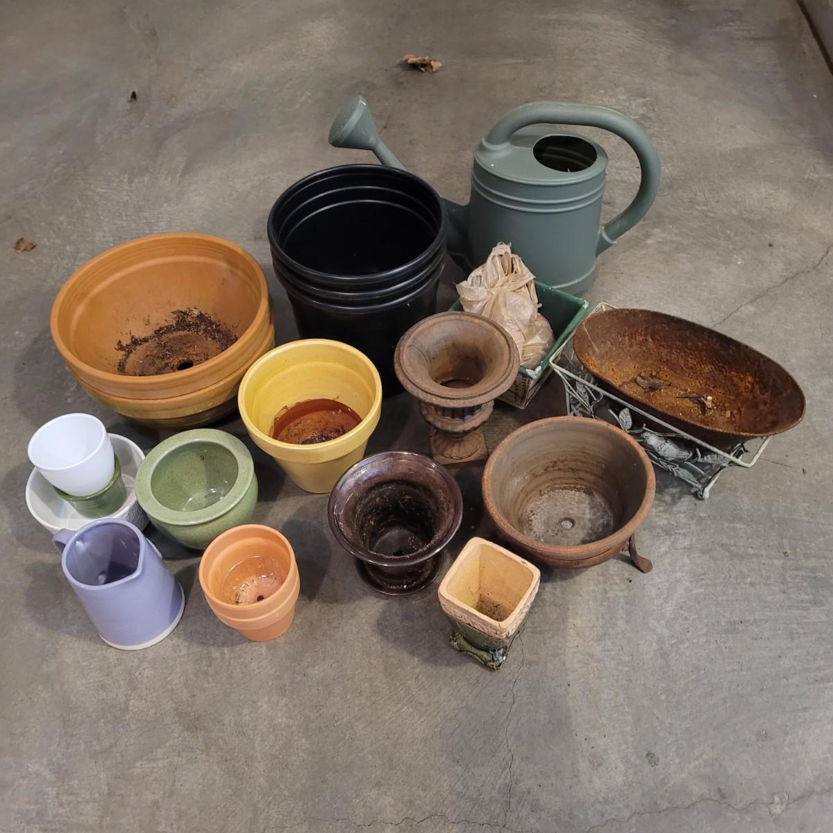 This lot is for various plant pots, holders, pitchers, and watering cans. 20 total pots of various sizes. Most are ceramic while some are plastic. Three metal plant holders including a bag of decorative pebbles. One plastic watering can, and decorative ceramic pitcher. Perfect for sprucing up your potted plant area! Plastic watering can measures 20" x 6" x 15"H.