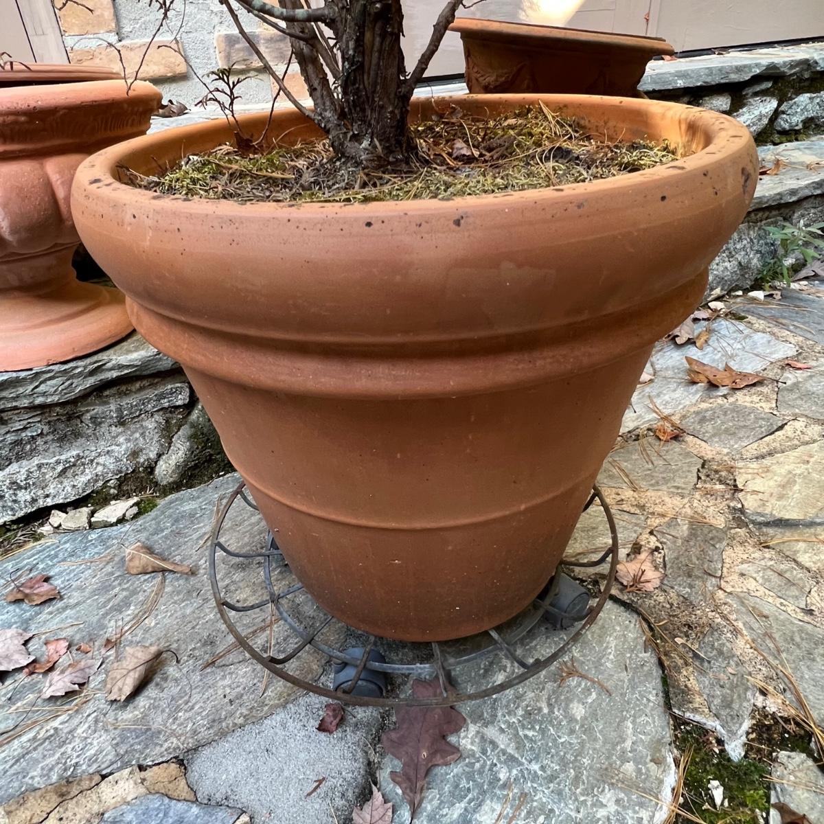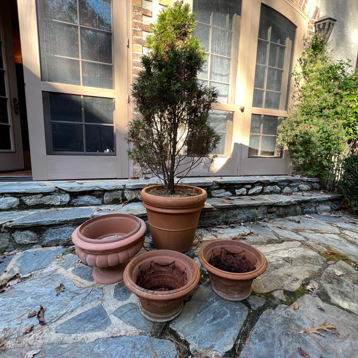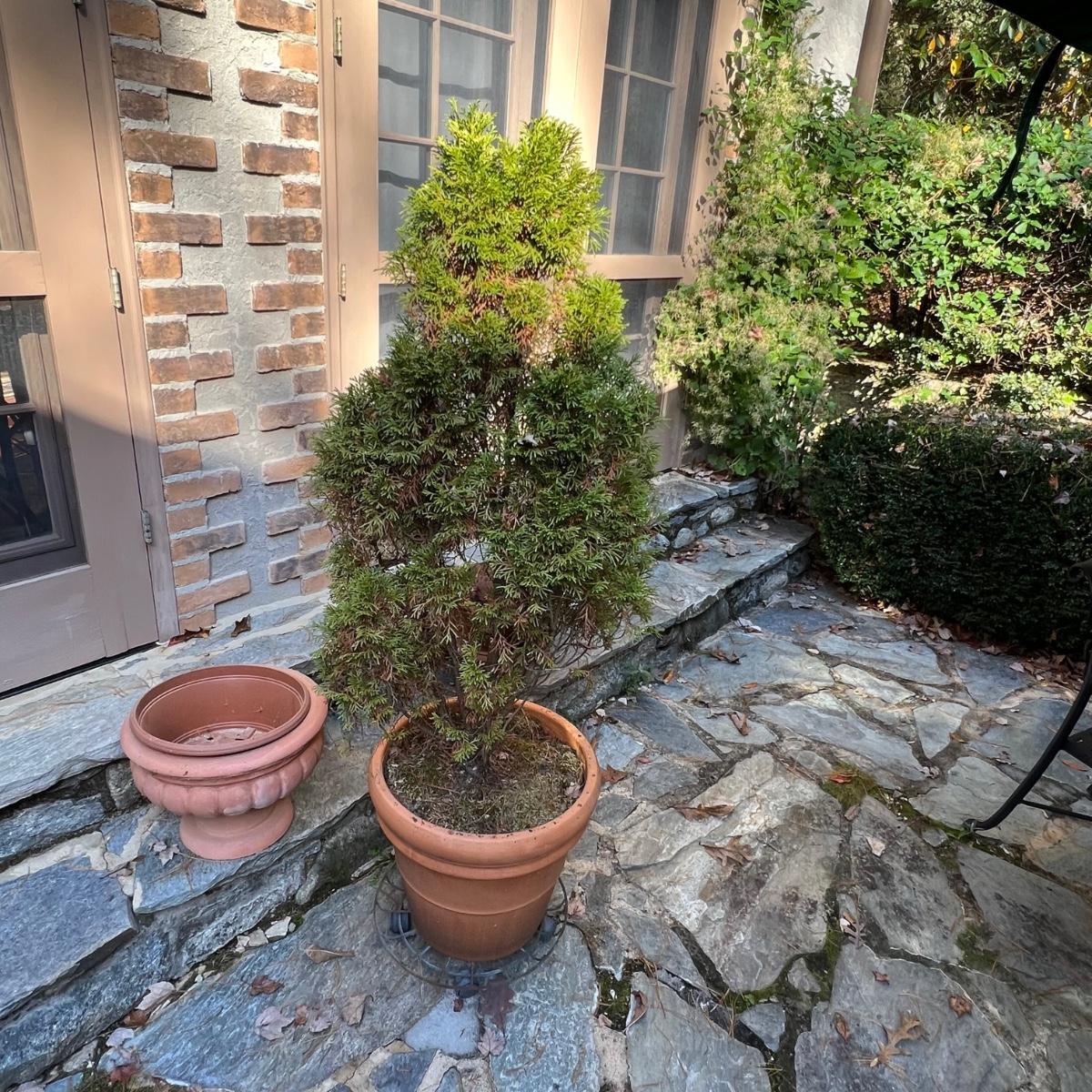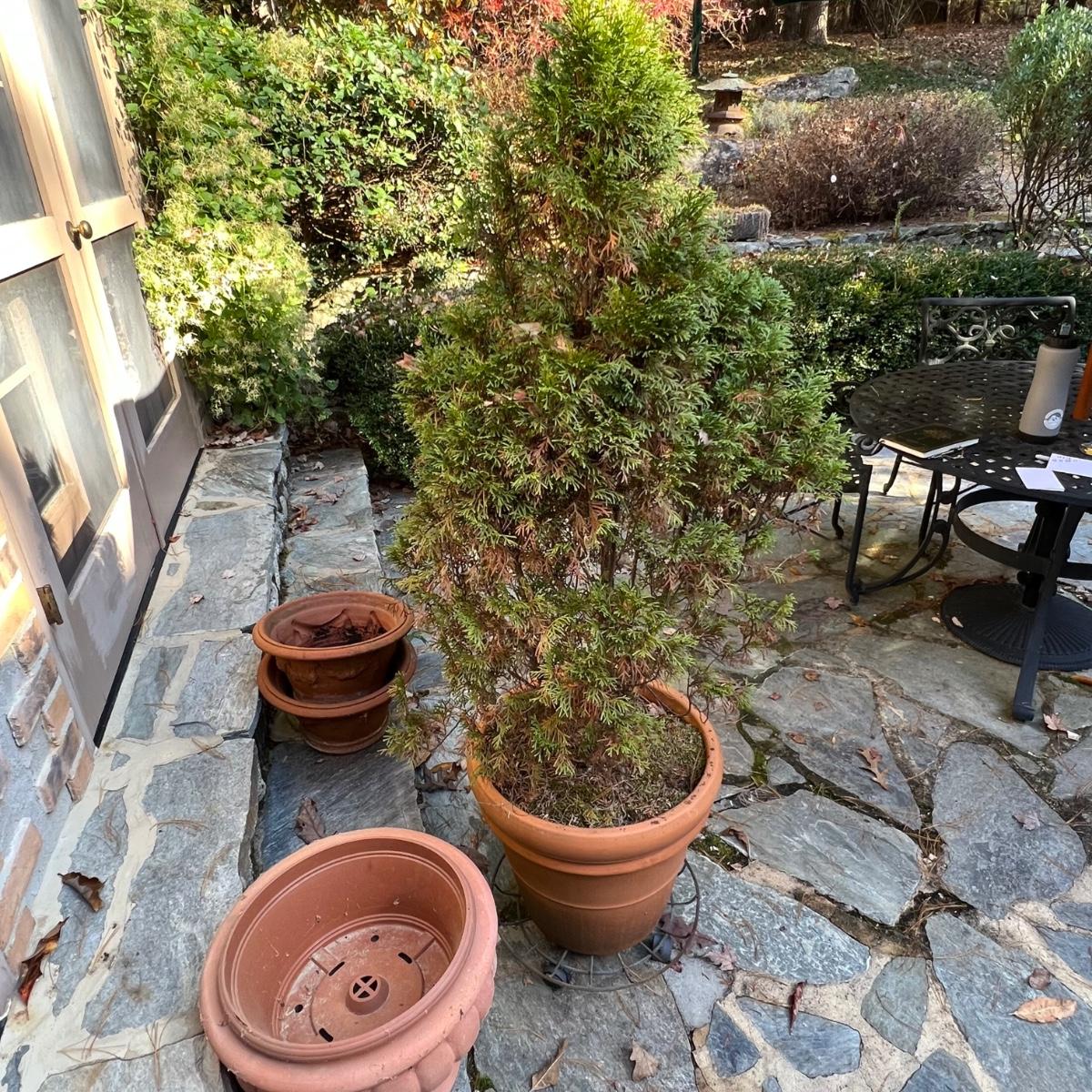 This evergreen Arborvitae plant, likely a Chinese Arborvitae, measures 62”H (including pot, this pot is 18”D). There is a minor chip near the rim, see image. The metal plant stand is included, it has plastic casters. A pair of terracotta pots along with a terracotta pedestal pot with plastic insert are also included.