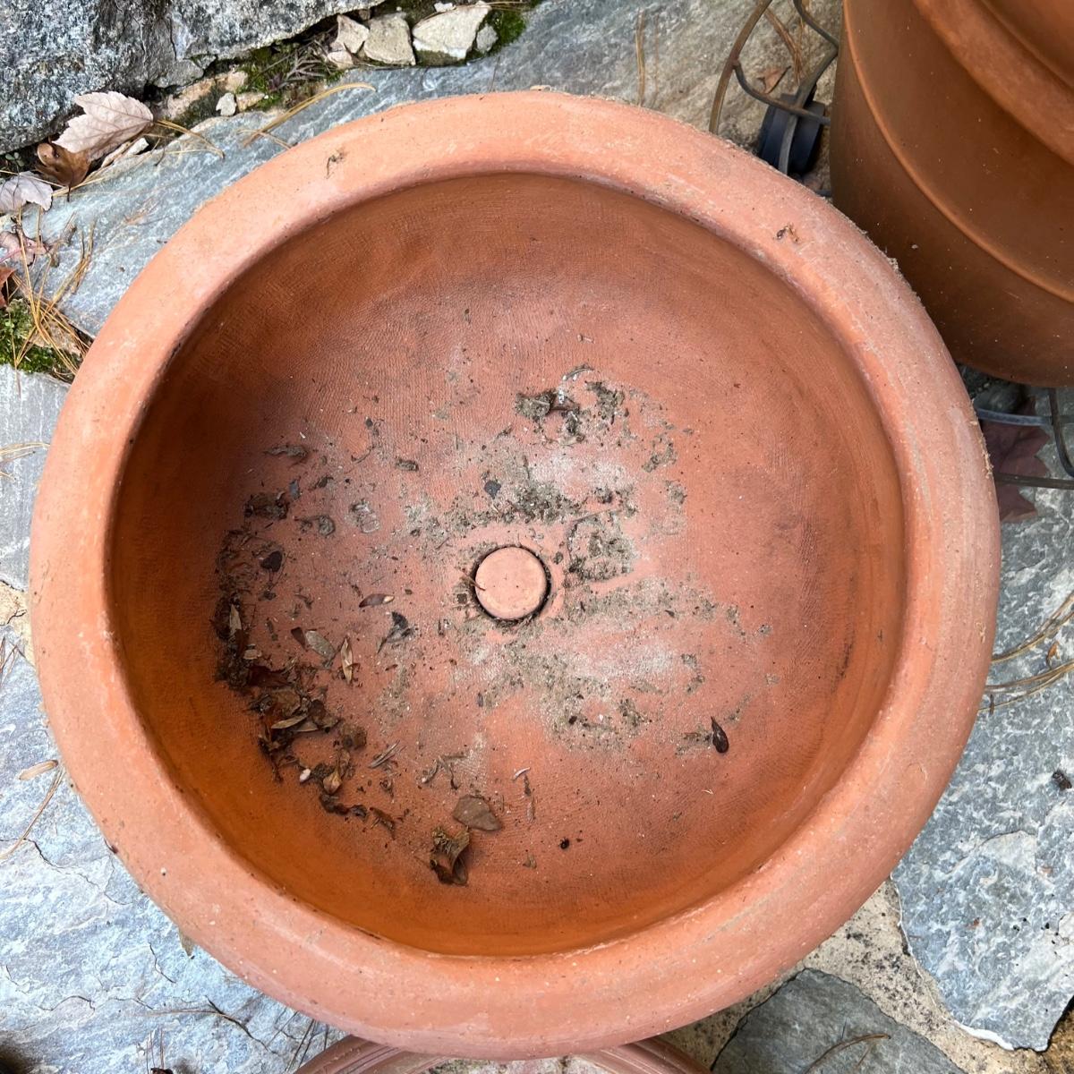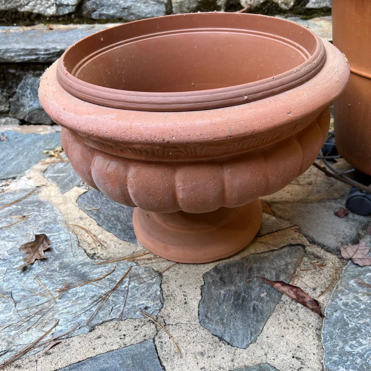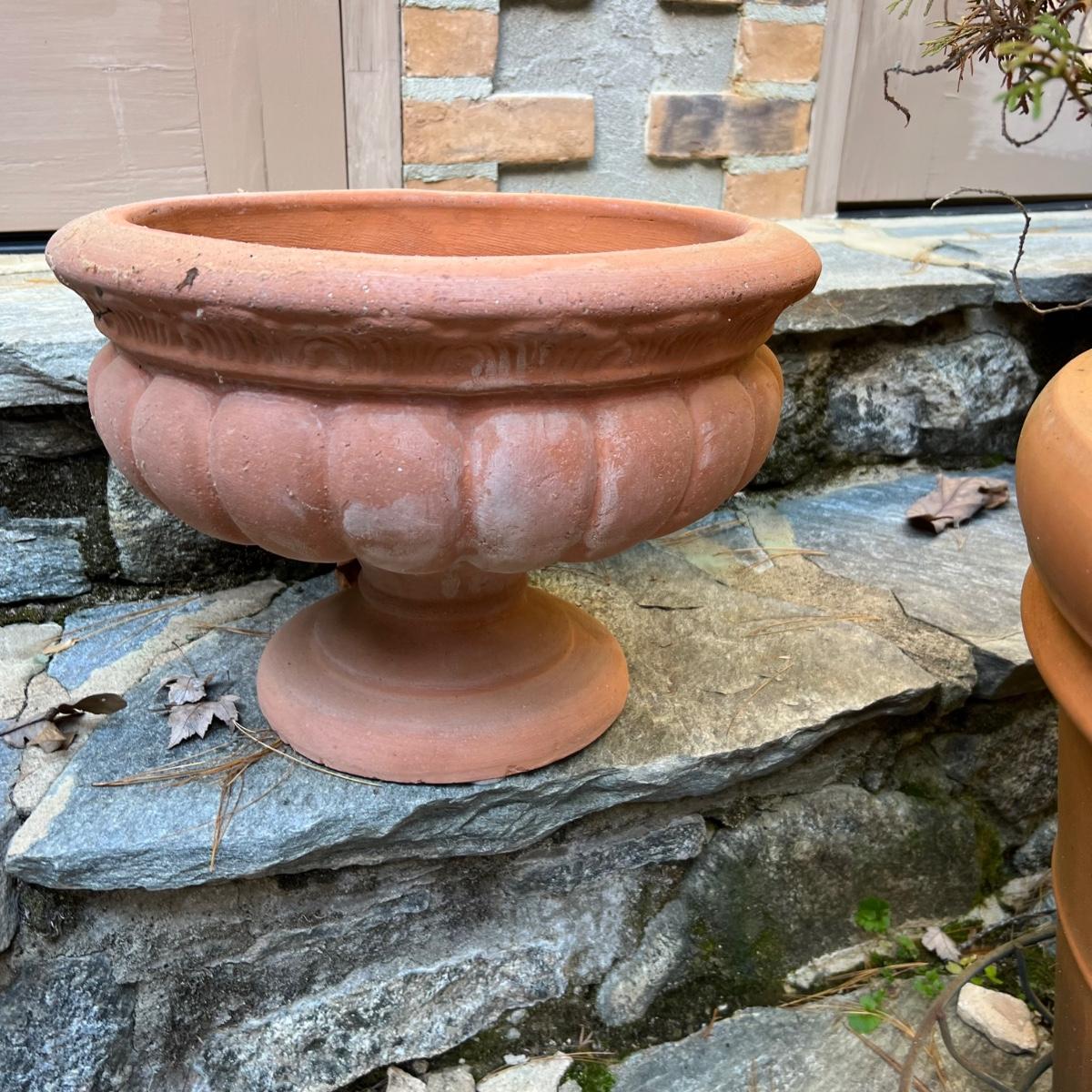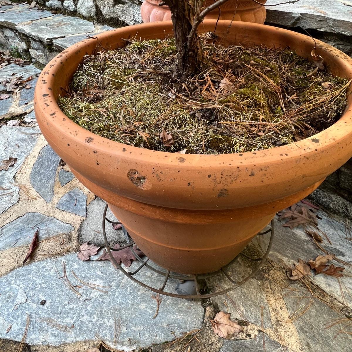 This evergreen Arborvitae plant, likely a Chinese Arborvitae, measures 62”H (including pot, this pot is 18”D). There is a minor chip near the rim, see image. The metal plant stand is included, it has plastic casters. A pair of terracotta pots along with a terracotta pedestal pot with plastic insert are also included.