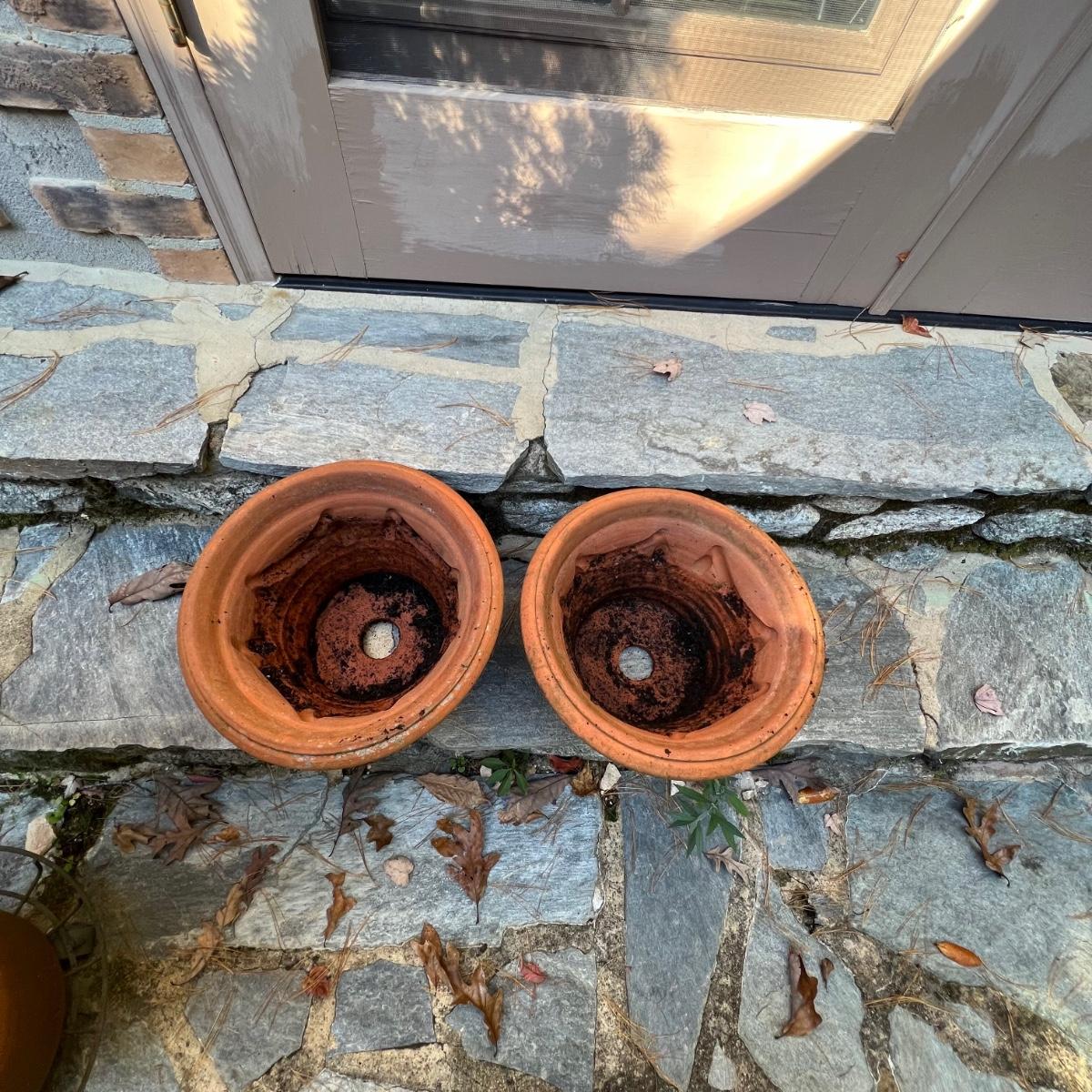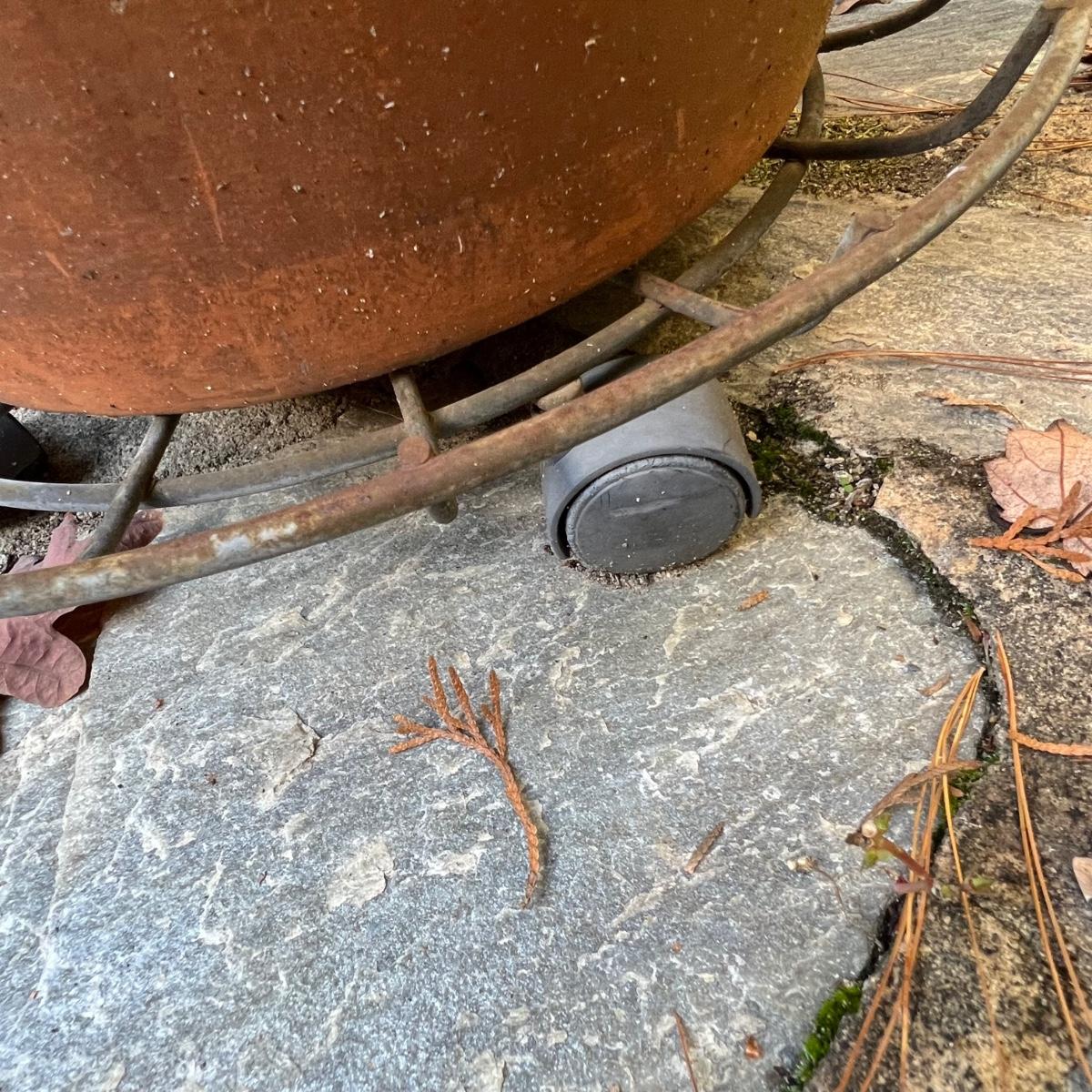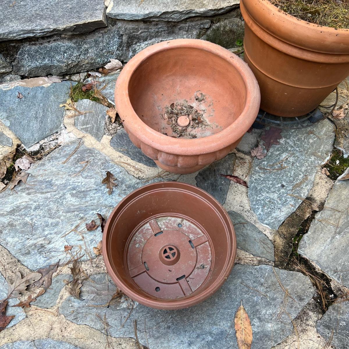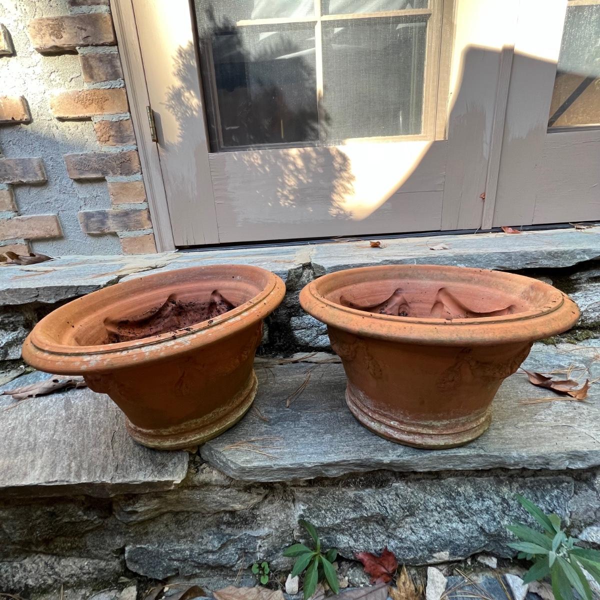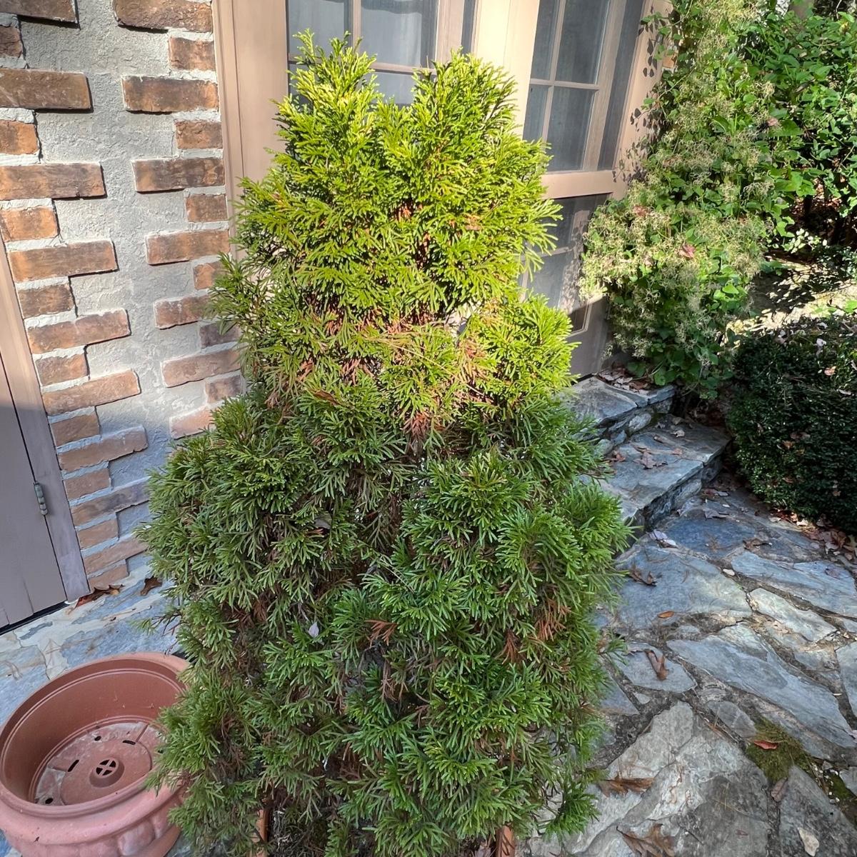This evergreen Arborvitae plant, likely a Chinese Arborvitae, measures 62”H (including pot, this pot is 18”D). There is a minor chip near the rim, see image. The metal plant stand is included, it has plastic casters. A pair of terracotta pots along with a terracotta pedestal pot with plastic insert are also included.