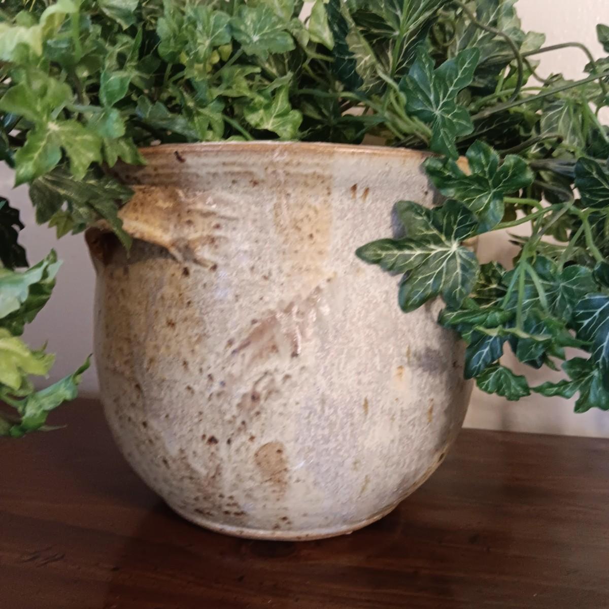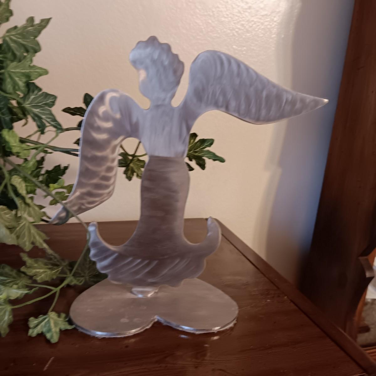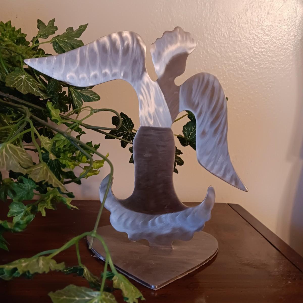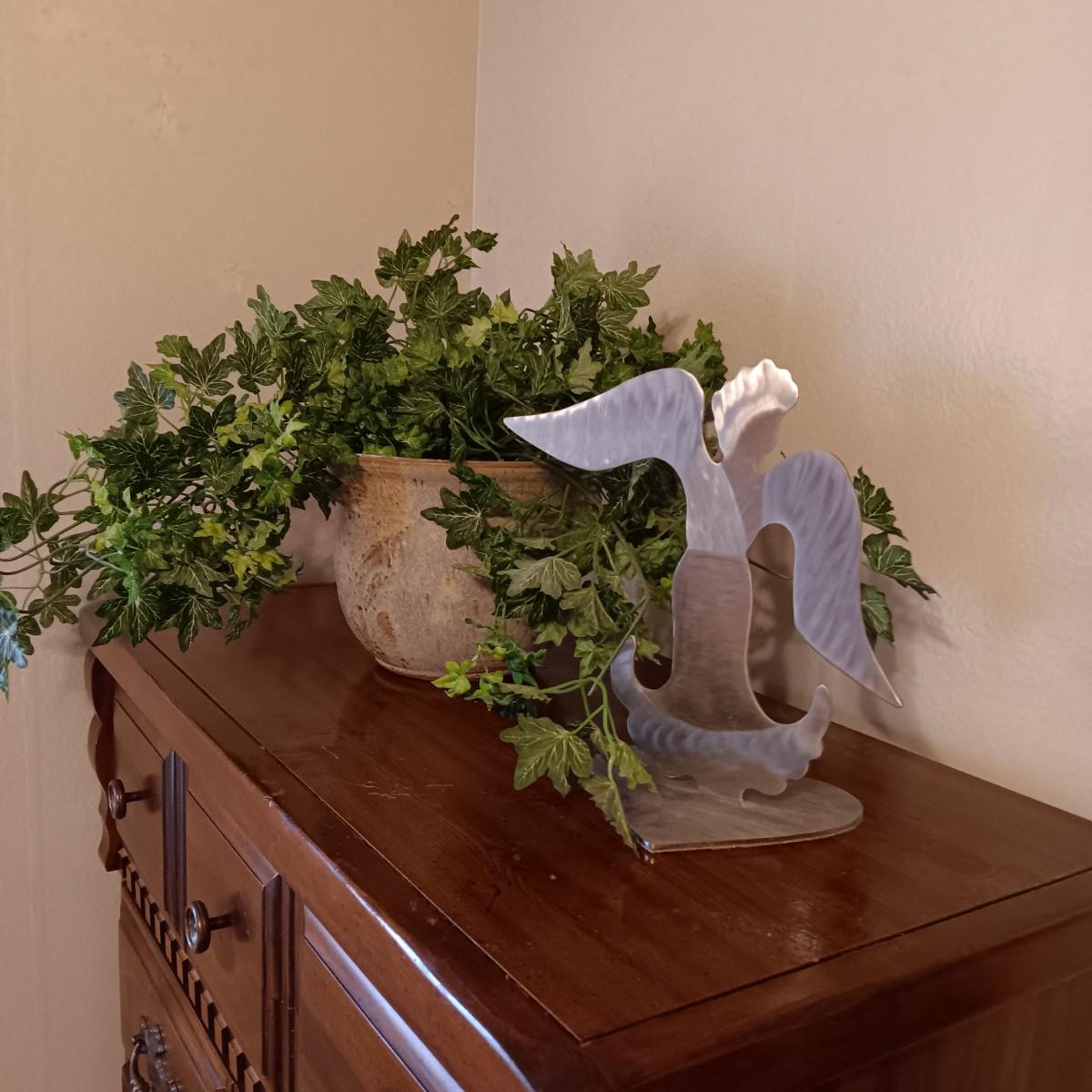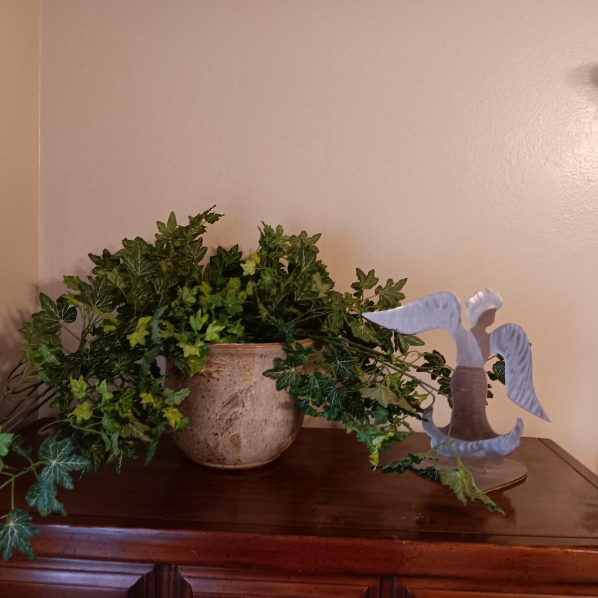 POTTED FAUX PLANT AND A STEEL ANGEL