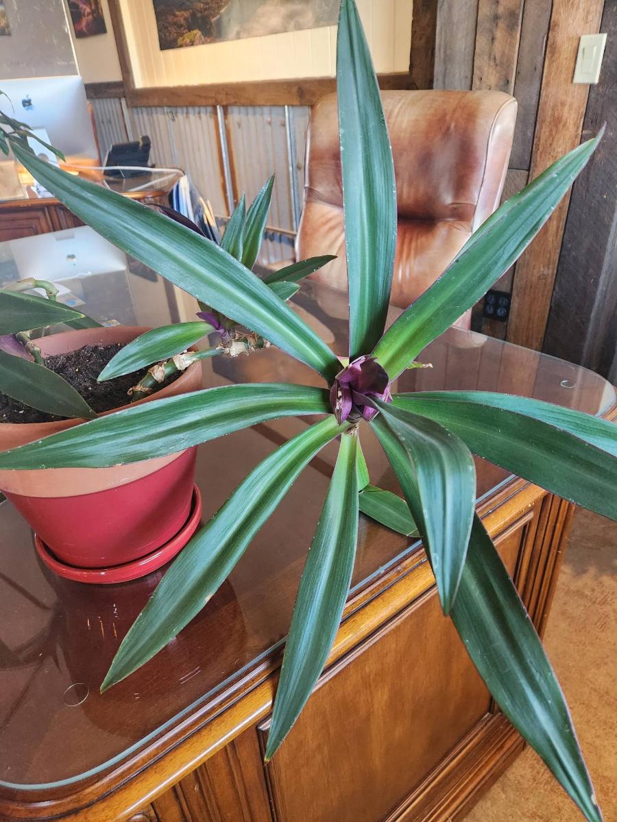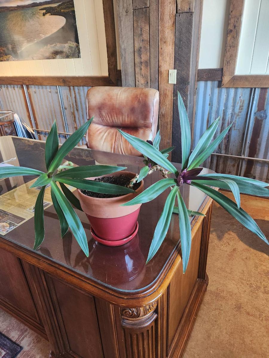 A potted green foliage plant featuring long, pointed leaves with a glossy finish. The leaves have a slight purple hue near the base, adding contrast. The plant is housed in a red plastic planter and appears well-established, suitable for indoor decor. Displayed on a polished wooden desk within a rustic-style interior.