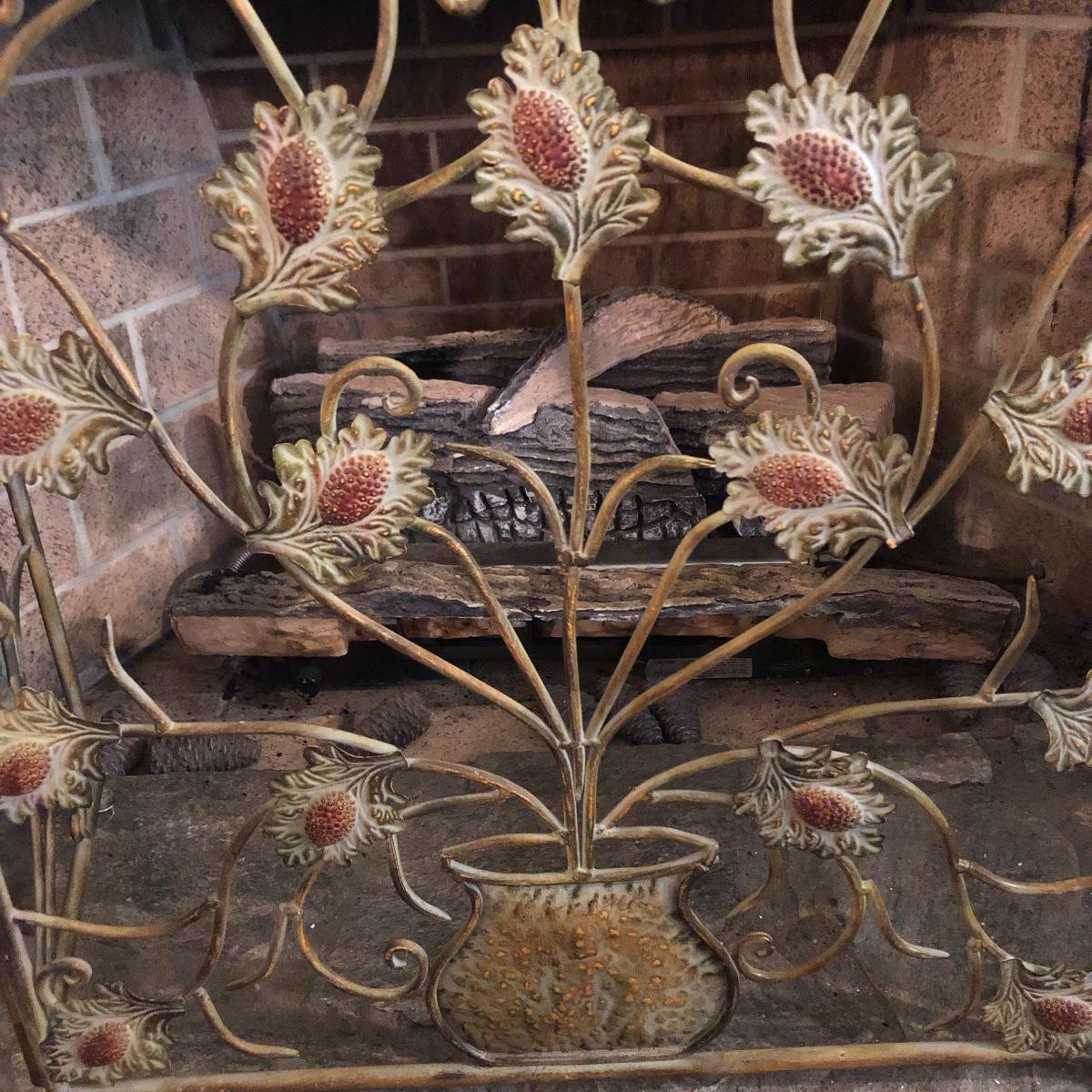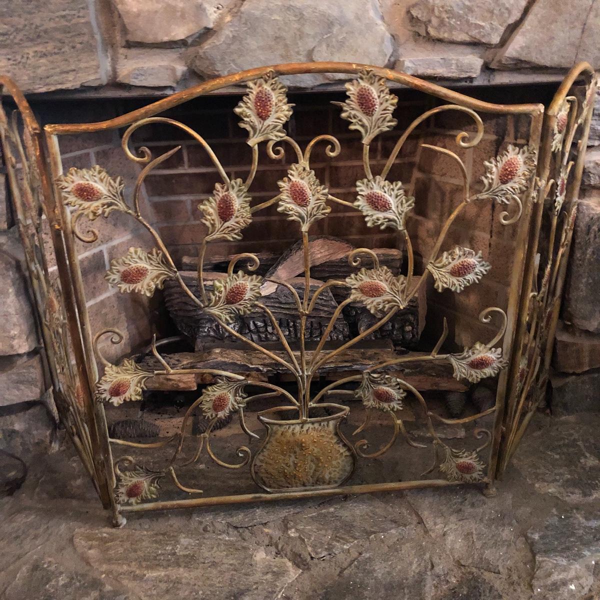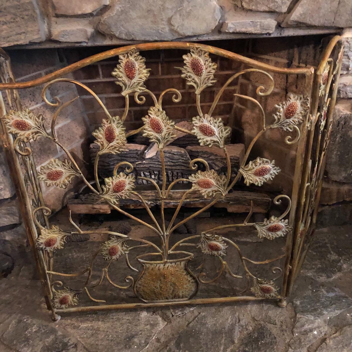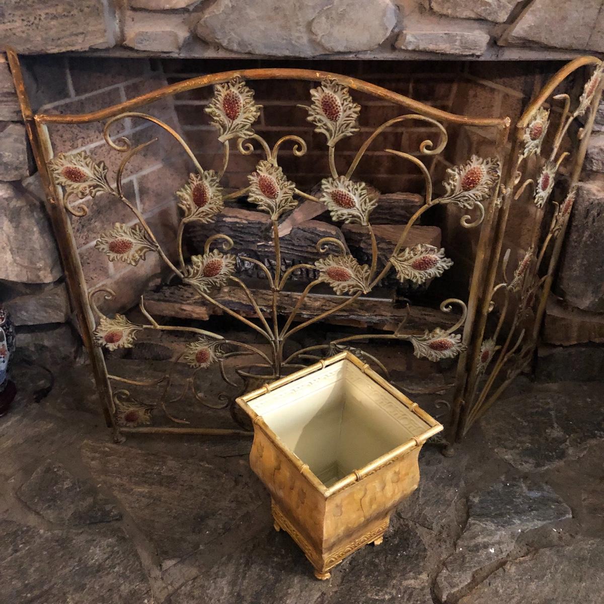 The fireplace screen is metal and the sides fold in. The front panel measures 25” with both of the sides being 12” wide and it is almost 28” tall. The square planter is 10.5” tall and it is metal. Local pick up only.
