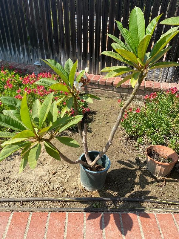 Potted plumeria plant. White and yellow flowers. About 3’ to 4’ tall.