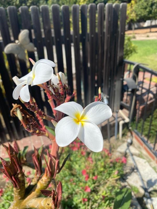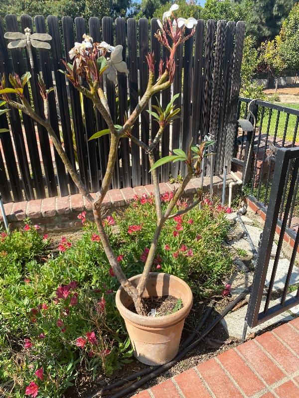 Potted Plumeria plant. Between 4’ and 5’ tall. White with yellow flowers