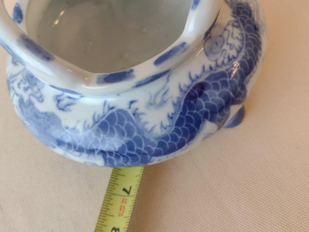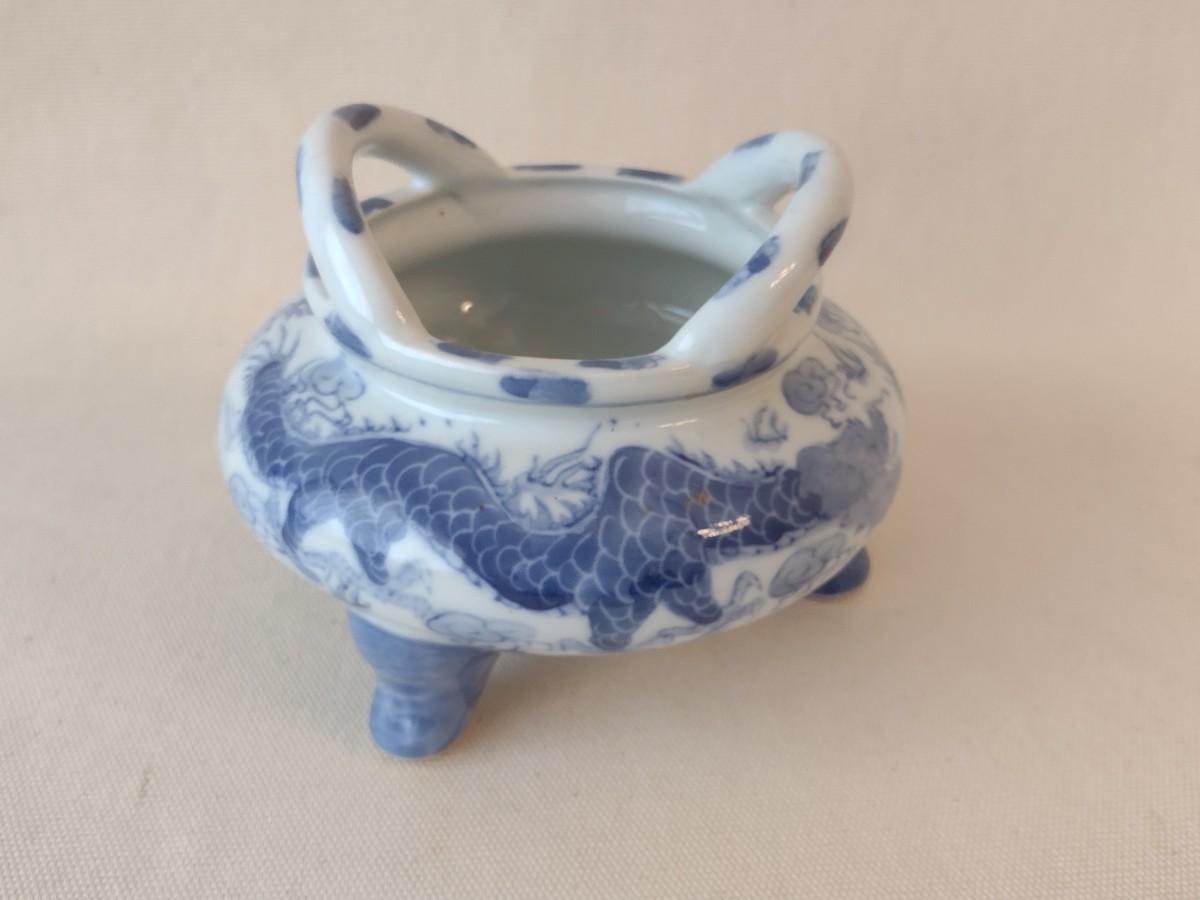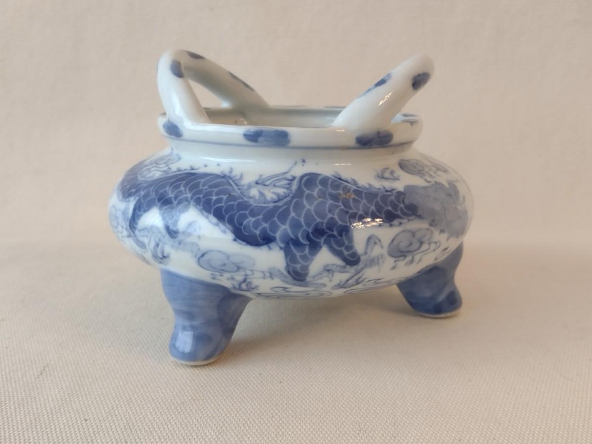 Mid Century Blue and White Pottery Two Dragons and Pearl Incense Footed Burner