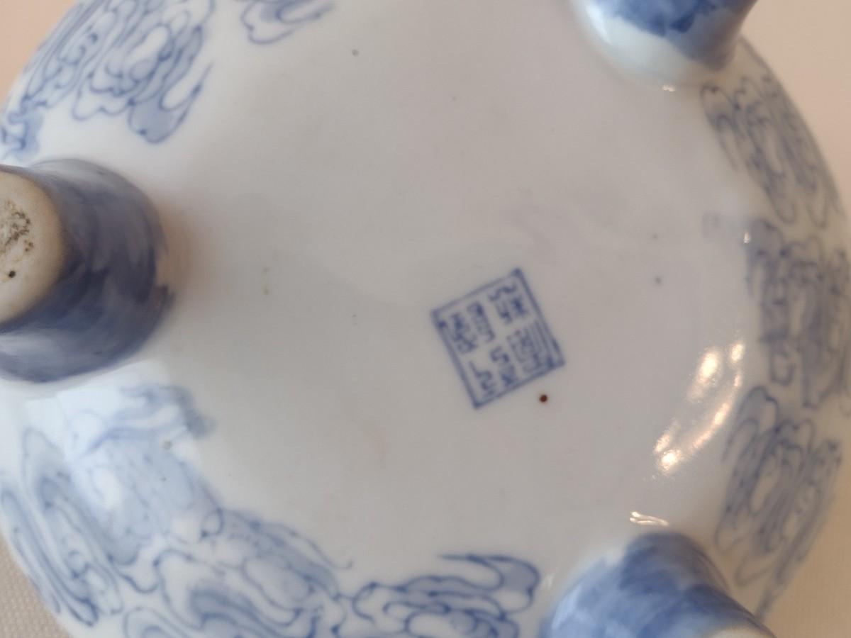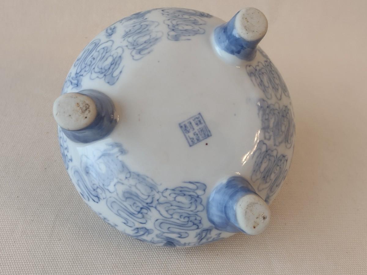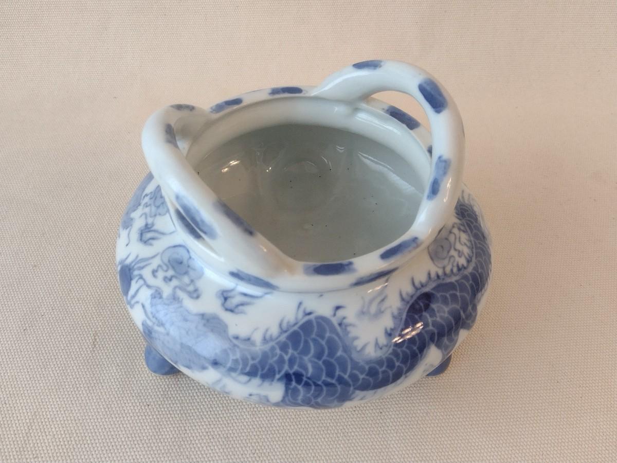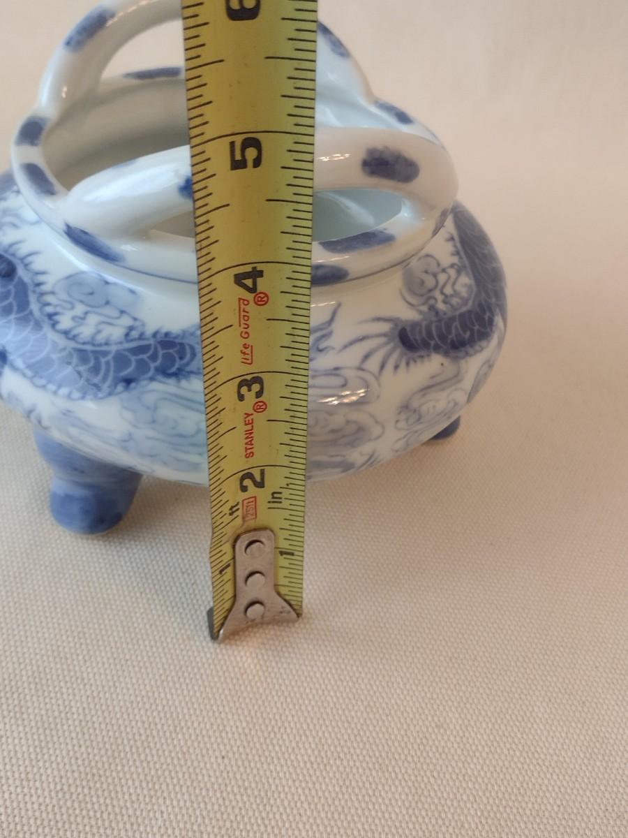 Mid Century Blue and White Pottery Two Dragons and Pearl Incense Footed Burner