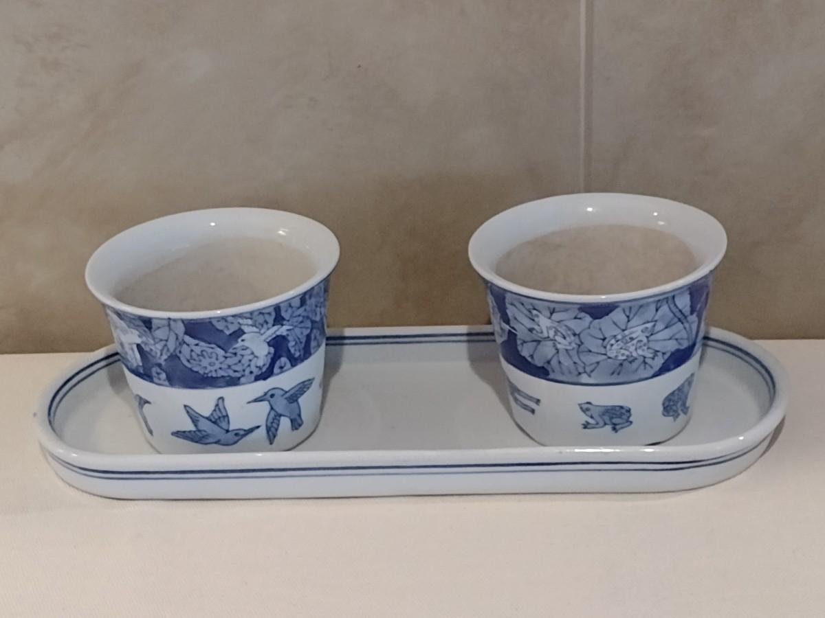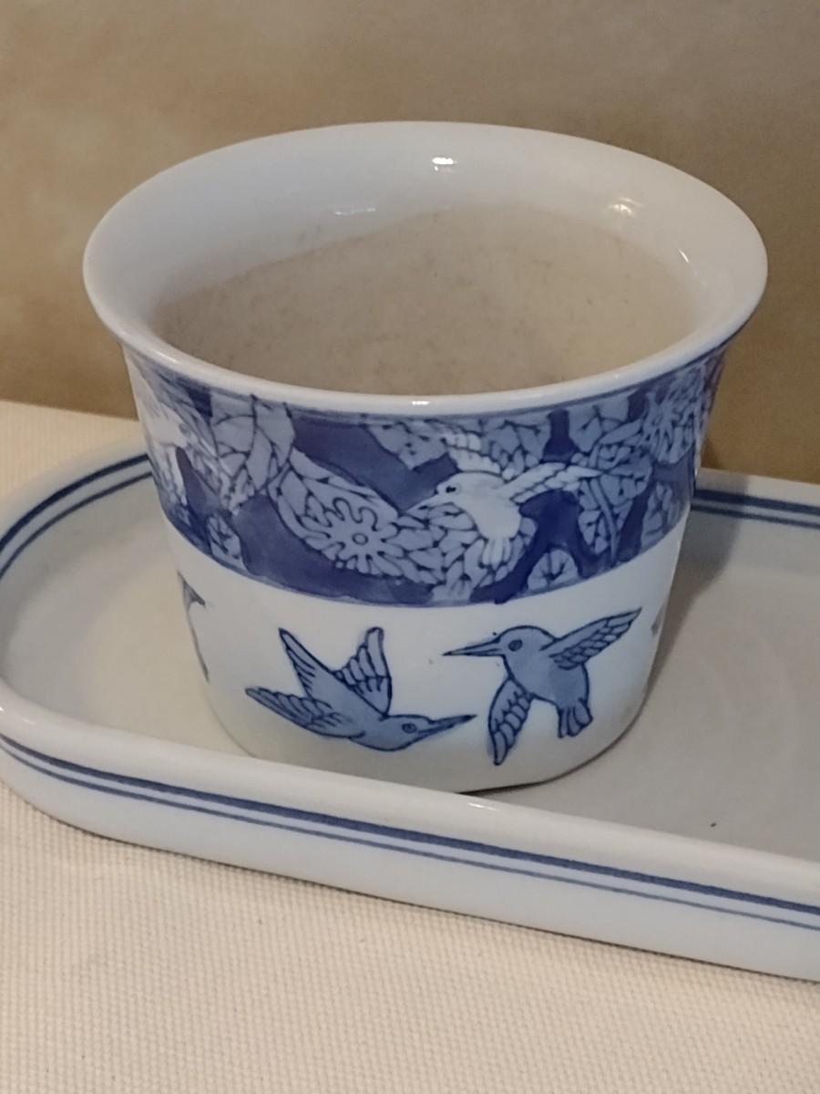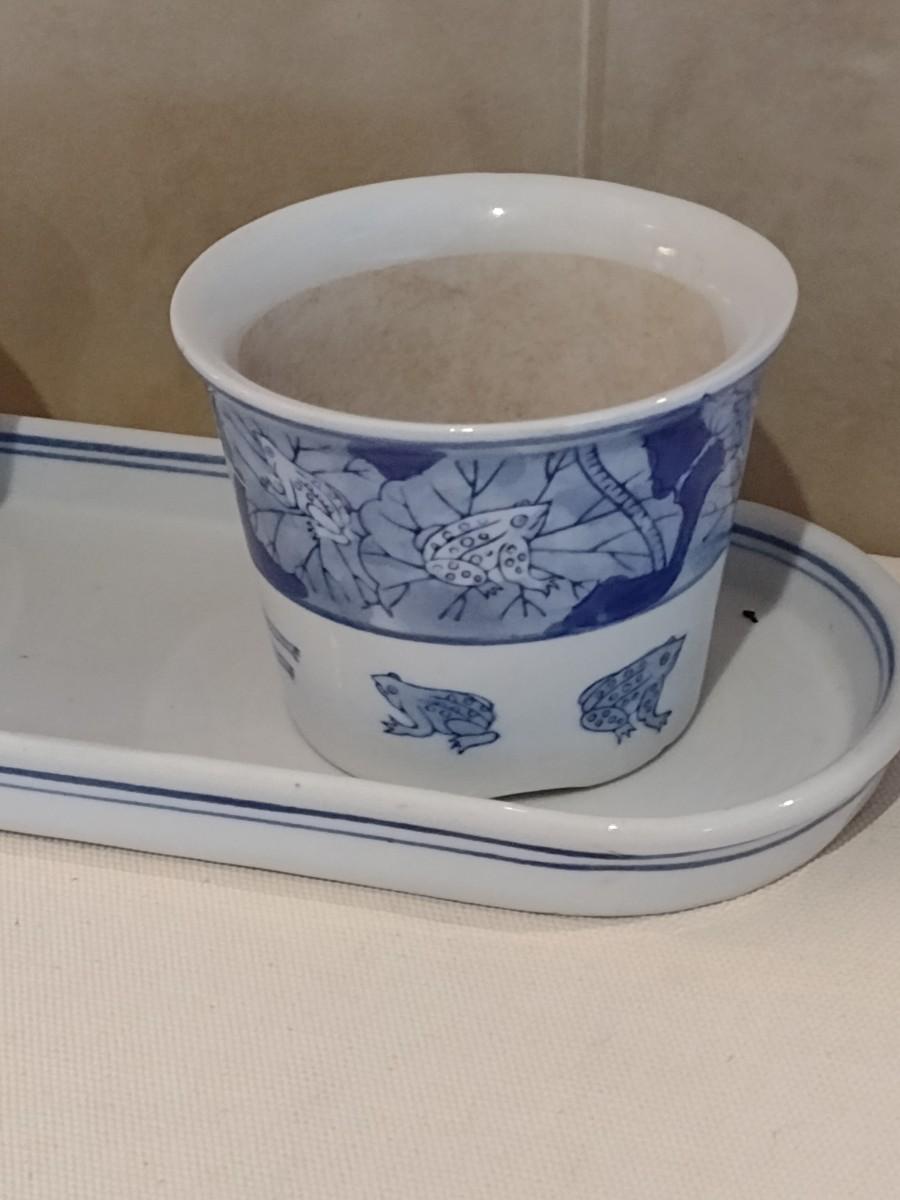 Blue and White Pottery Frog and Hummingbird Planter Pots with Tray